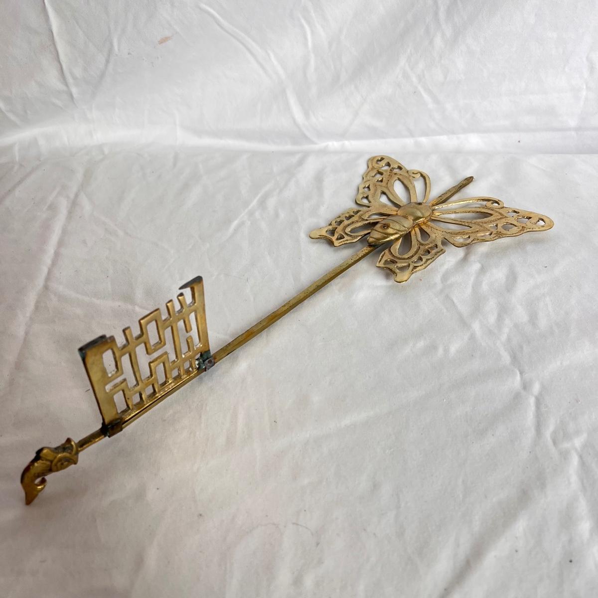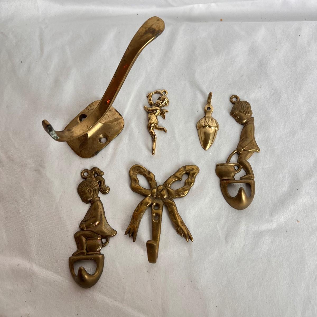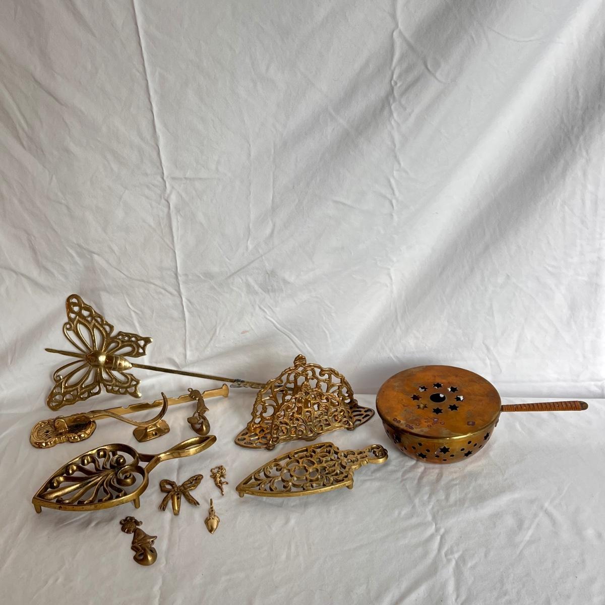 This lot includes six brass wall hooks (made in Italy, Taiwan, Japan, and India), brass incense and resin burner stamped with Christian Wagner Germany, one brass wall bracket, two iron footed trivets, one Korean brass butterfly, and one brass napkin holder. The brass acorn is the smallest wall hook, measuring .5” x 1.5”. The largest item is the brass butterfly measuring 6.5” x 2.5” x 15”H. Shipping available.