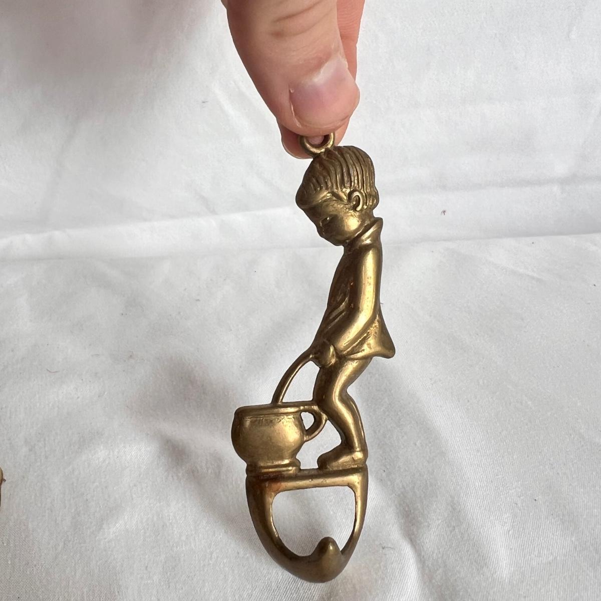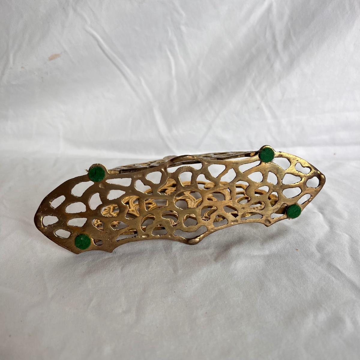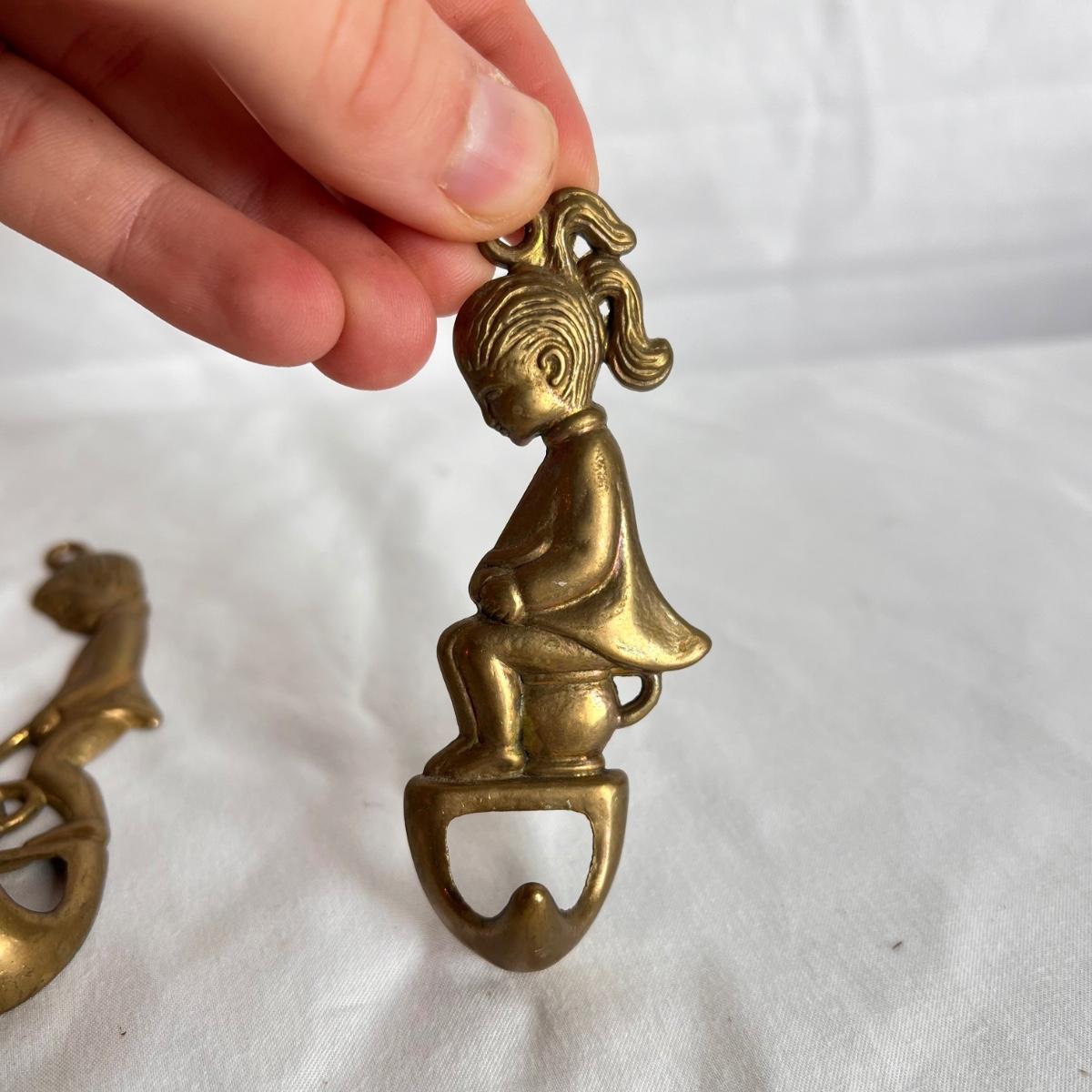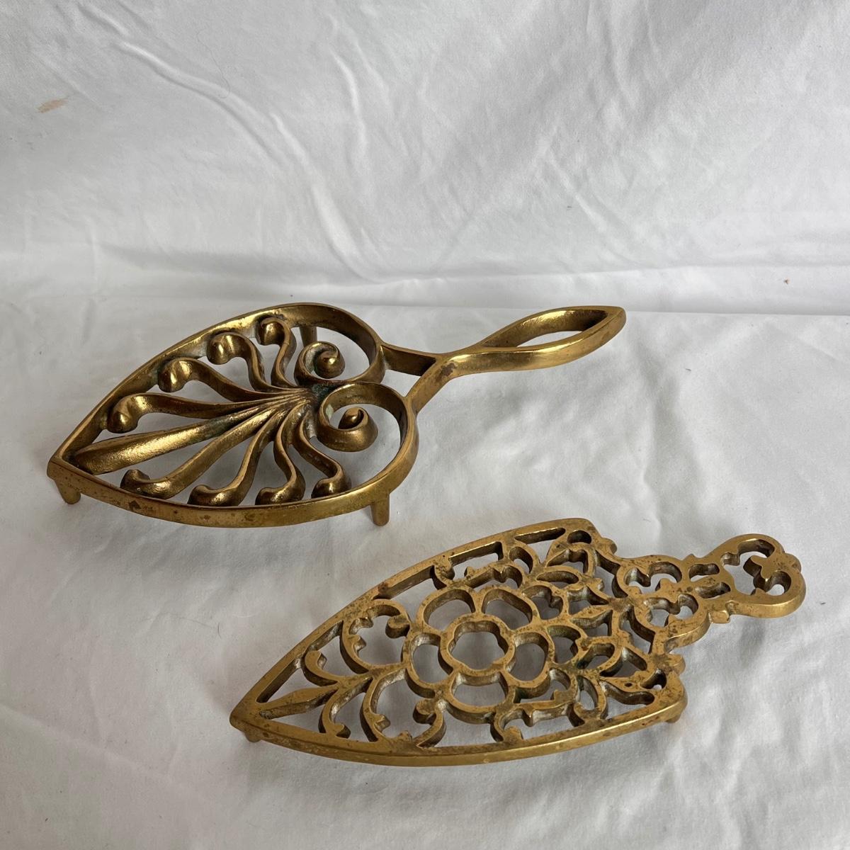 This lot includes six brass wall hooks (made in Italy, Taiwan, Japan, and India), brass incense and resin burner stamped with Christian Wagner Germany, one brass wall bracket, two iron footed trivets, one Korean brass butterfly, and one brass napkin holder. The brass acorn is the smallest wall hook, measuring .5” x 1.5”. The largest item is the brass butterfly measuring 6.5” x 2.5” x 15”H. Shipping available.