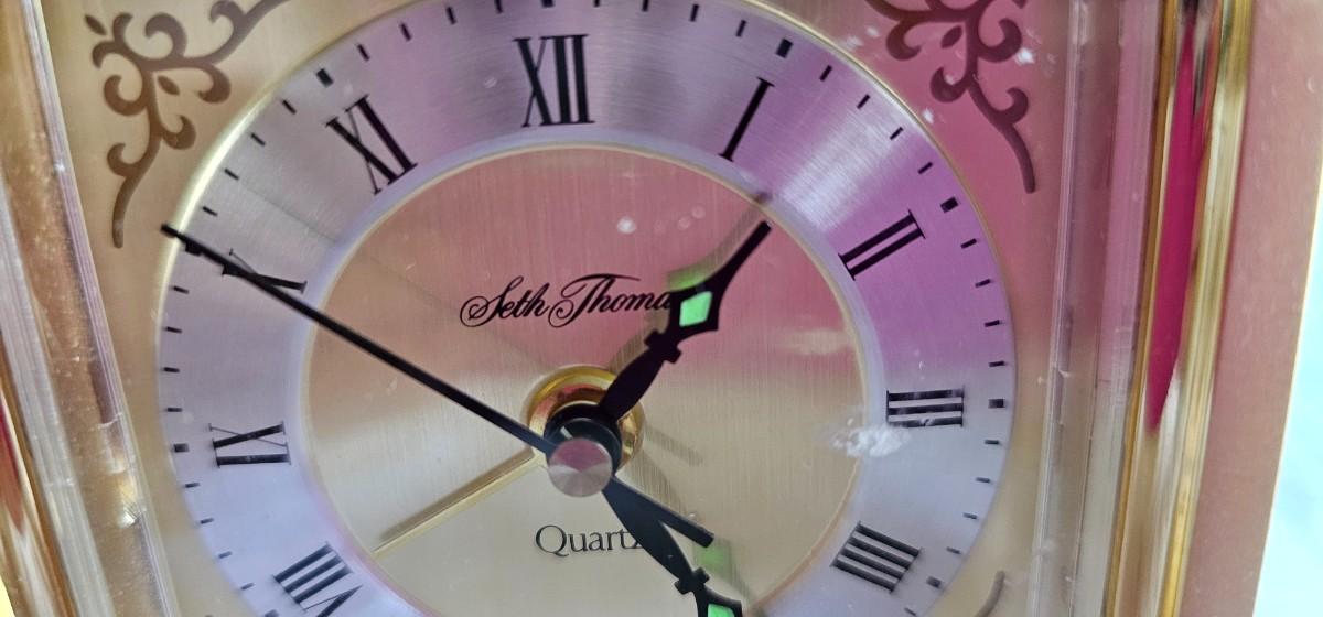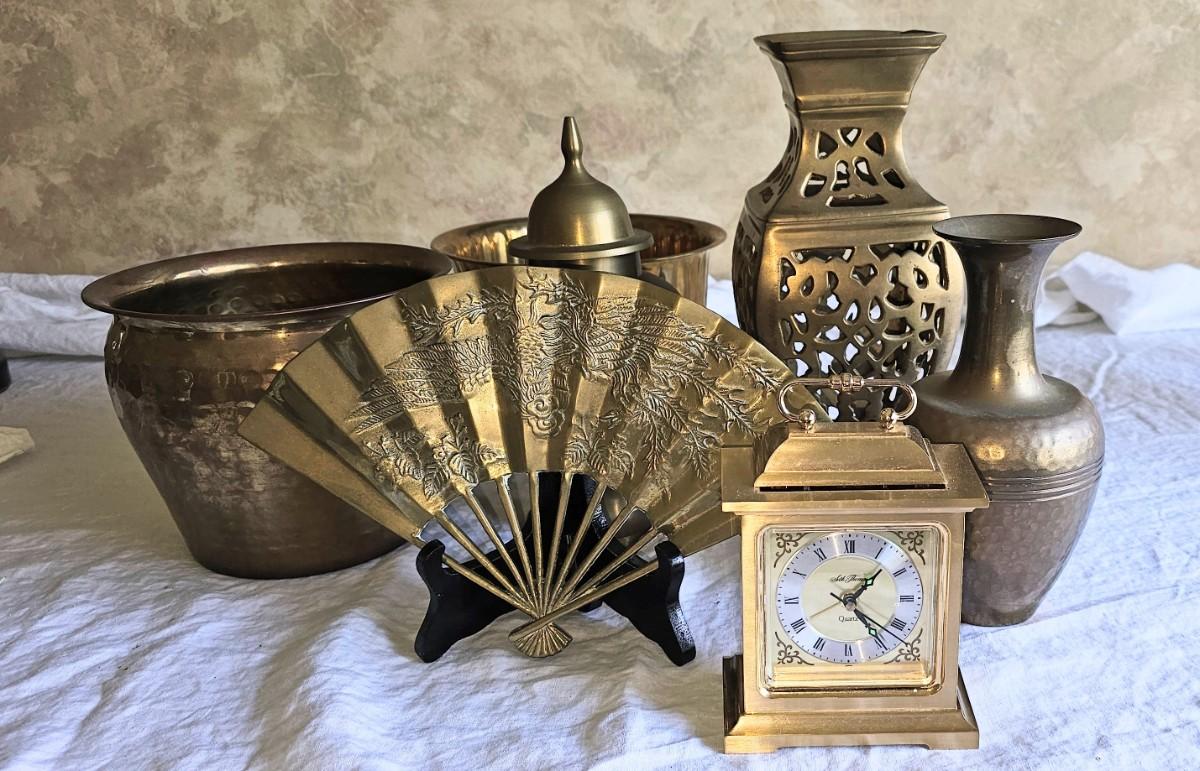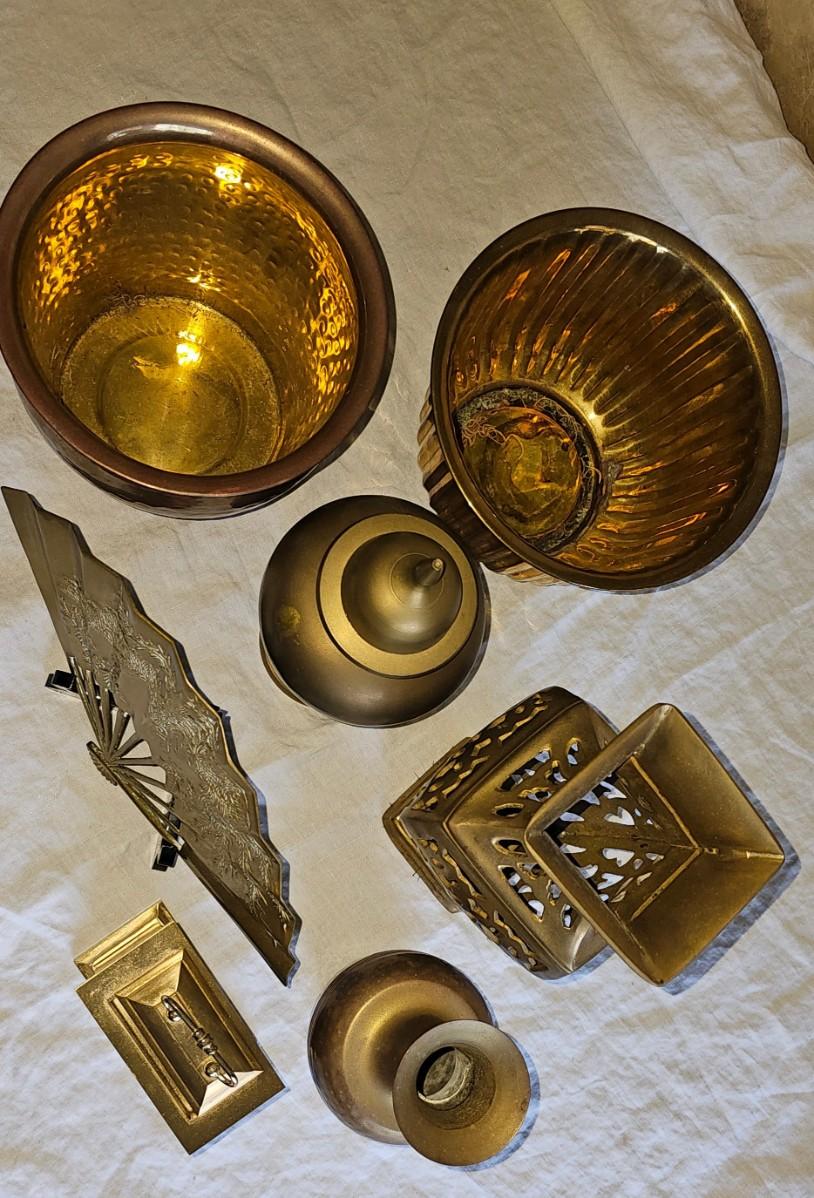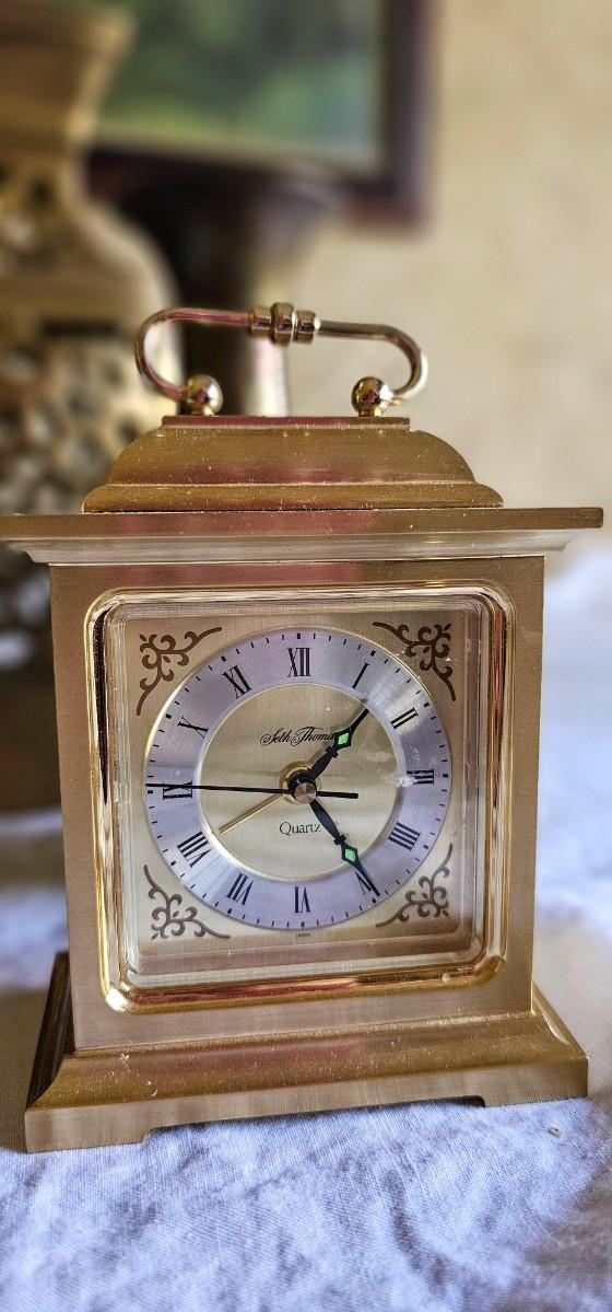 Collection of brass items Seth Thomas Rapture Solid Brass Quartz Carriage Alarm clock -- 6" tall and 4" wide.