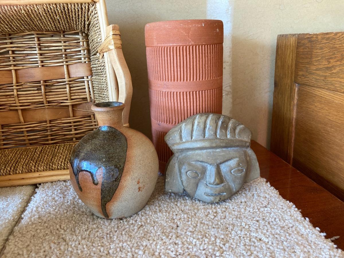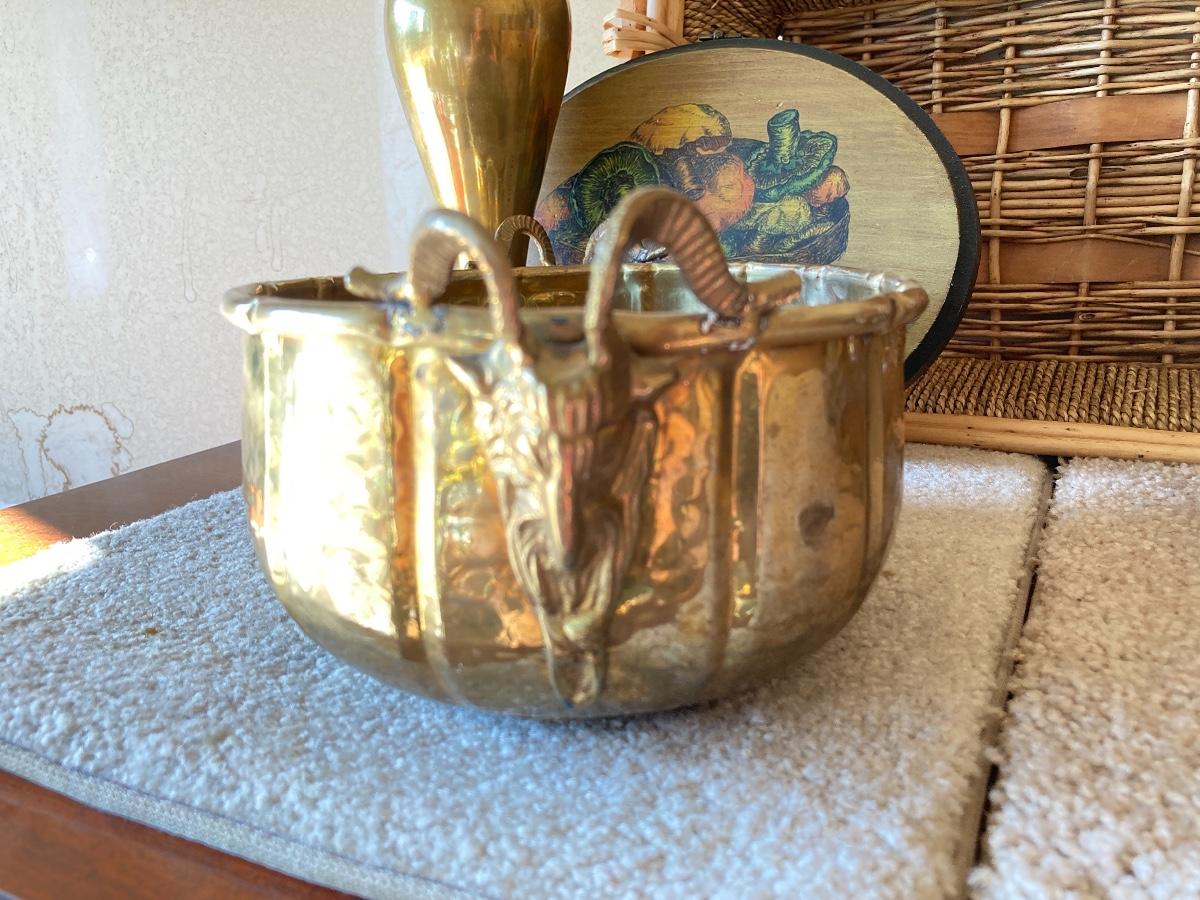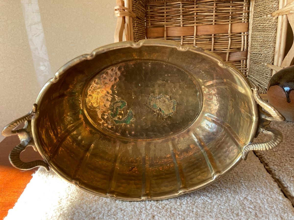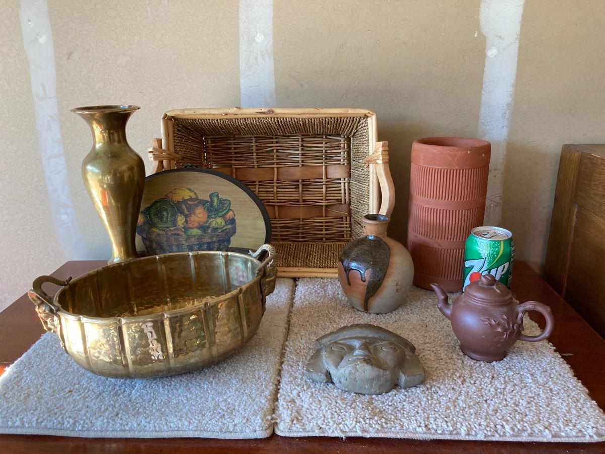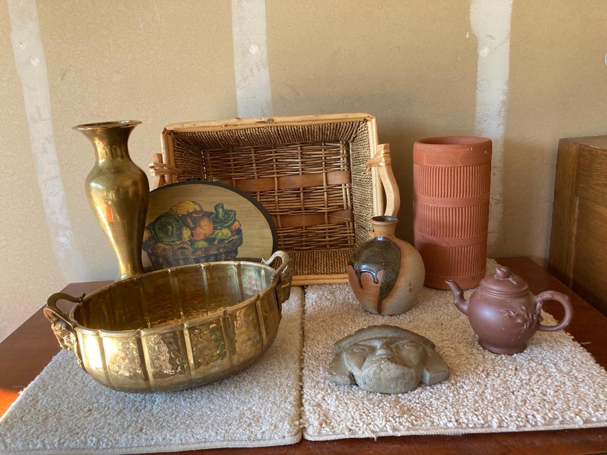 #414 Collection of Brass, Pottery, Woven Basket, Etc