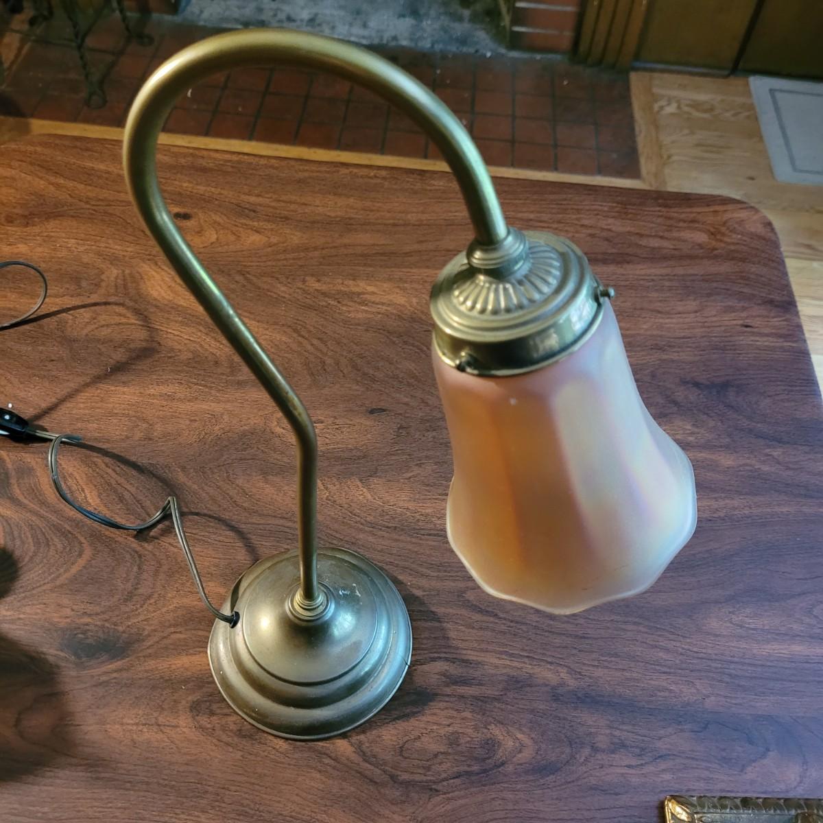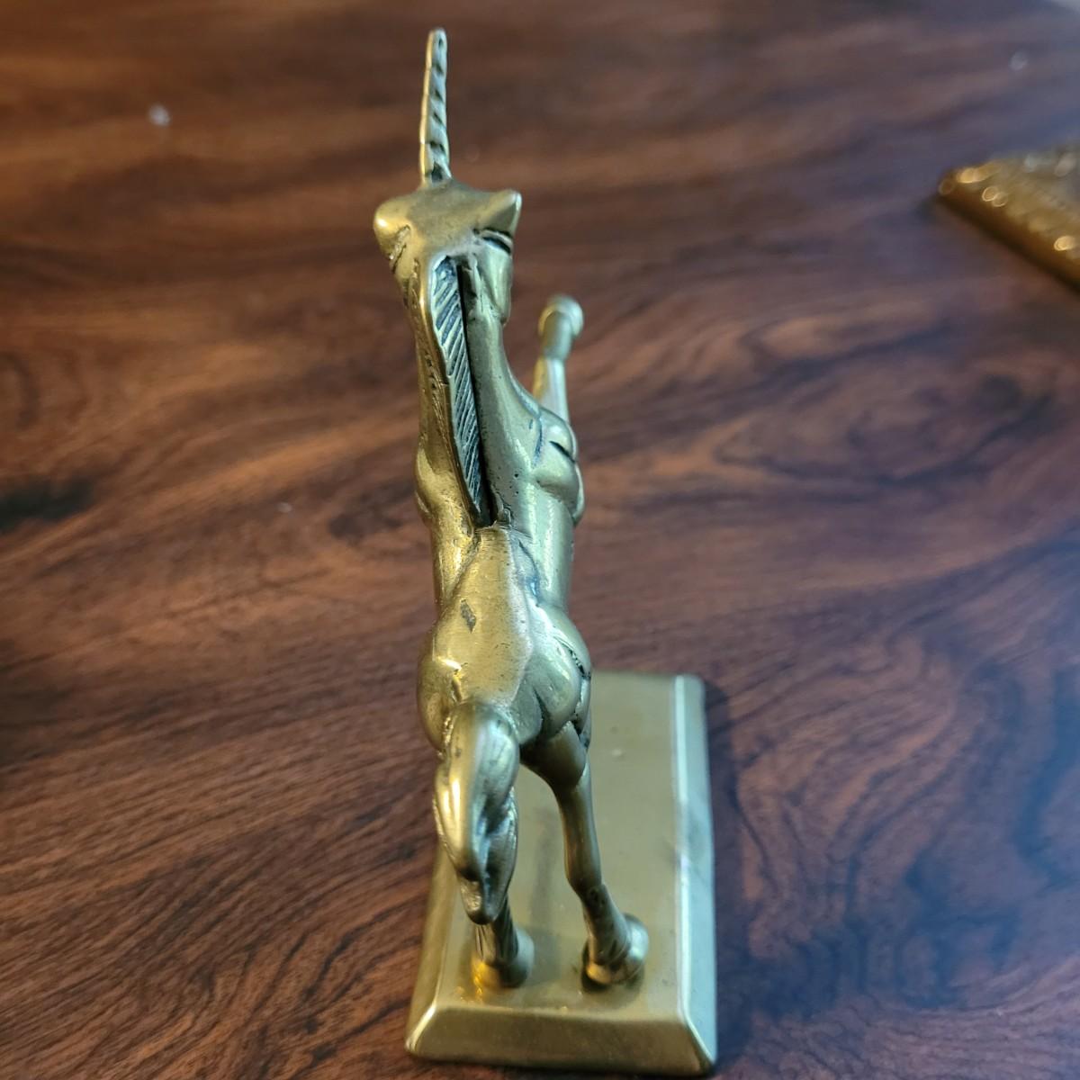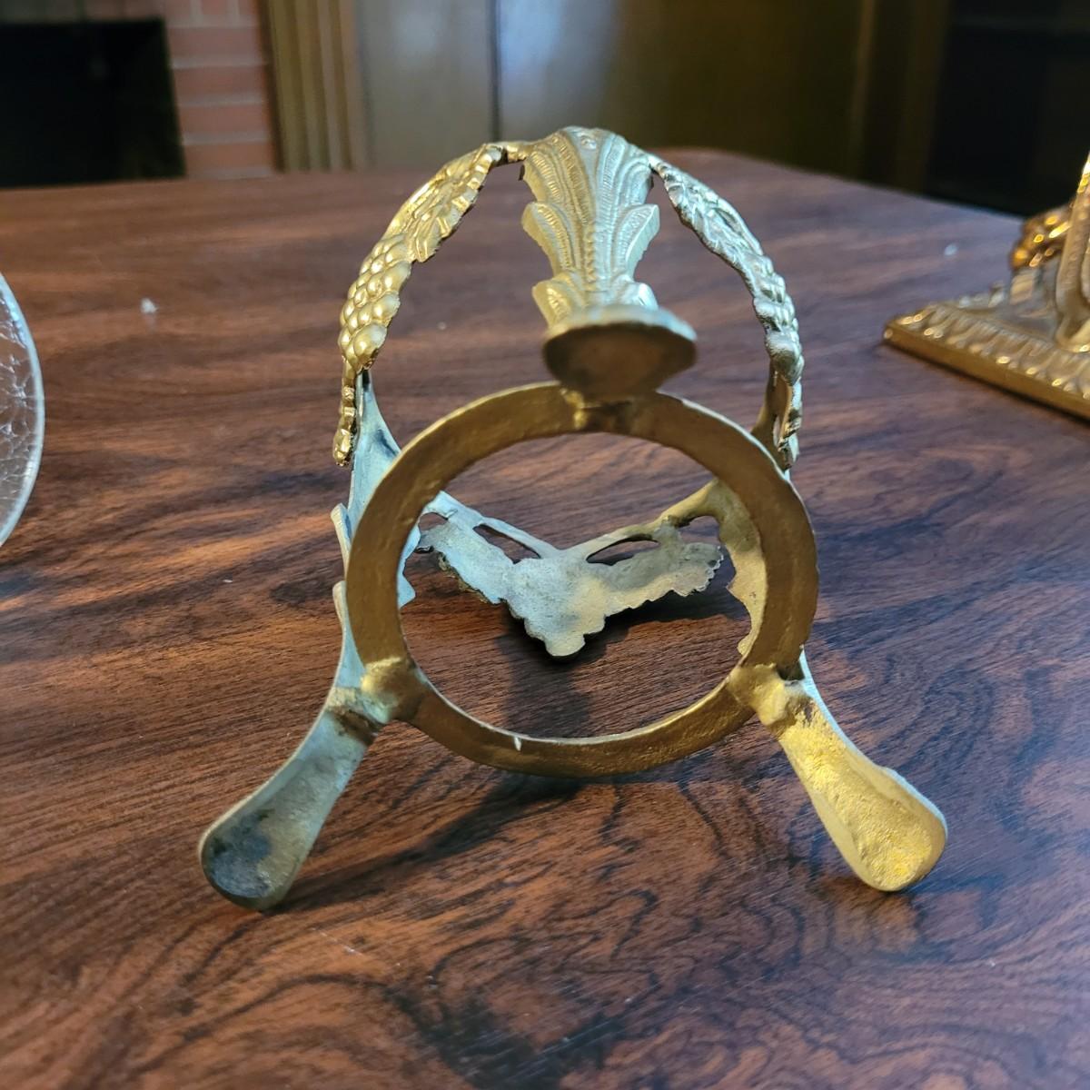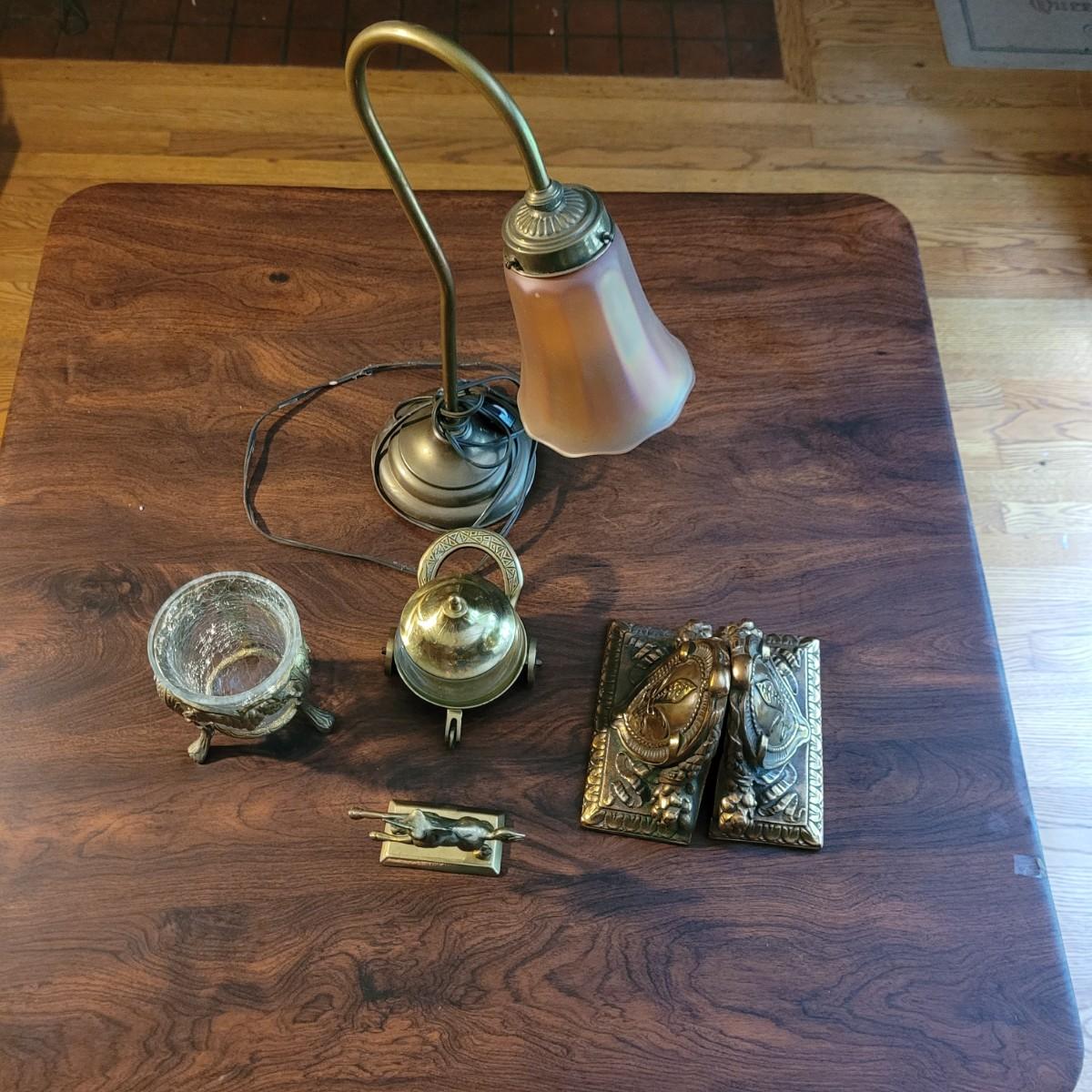 Collection of decor with brass style and coloring. Can not verify if items are real brass. Decor includes glass floral shade lamp that works when plugged in. Lamp in good condition with small crack at base and where shade attaches to body. Other items included are a small unicorn, book ends that are heavy, glass vase with stand, and small bowl on rolling cart (made in Israel). Lamp measures approximately 18.5"H at tallest point. Shipping available.