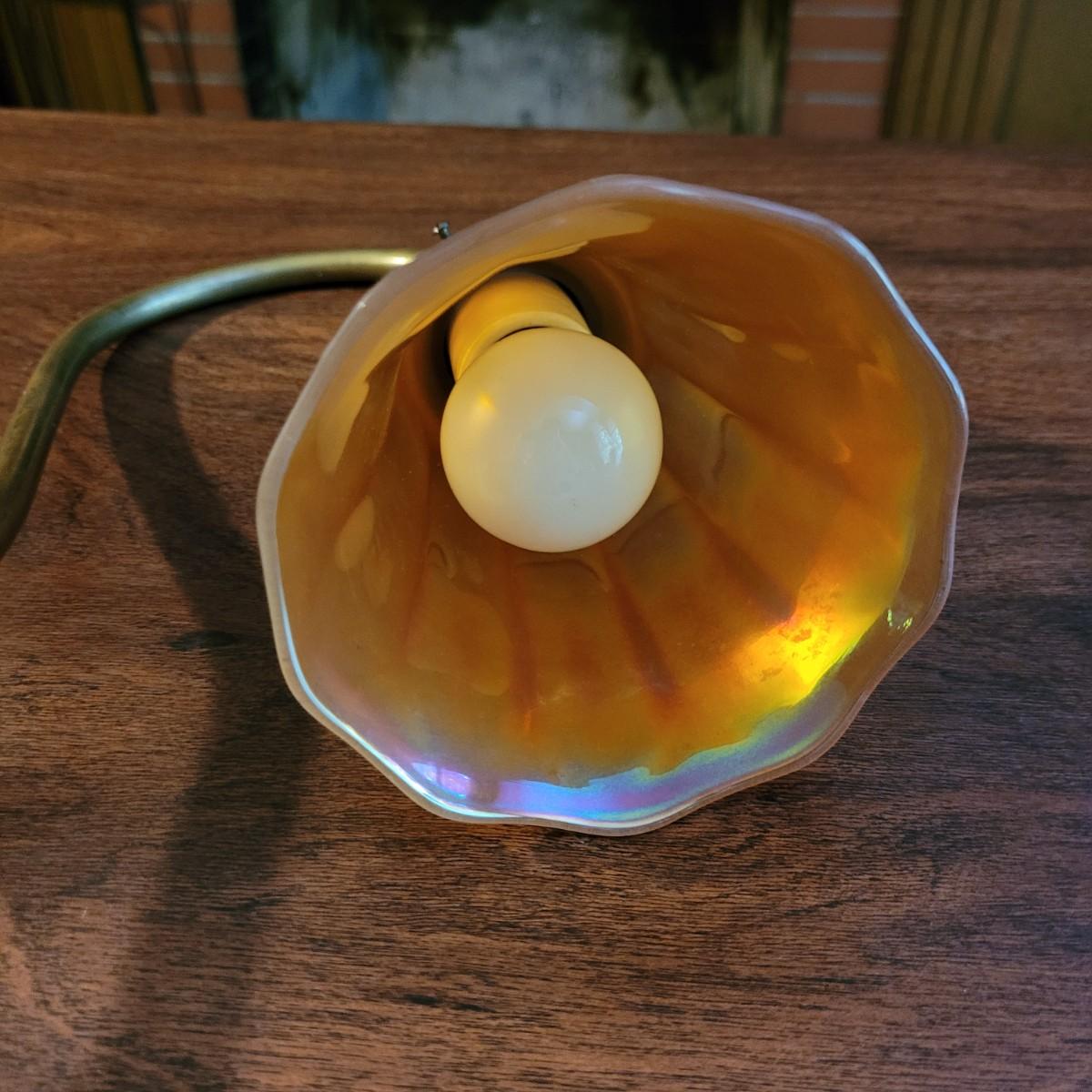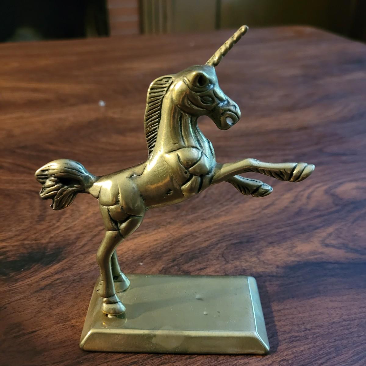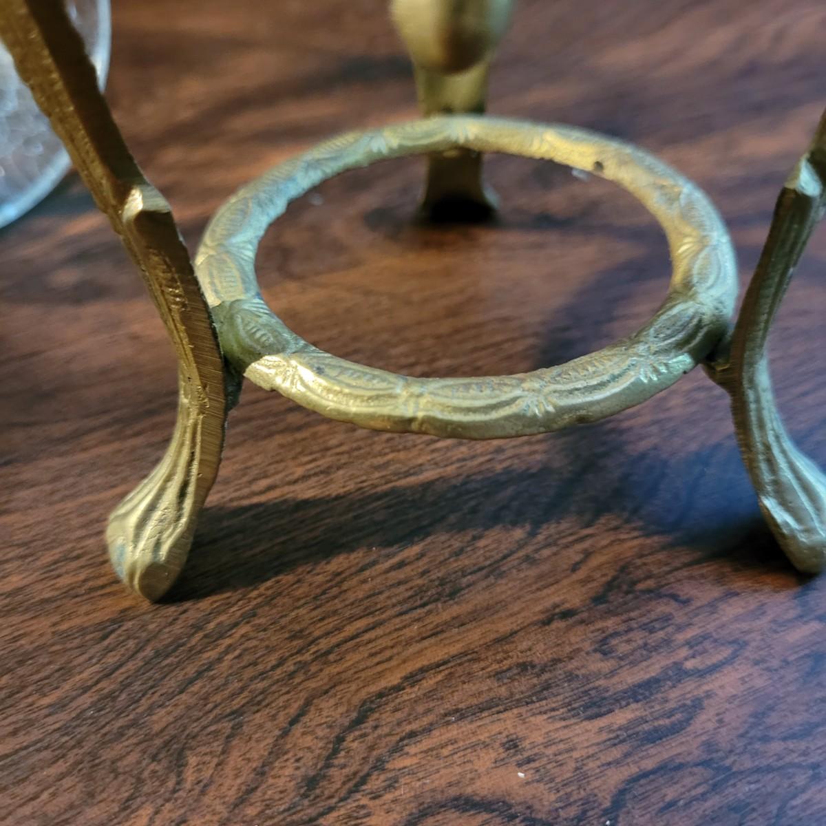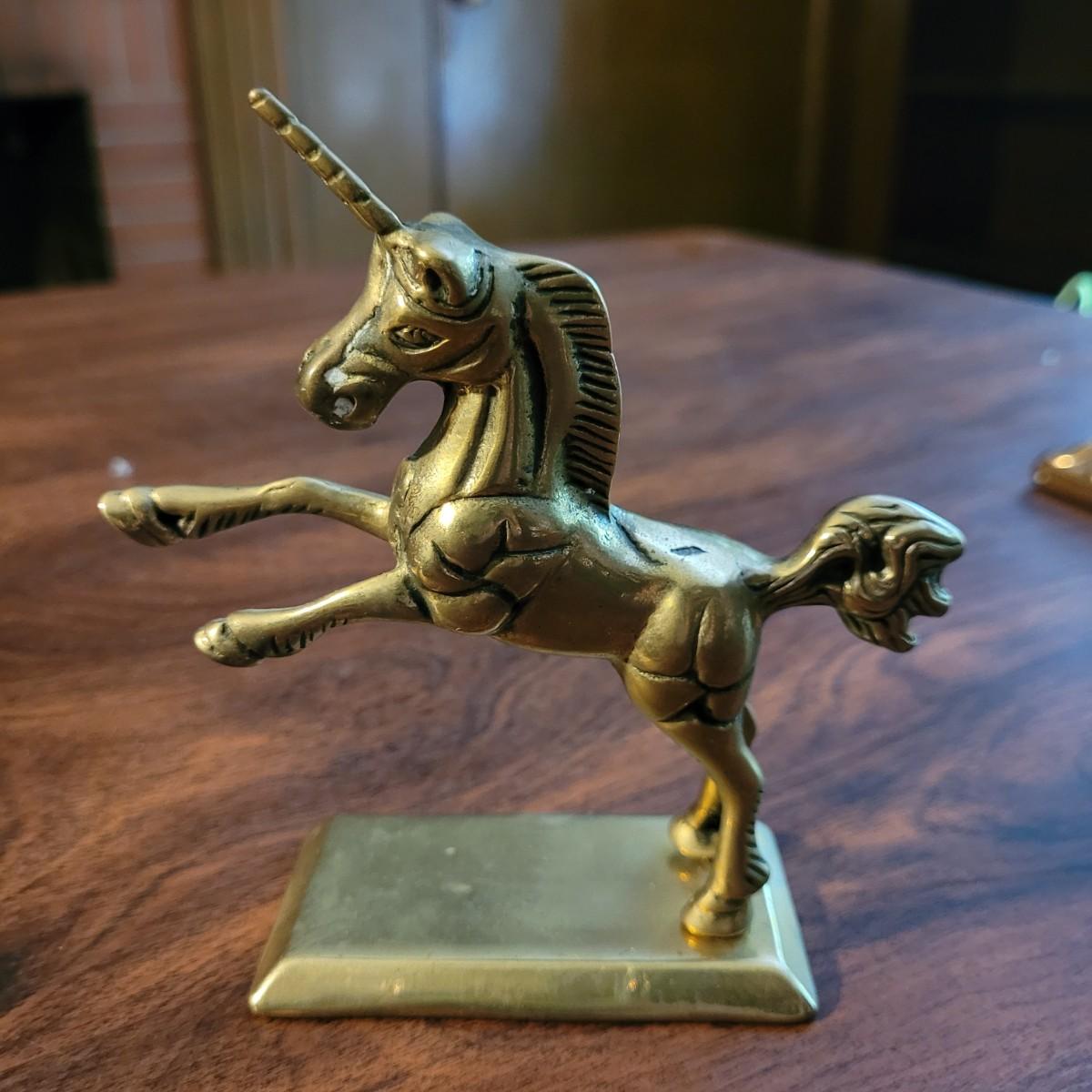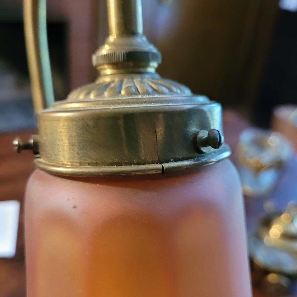 Collection of decor with brass style and coloring. Can not verify if items are real brass. Decor includes glass floral shade lamp that works when plugged in. Lamp in good condition with small crack at base and where shade attaches to body. Other items included are a small unicorn, book ends that are heavy, glass vase with stand, and small bowl on rolling cart (made in Israel). Lamp measures approximately 18.5"H at tallest point. Shipping available.