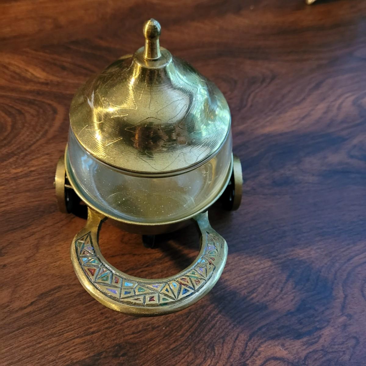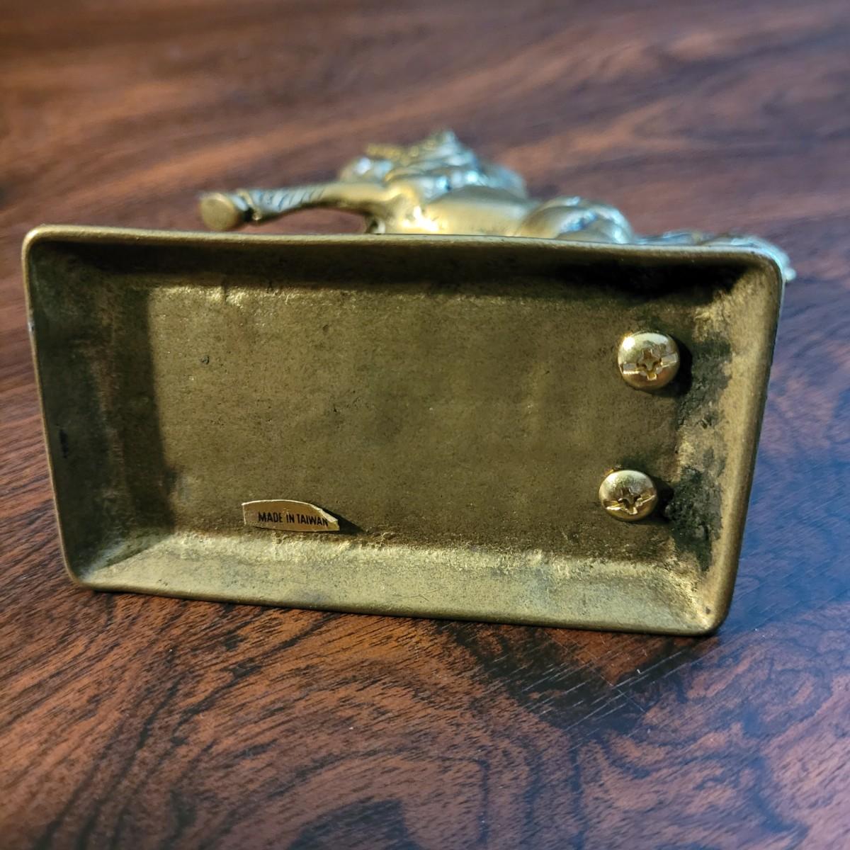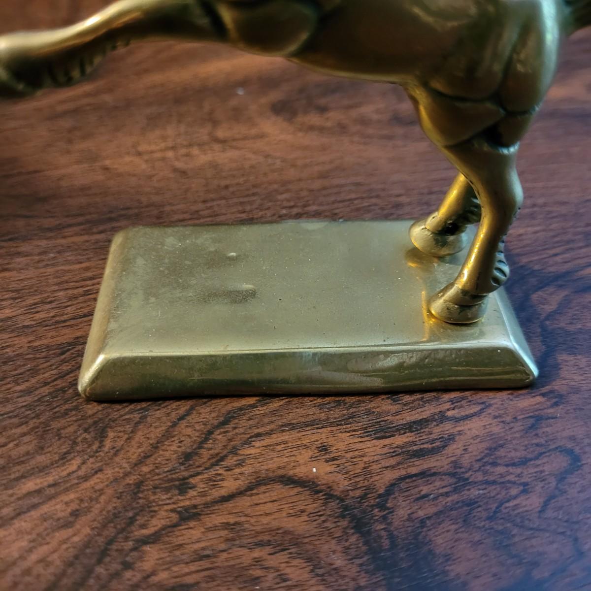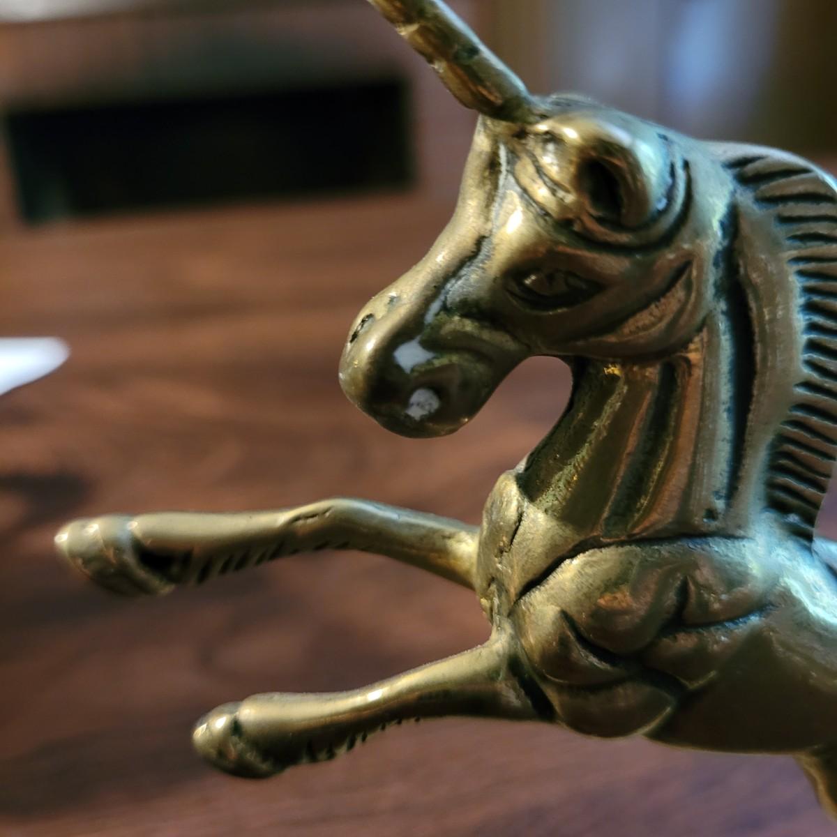 Collection of decor with brass style and coloring. Can not verify if items are real brass. Decor includes glass floral shade lamp that works when plugged in. Lamp in good condition with small crack at base and where shade attaches to body. Other items included are a small unicorn, book ends that are heavy, glass vase with stand, and small bowl on rolling cart (made in Israel). Lamp measures approximately 18.5"H at tallest point. Shipping available.