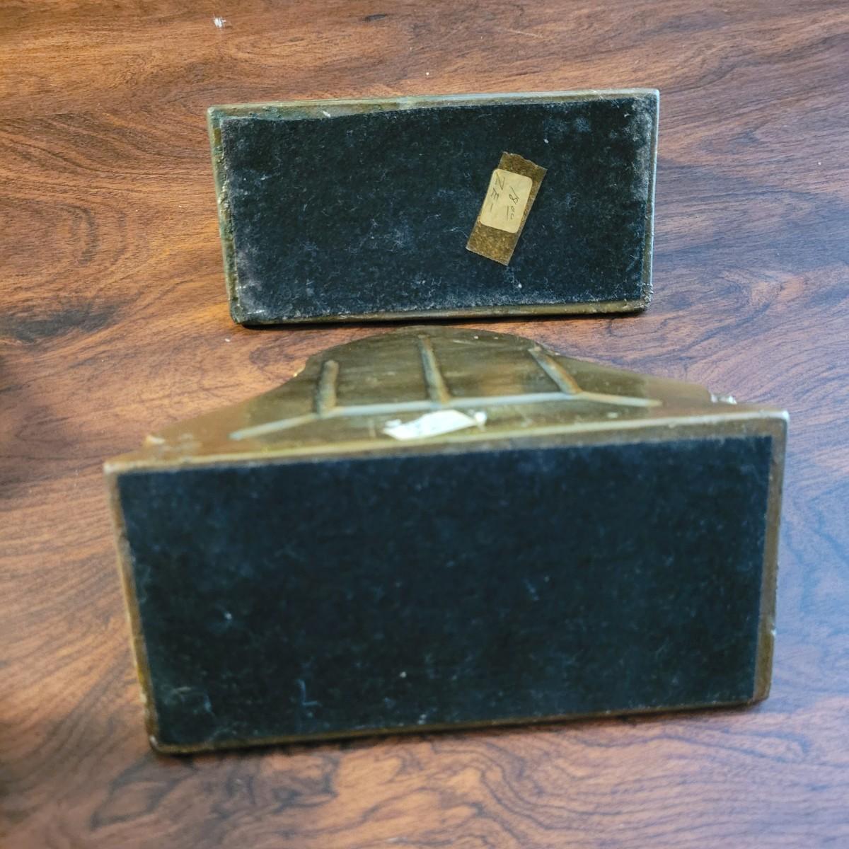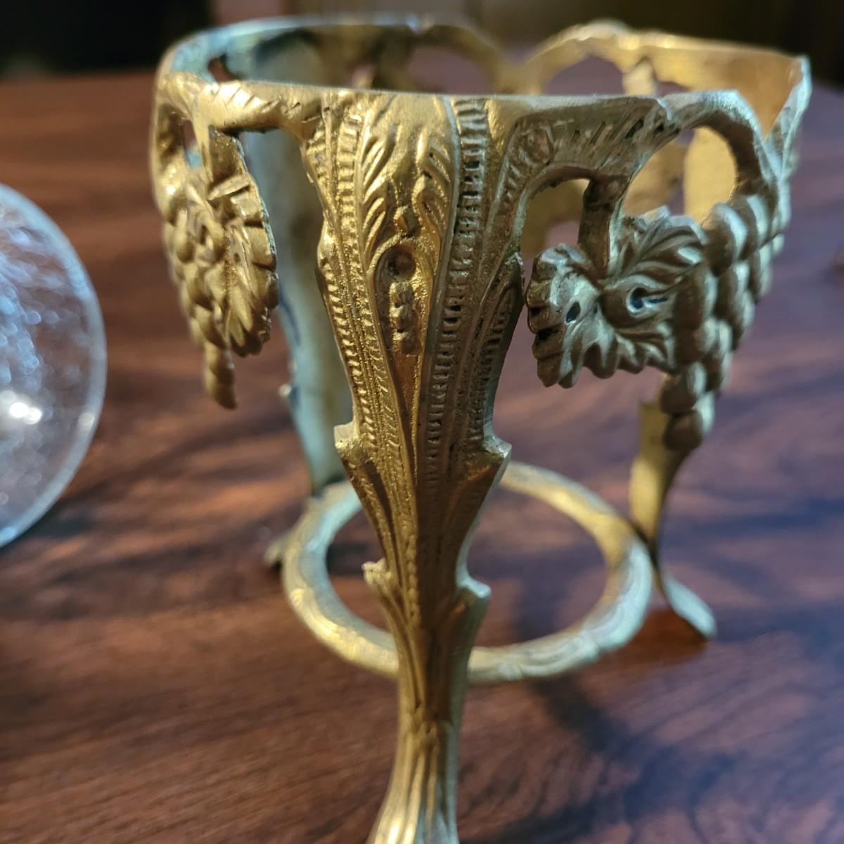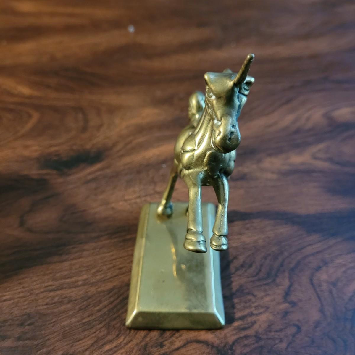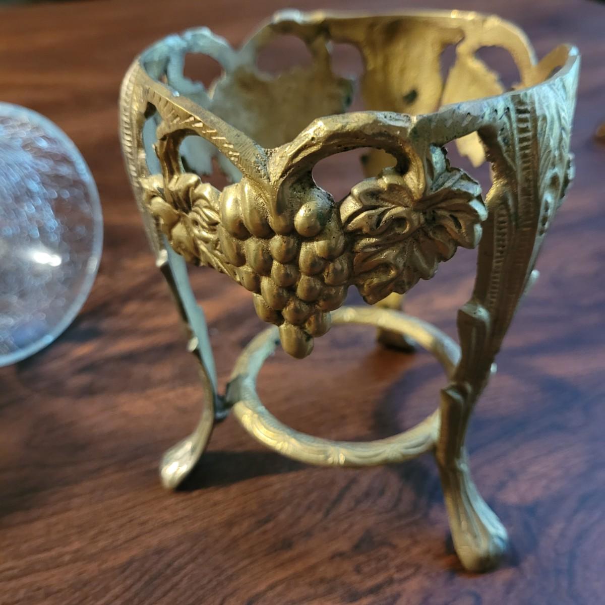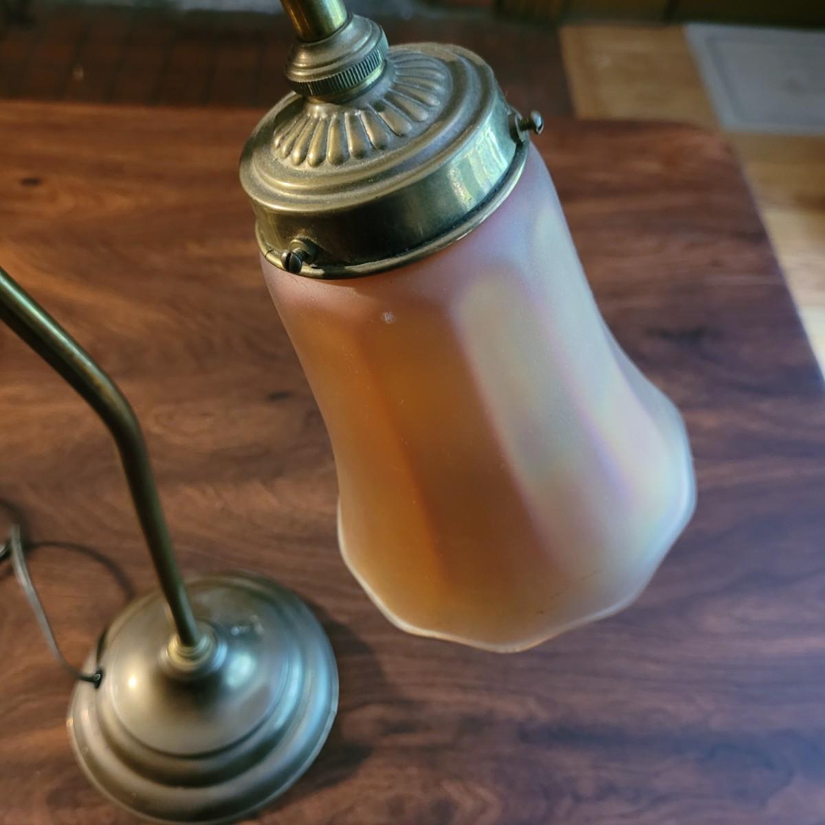 Collection of decor with brass style and coloring. Can not verify if items are real brass. Decor includes glass floral shade lamp that works when plugged in. Lamp in good condition with small crack at base and where shade attaches to body. Other items included are a small unicorn, book ends that are heavy, glass vase with stand, and small bowl on rolling cart (made in Israel). Lamp measures approximately 18.5"H at tallest point. Shipping available.