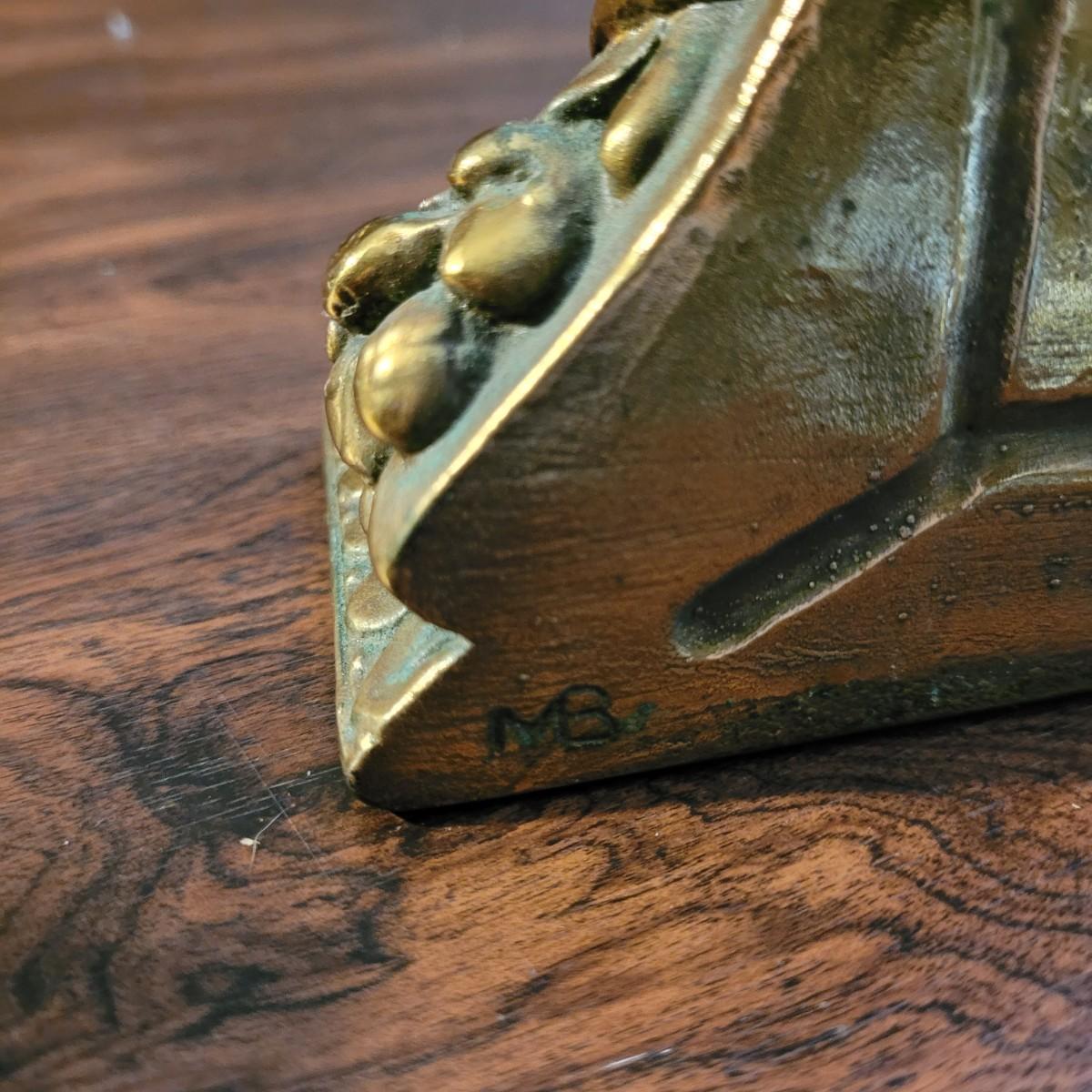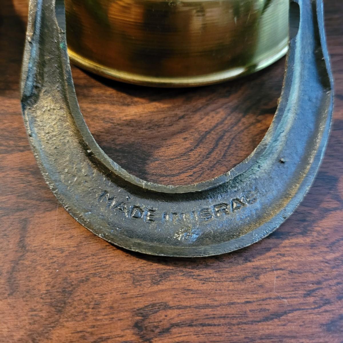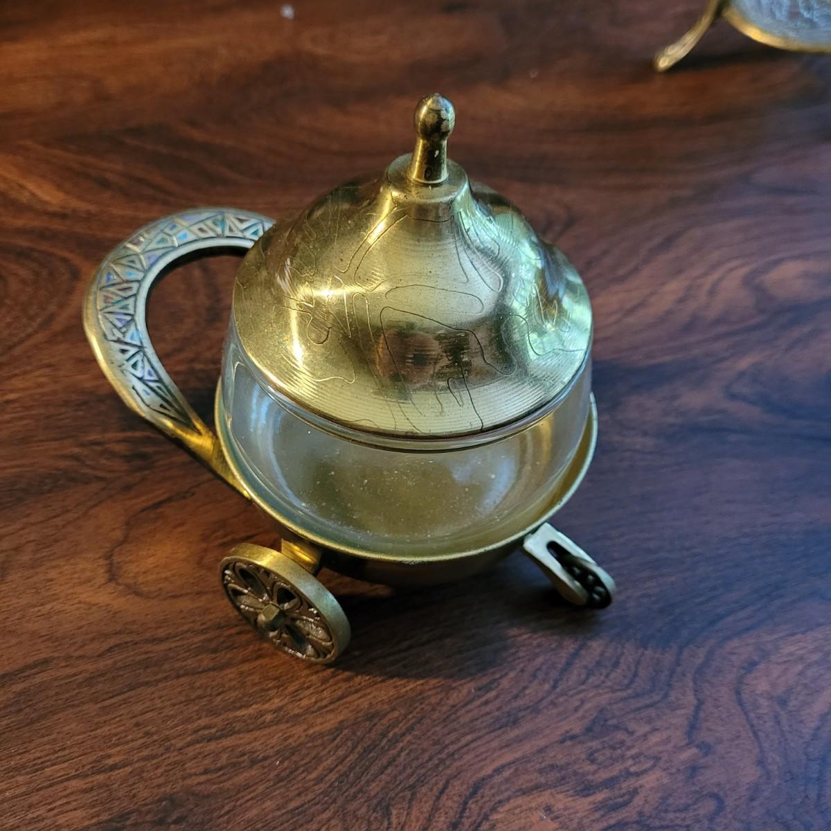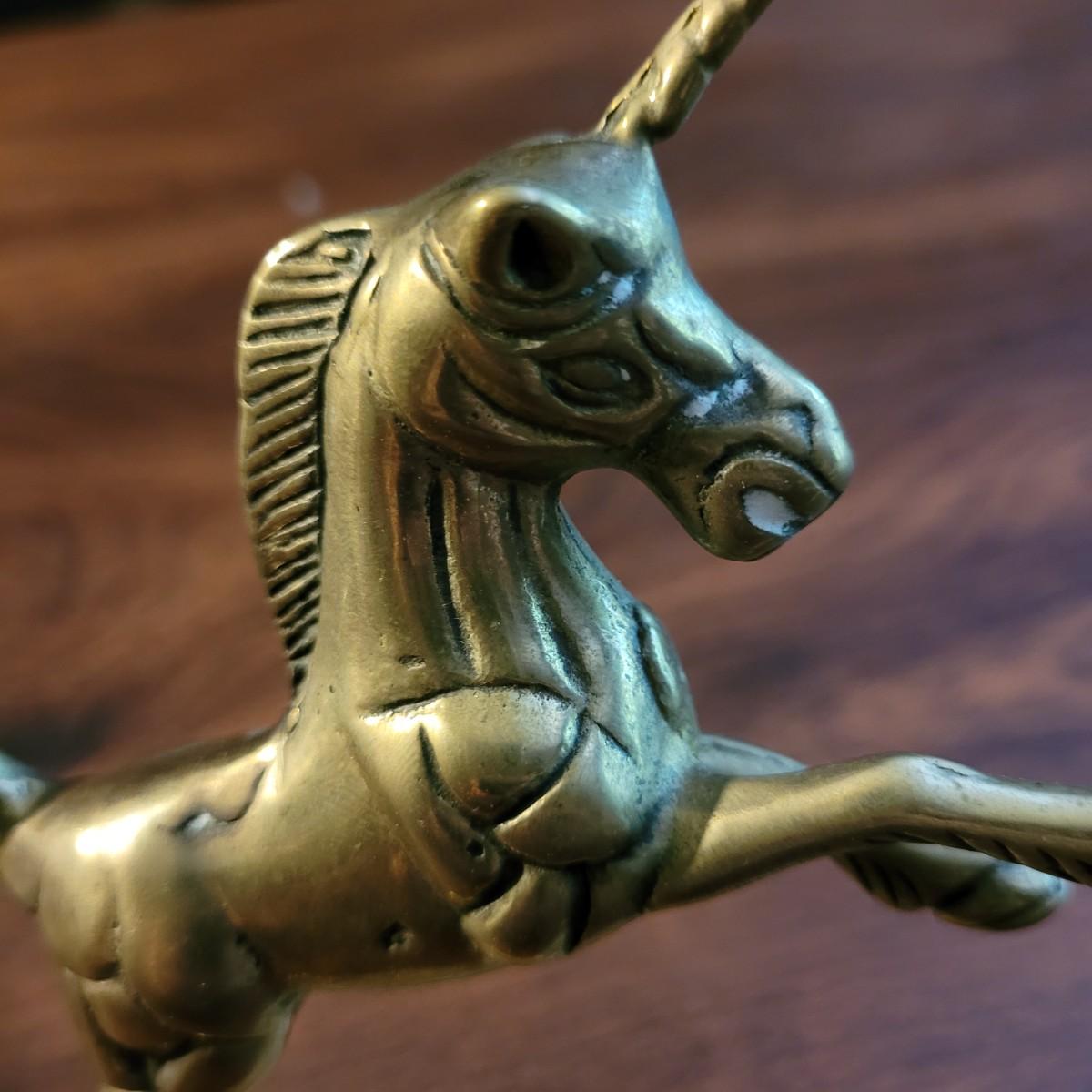 Collection of decor with brass style and coloring. Can not verify if items are real brass. Decor includes glass floral shade lamp that works when plugged in. Lamp in good condition with small crack at base and where shade attaches to body. Other items included are a small unicorn, book ends that are heavy, glass vase with stand, and small bowl on rolling cart (made in Israel). Lamp measures approximately 18.5"H at tallest point. Shipping available.