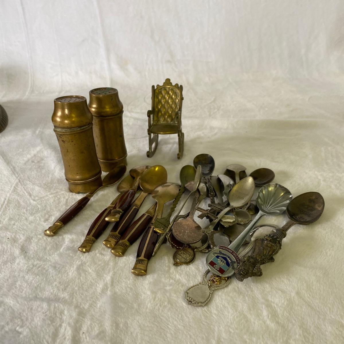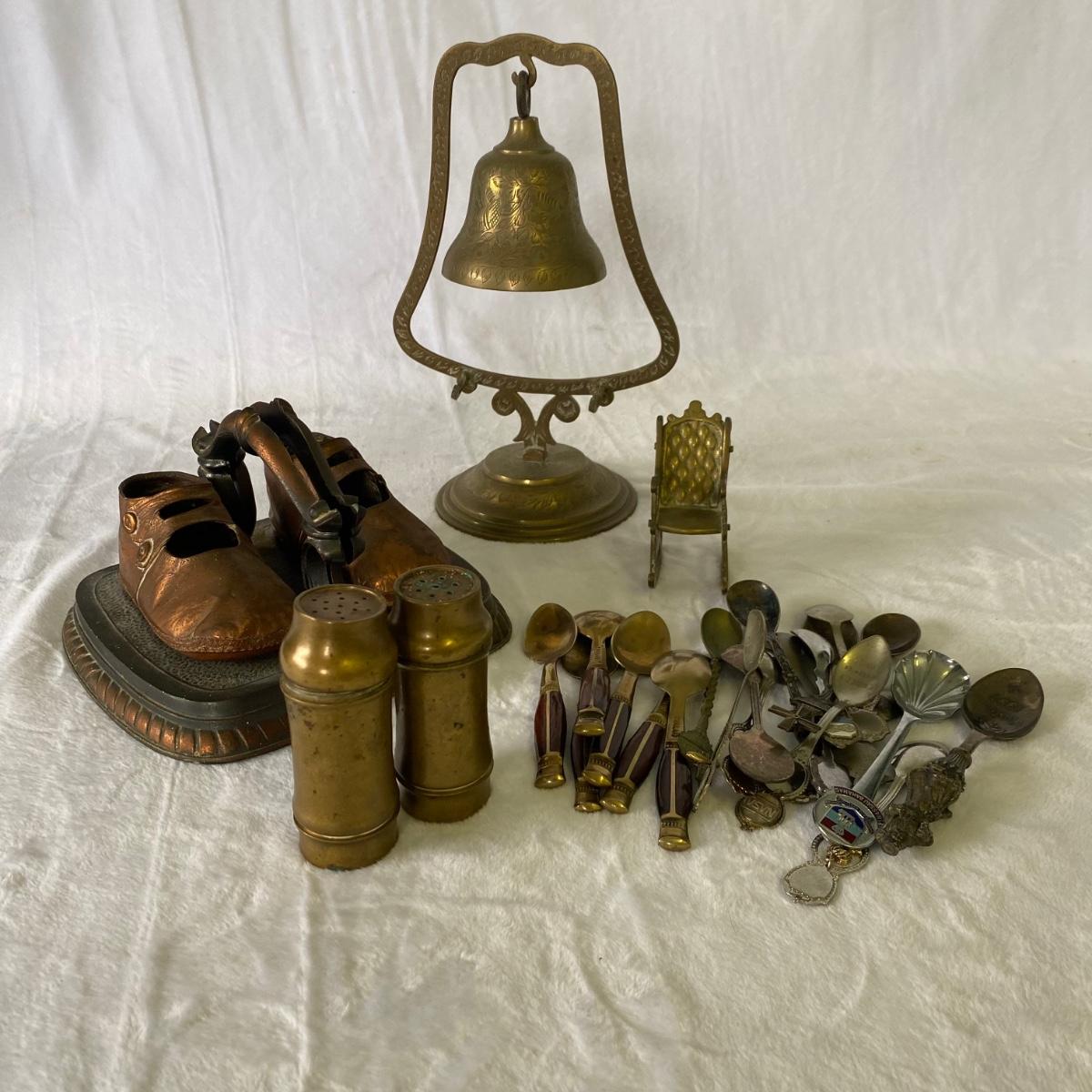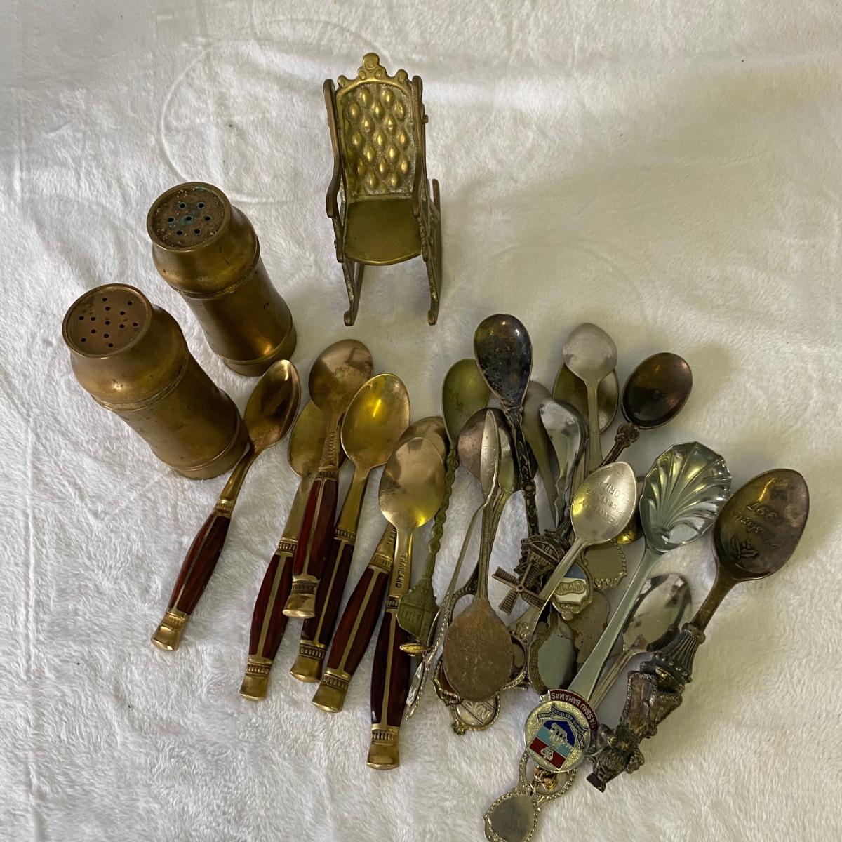 Bronze baby bookends, bell, salt and pepper shakers, rocker, and small spoons. Salt and pepper shakers are 3.75”H. Spoons measure 4-4.5”L. Good condition.
