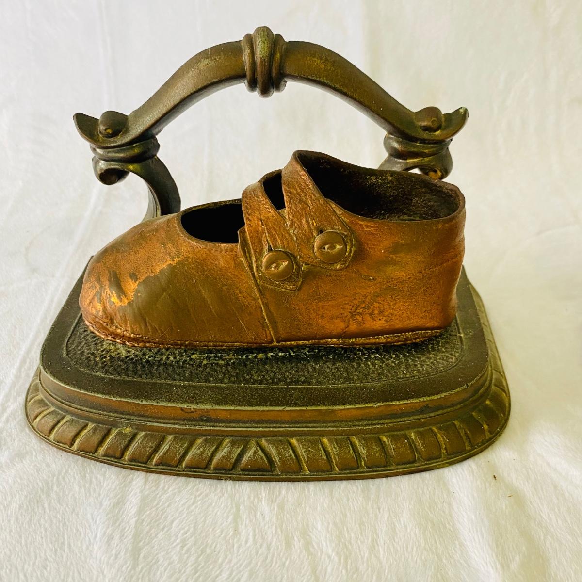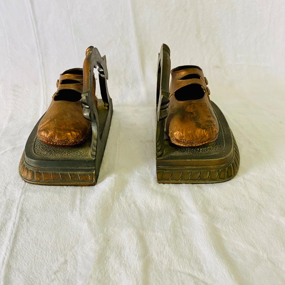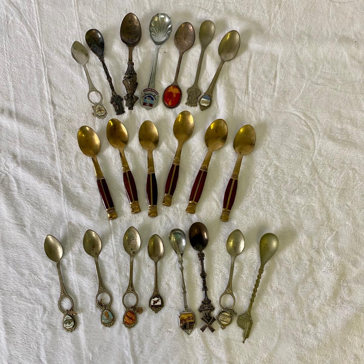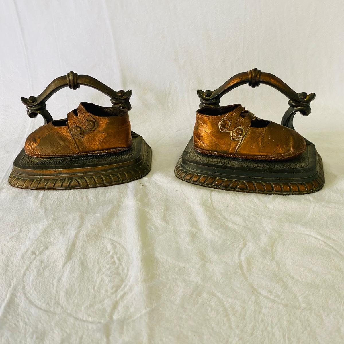 Bronze baby bookends, bell, salt and pepper shakers, rocker, and small spoons. Salt and pepper shakers are 3.75”H. Spoons measure 4-4.5”L. Good condition.