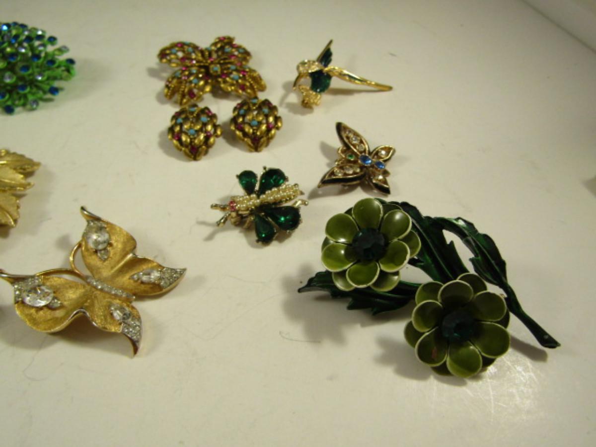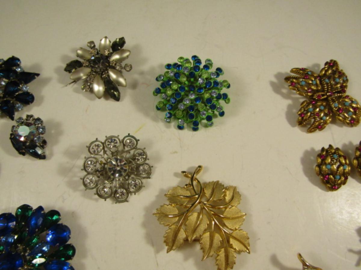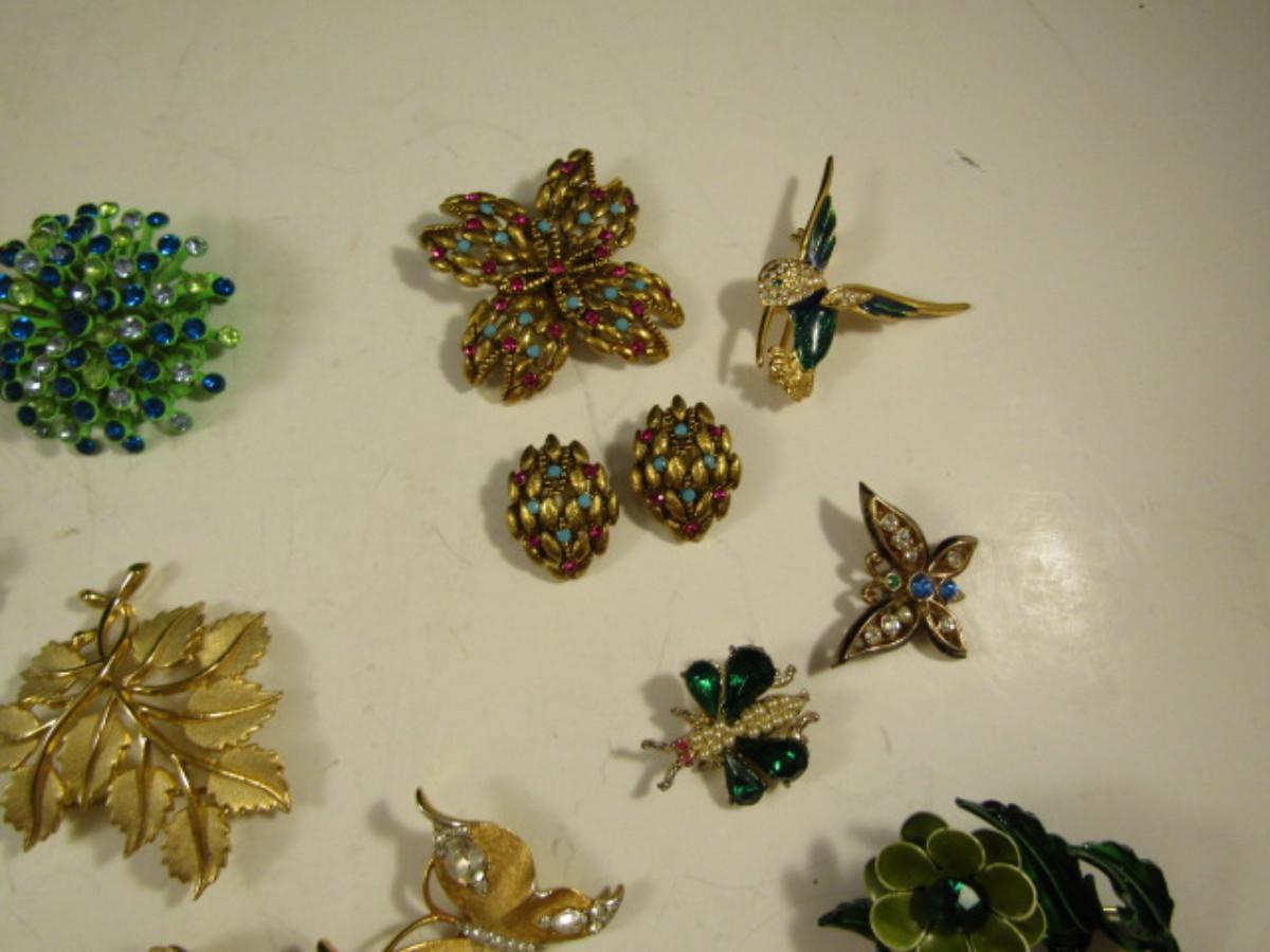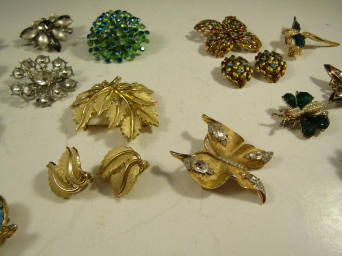 Collection of Brooches (#31). Some have matching clip-on/screw-back earrings. Names include Trifari, Roman, BSK, and SWO Inc.