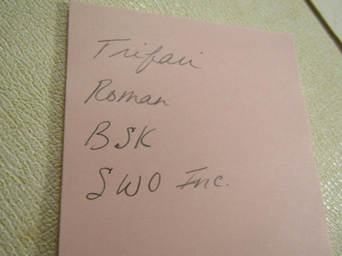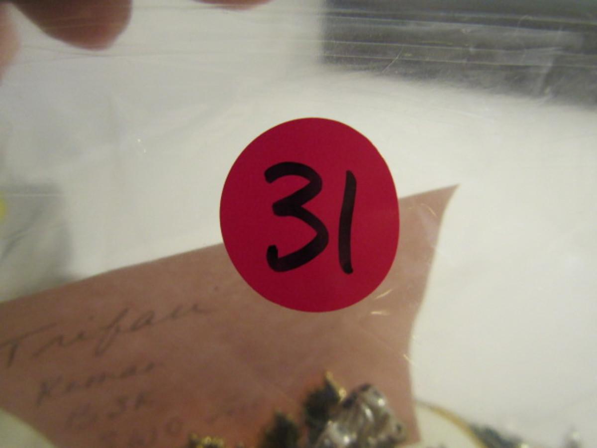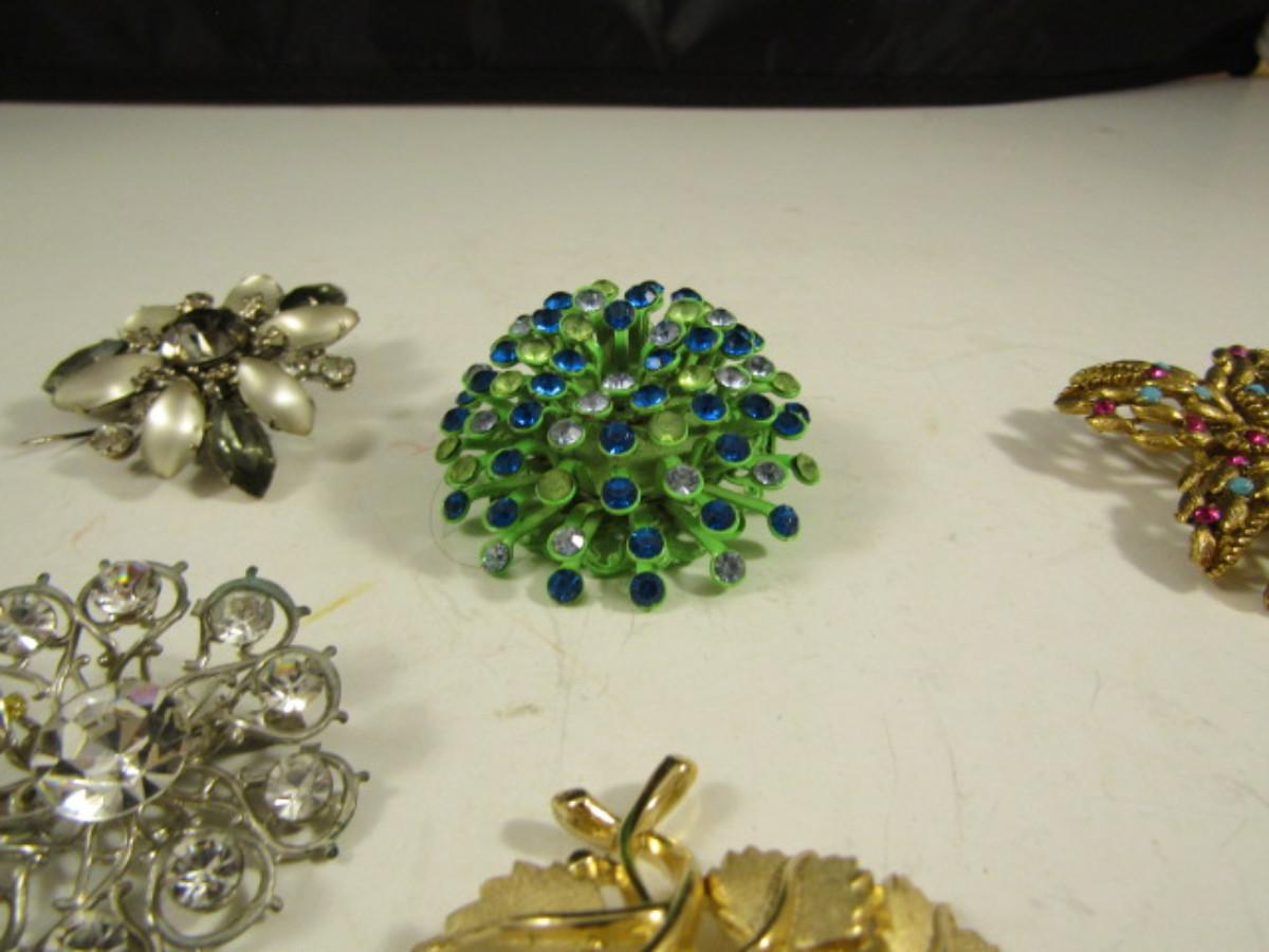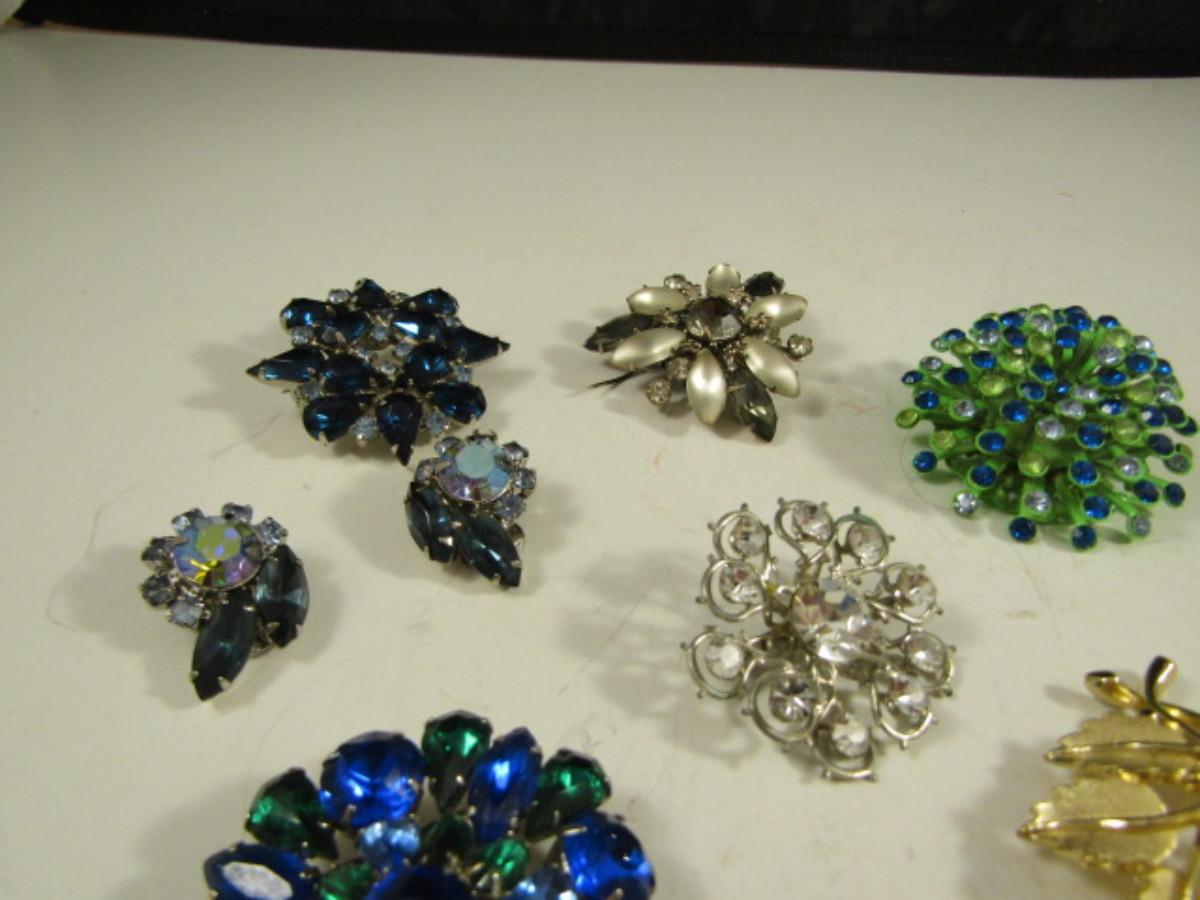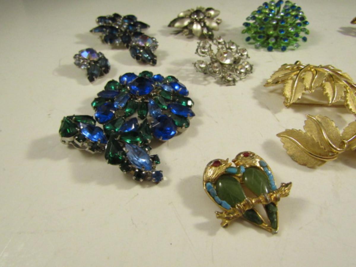Collection of Brooches (#31). Some have matching clip-on/screw-back earrings. Names include Trifari, Roman, BSK, and SWO Inc.