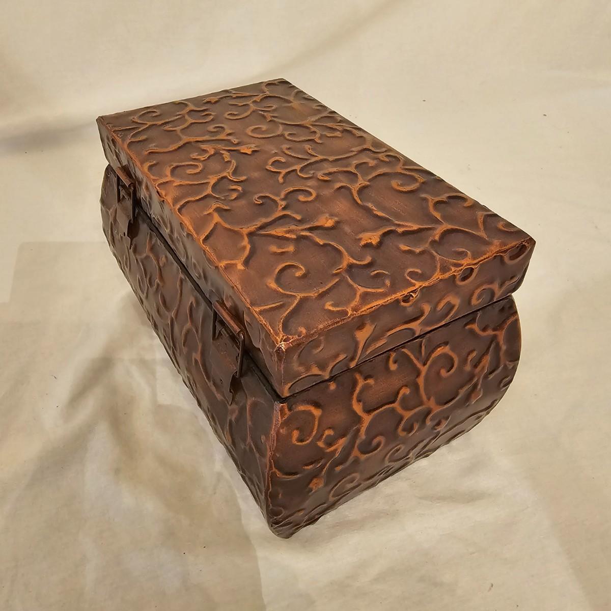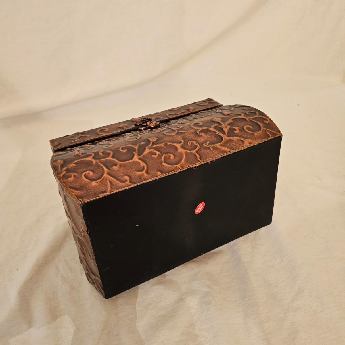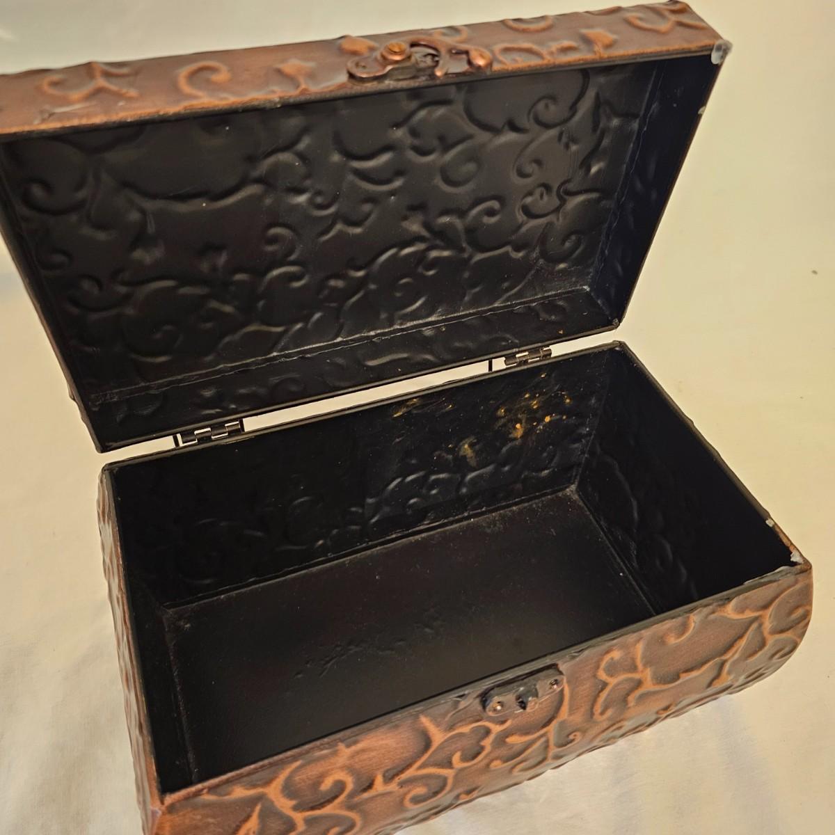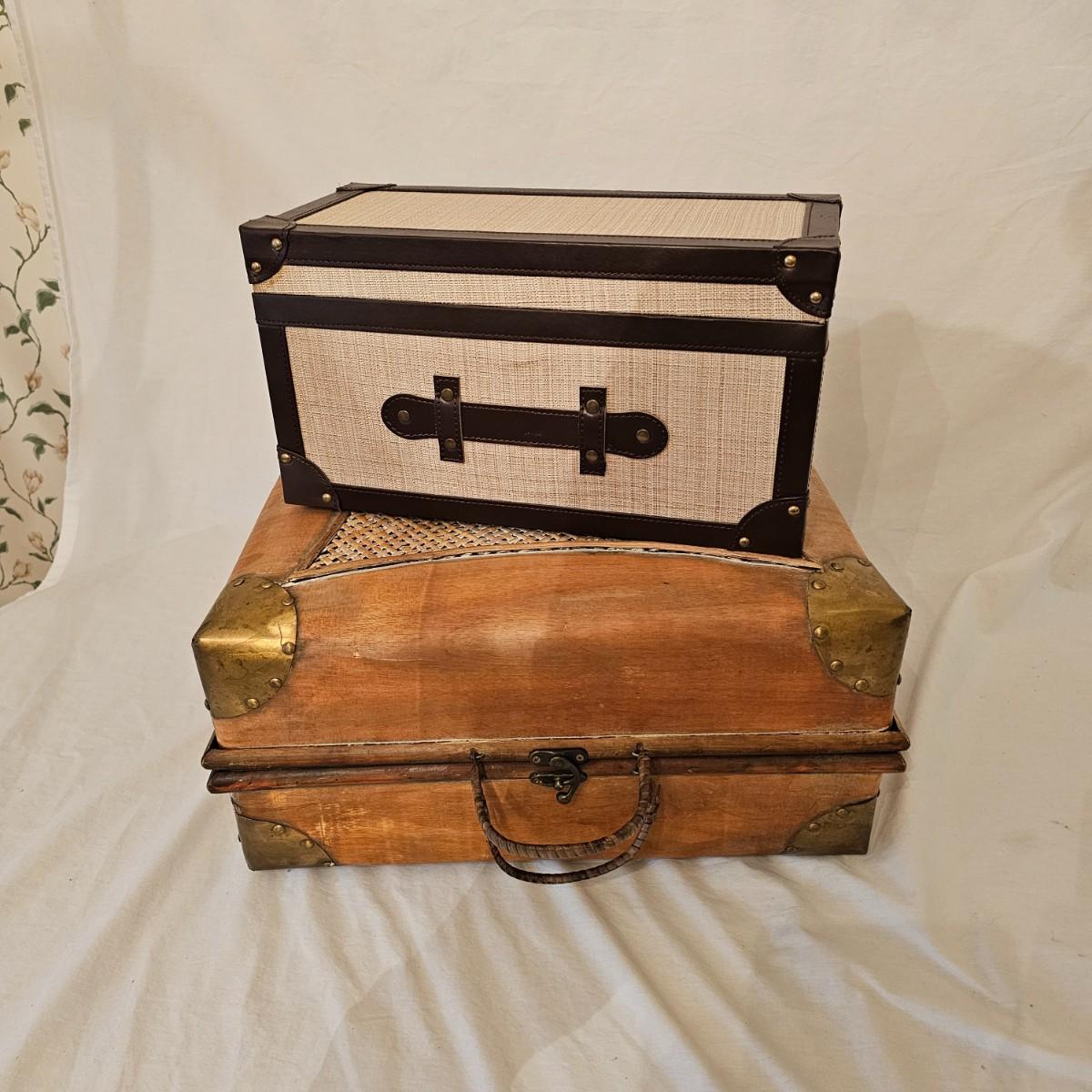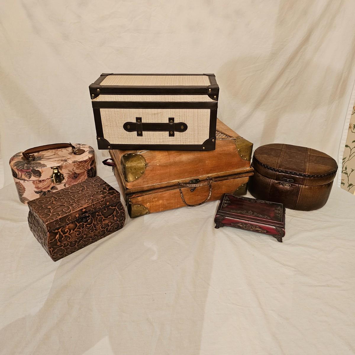 Six distinctive boxes in varying styles and shapes. Large suitcase style item has handles, wicker look inserts and metal corners. Measures 14" x 19" x 10"H. Long rectangle case is7.5" x 15" x 8"H. Oblong hassock style item has faux leather nail studded outside, measures 9" x 12" x 7"H. Flowered case with handle could be used for makeup, has removable tray and mirror in lid. Copper looking chest is metal, has clasp and raised design. Small flat box is embellished with scrollwork, has dark green faux felt interior. See photos for details. Local pickup only.