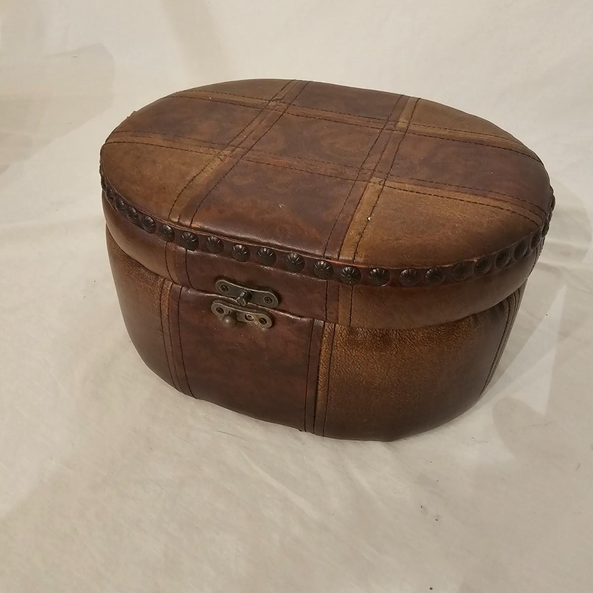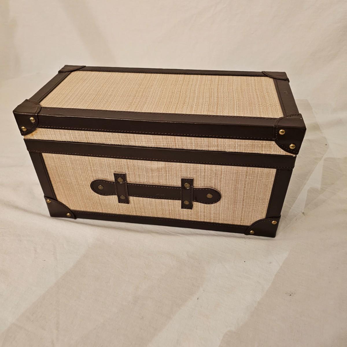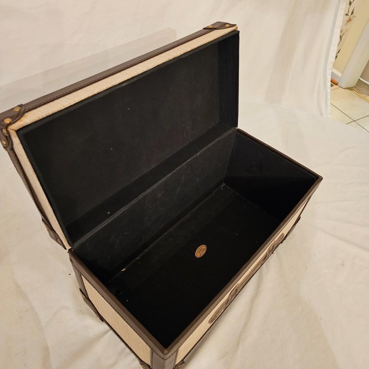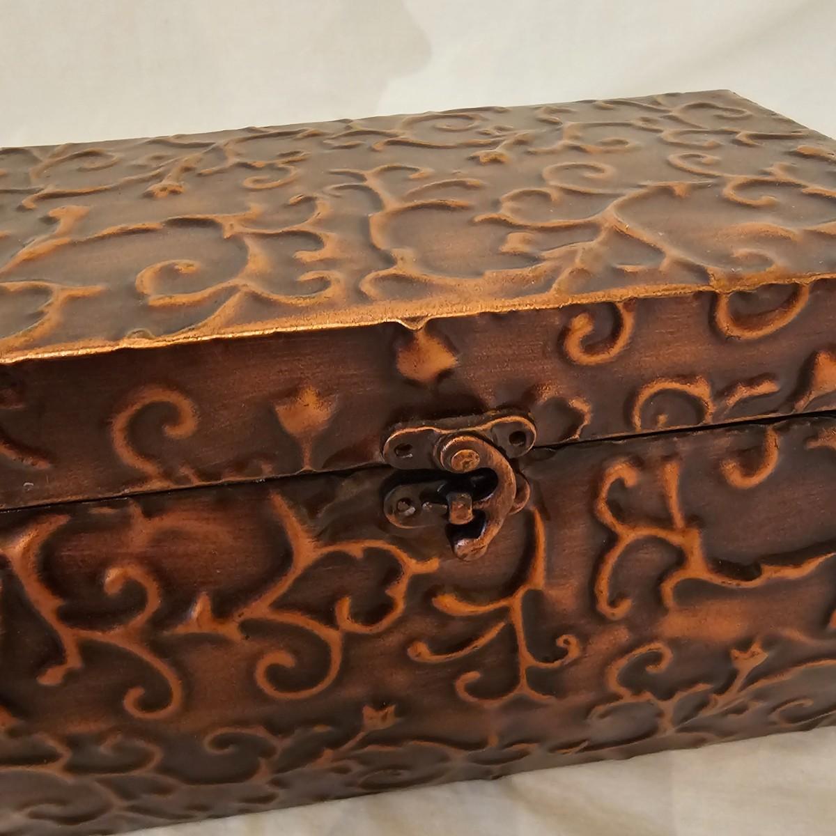 Six distinctive boxes in varying styles and shapes. Large suitcase style item has handles, wicker look inserts and metal corners. Measures 14" x 19" x 10"H. Long rectangle case is7.5" x 15" x 8"H. Oblong hassock style item has faux leather nail studded outside, measures 9" x 12" x 7"H. Flowered case with handle could be used for makeup, has removable tray and mirror in lid. Copper looking chest is metal, has clasp and raised design. Small flat box is embellished with scrollwork, has dark green faux felt interior. See photos for details. Local pickup only.
