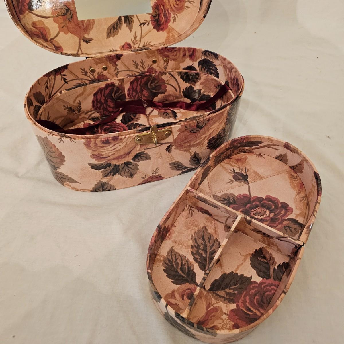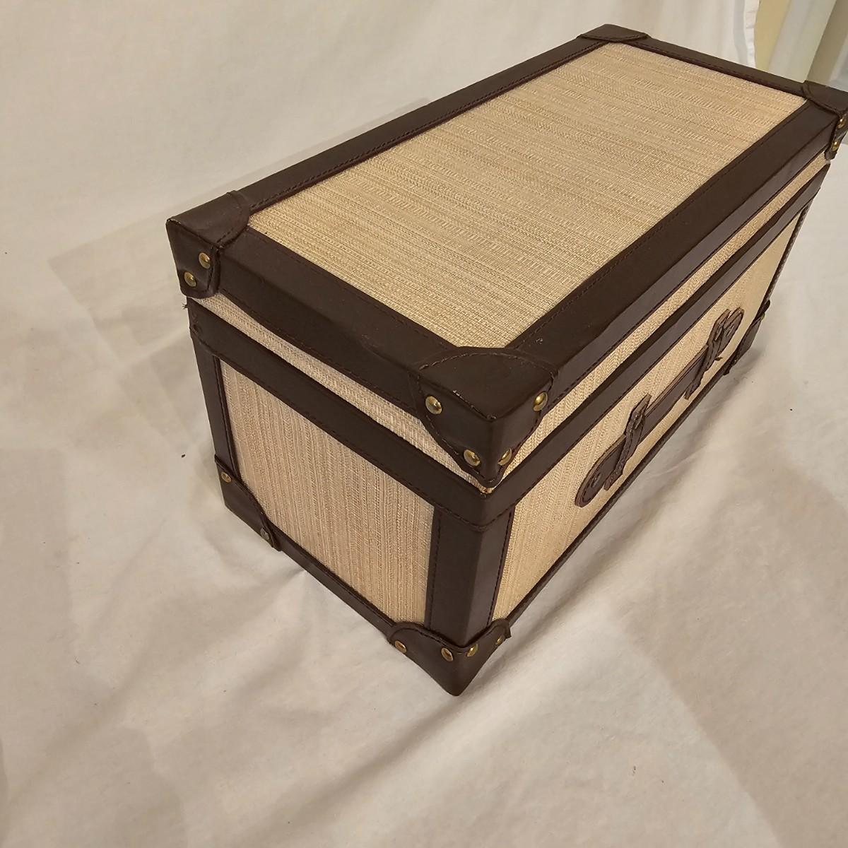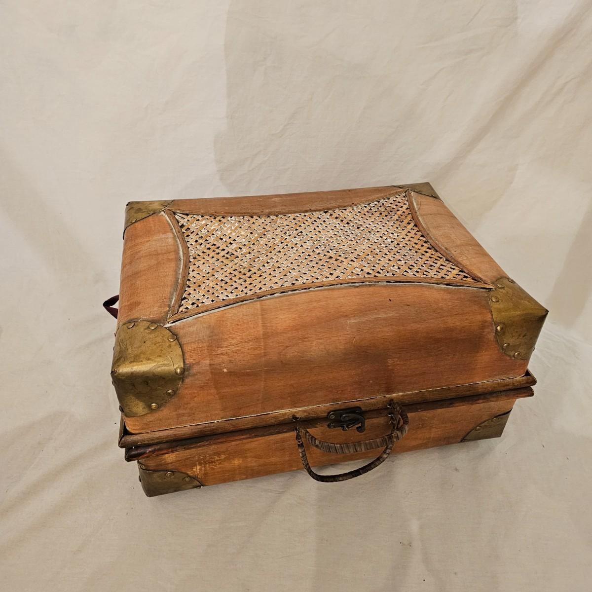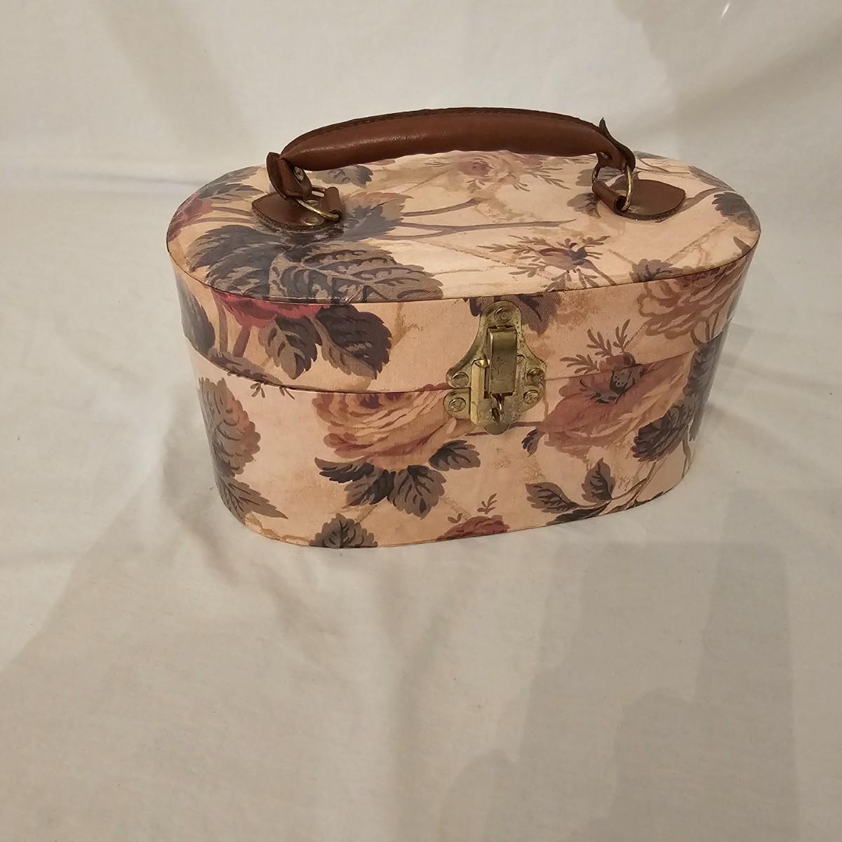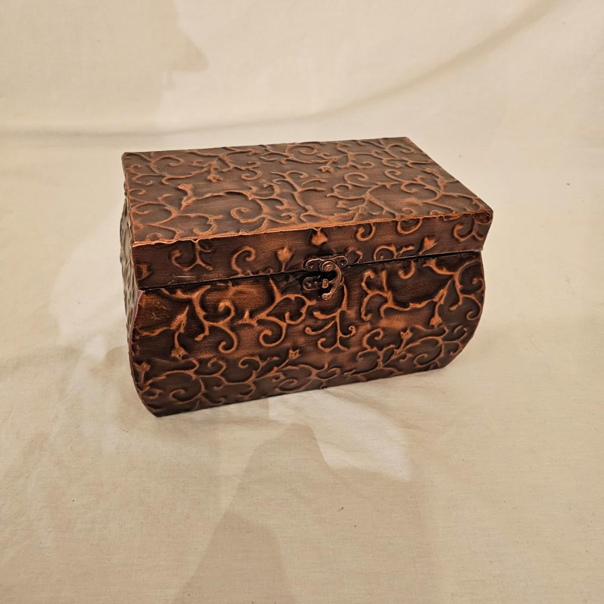 Six distinctive boxes in varying styles and shapes. Large suitcase style item has handles, wicker look inserts and metal corners. Measures 14" x 19" x 10"H. Long rectangle case is7.5" x 15" x 8"H. Oblong hassock style item has faux leather nail studded outside, measures 9" x 12" x 7"H. Flowered case with handle could be used for makeup, has removable tray and mirror in lid. Copper looking chest is metal, has clasp and raised design. Small flat box is embellished with scrollwork, has dark green faux felt interior. See photos for details. Local pickup only.
