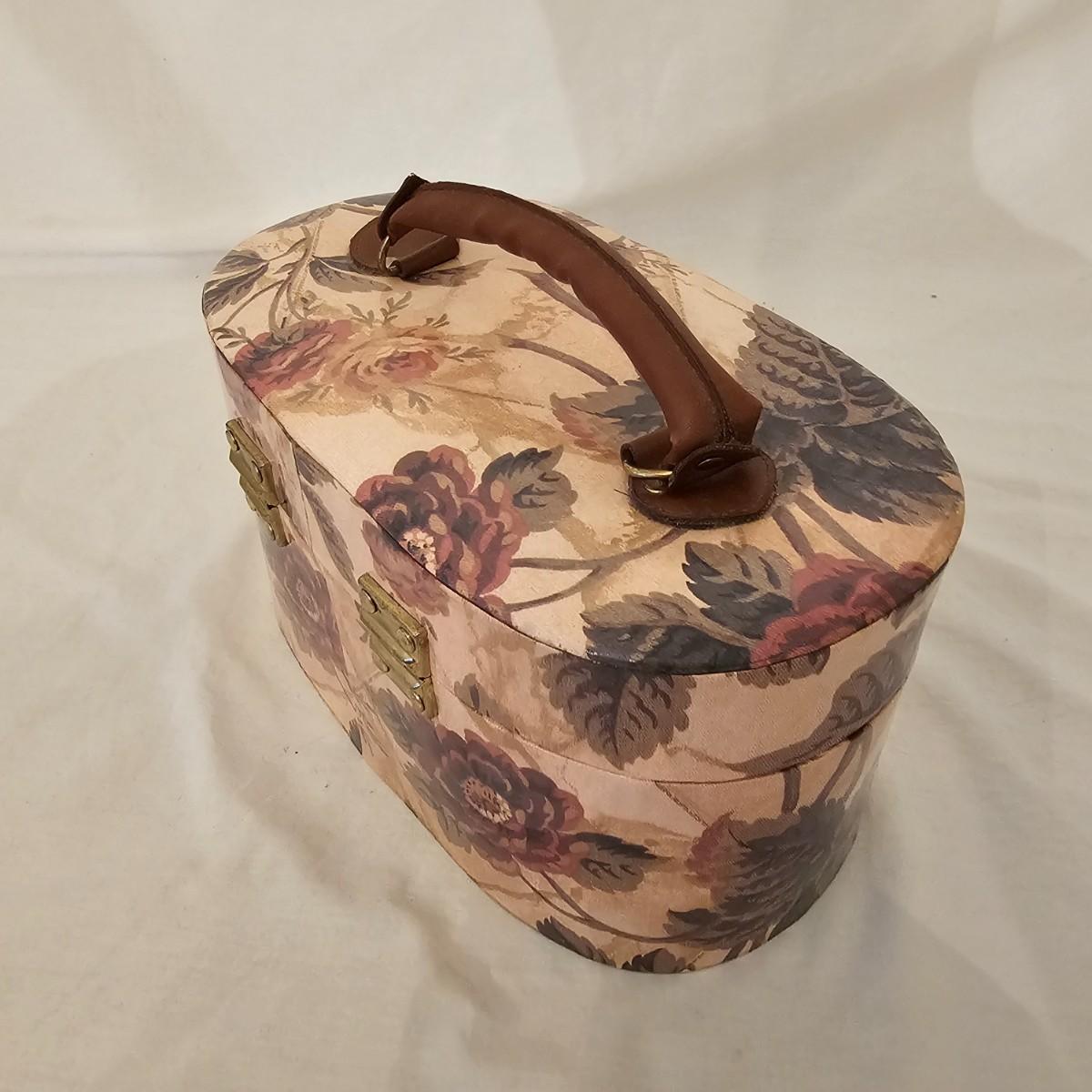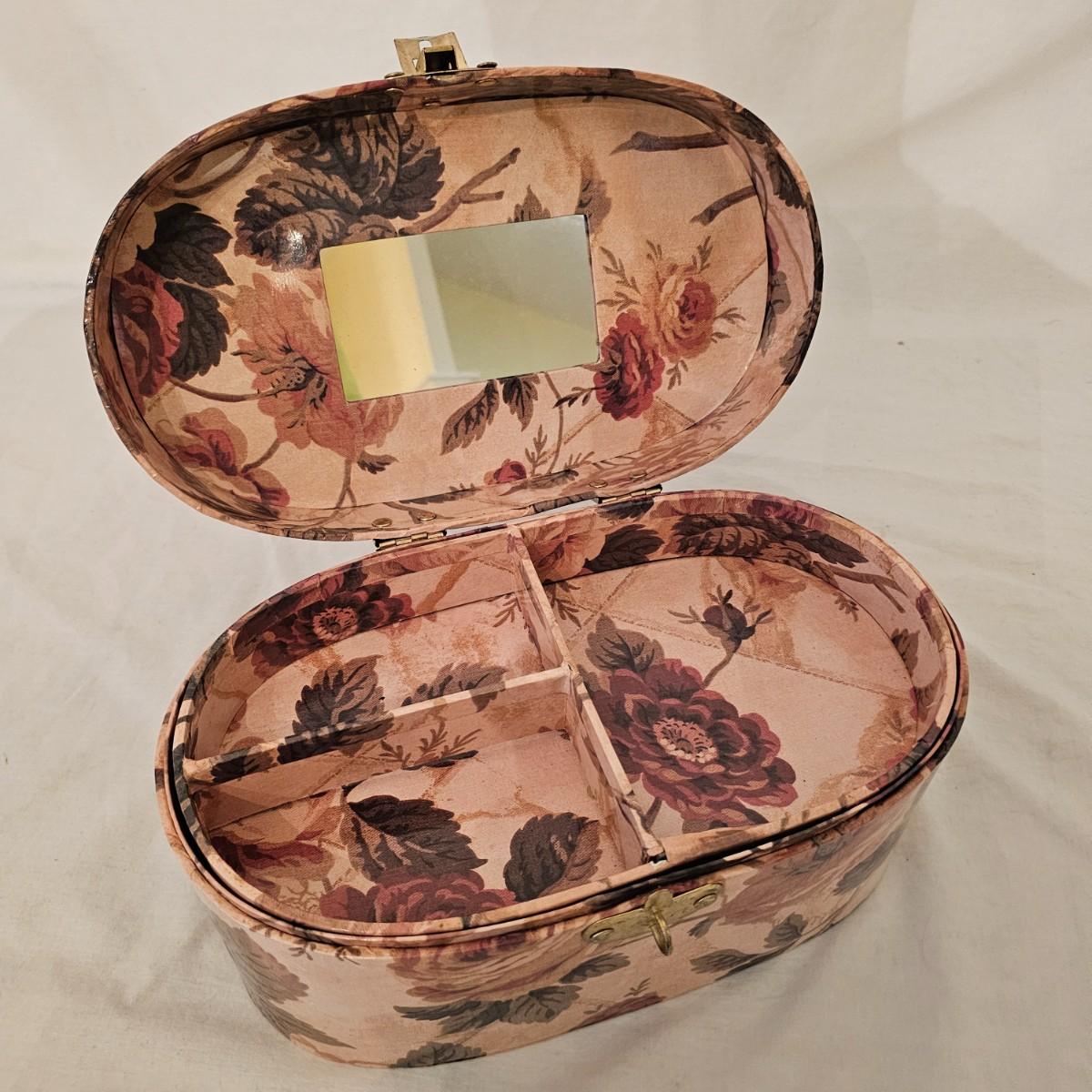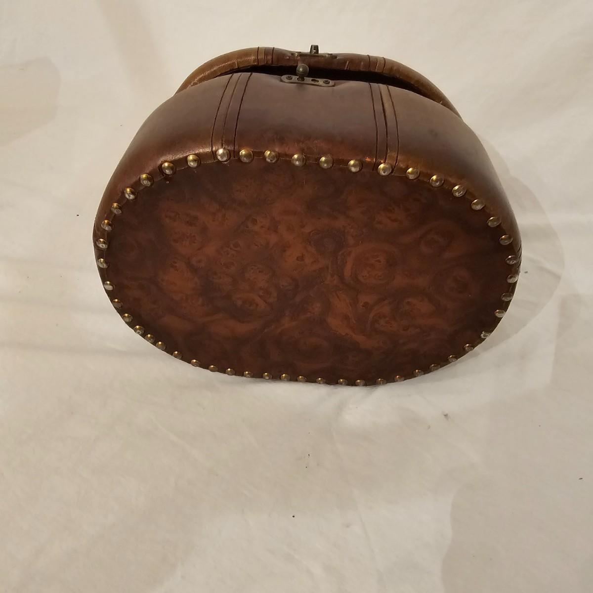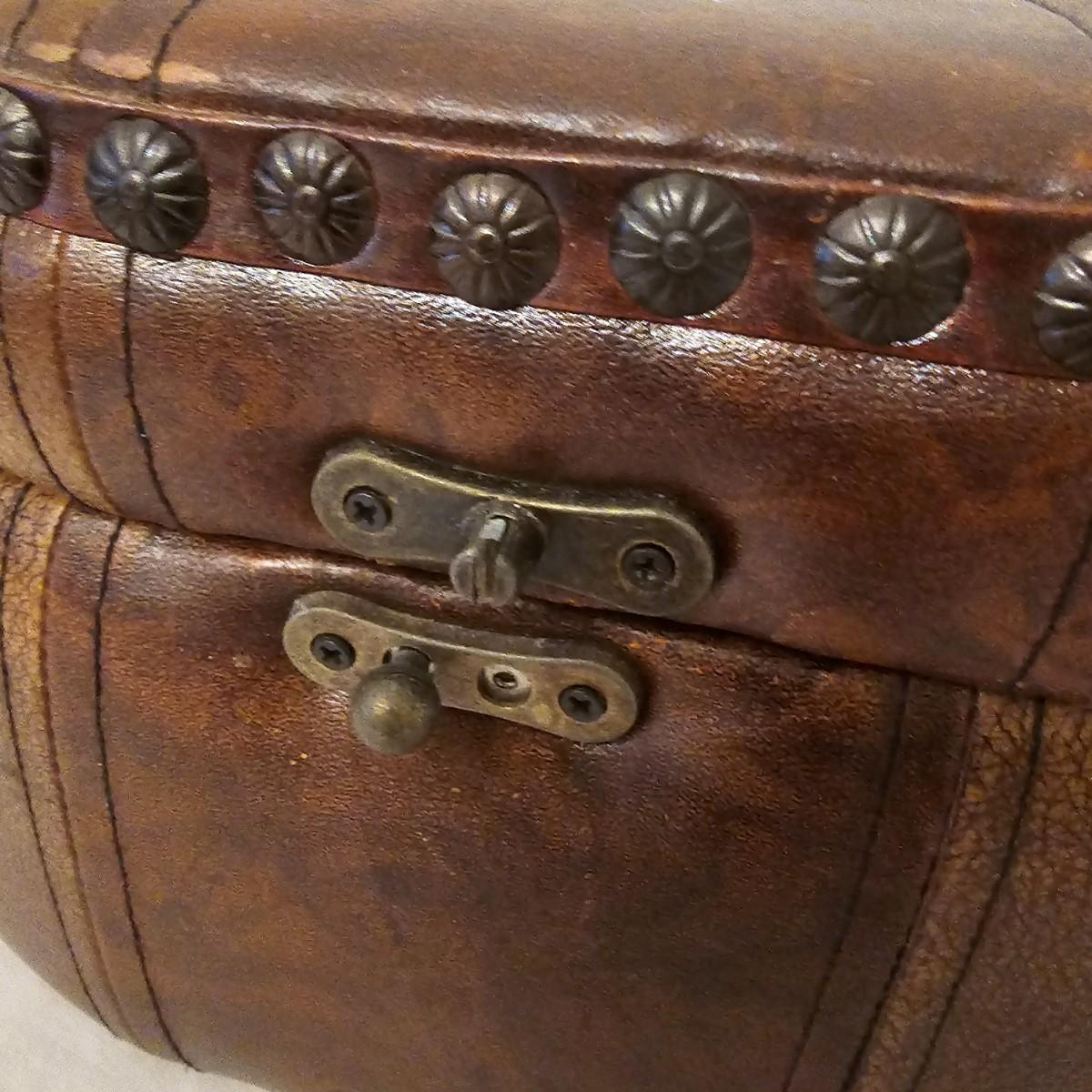 Six distinctive boxes in varying styles and shapes. Large suitcase style item has handles, wicker look inserts and metal corners. Measures 14" x 19" x 10"H. Long rectangle case is7.5" x 15" x 8"H. Oblong hassock style item has faux leather nail studded outside, measures 9" x 12" x 7"H. Flowered case with handle could be used for makeup, has removable tray and mirror in lid. Copper looking chest is metal, has clasp and raised design. Small flat box is embellished with scrollwork, has dark green faux felt interior. See photos for details. Local pickup only.