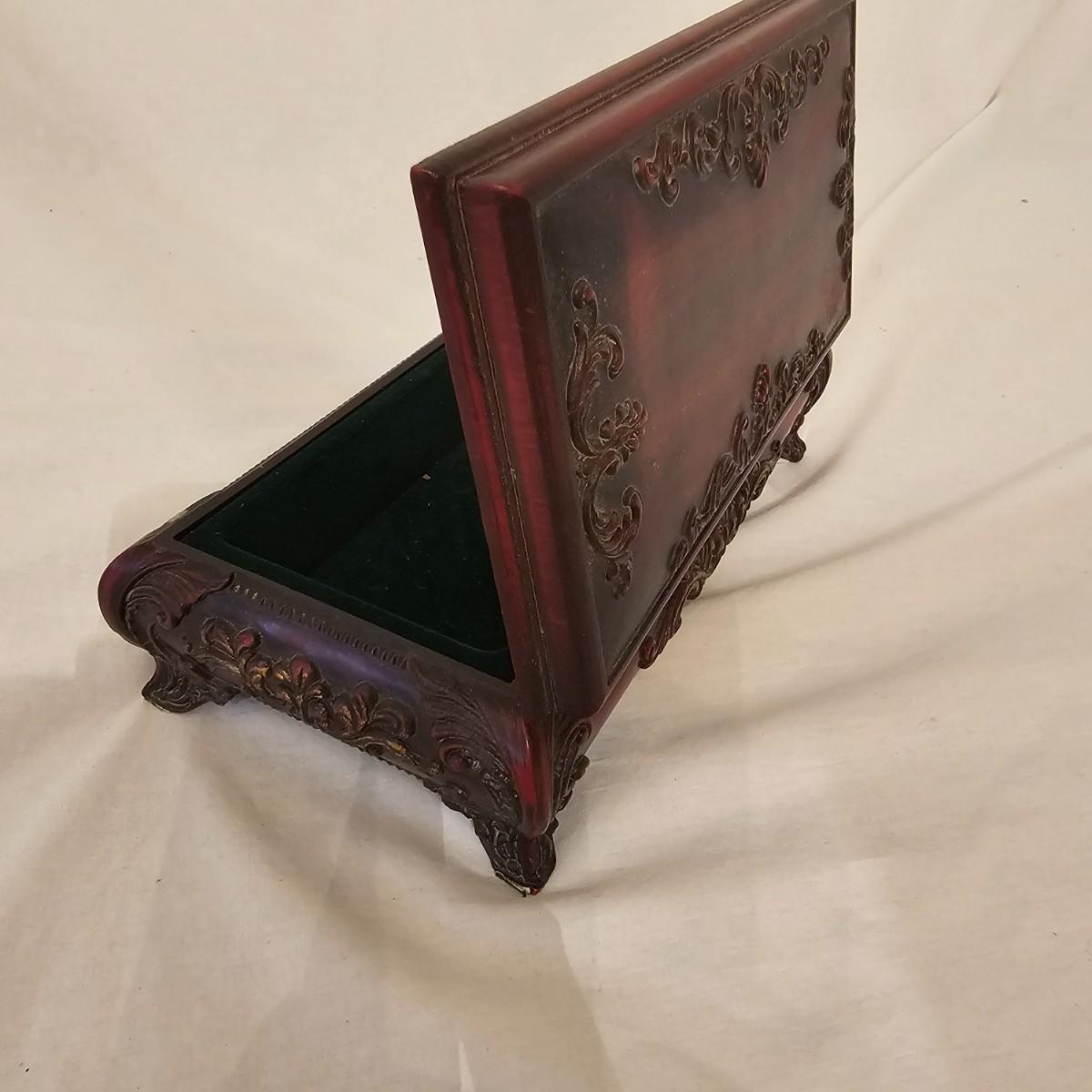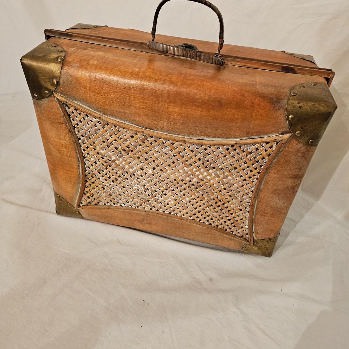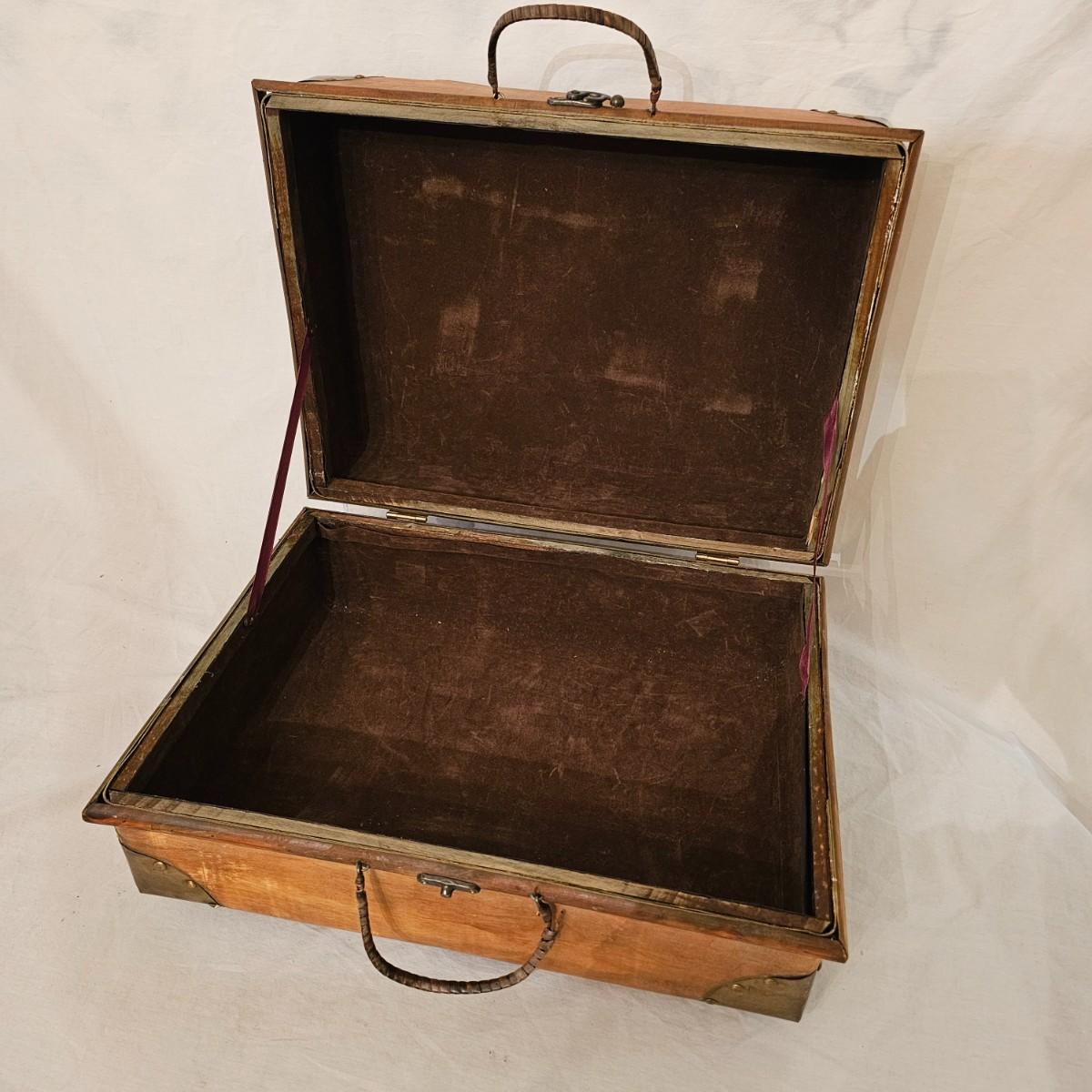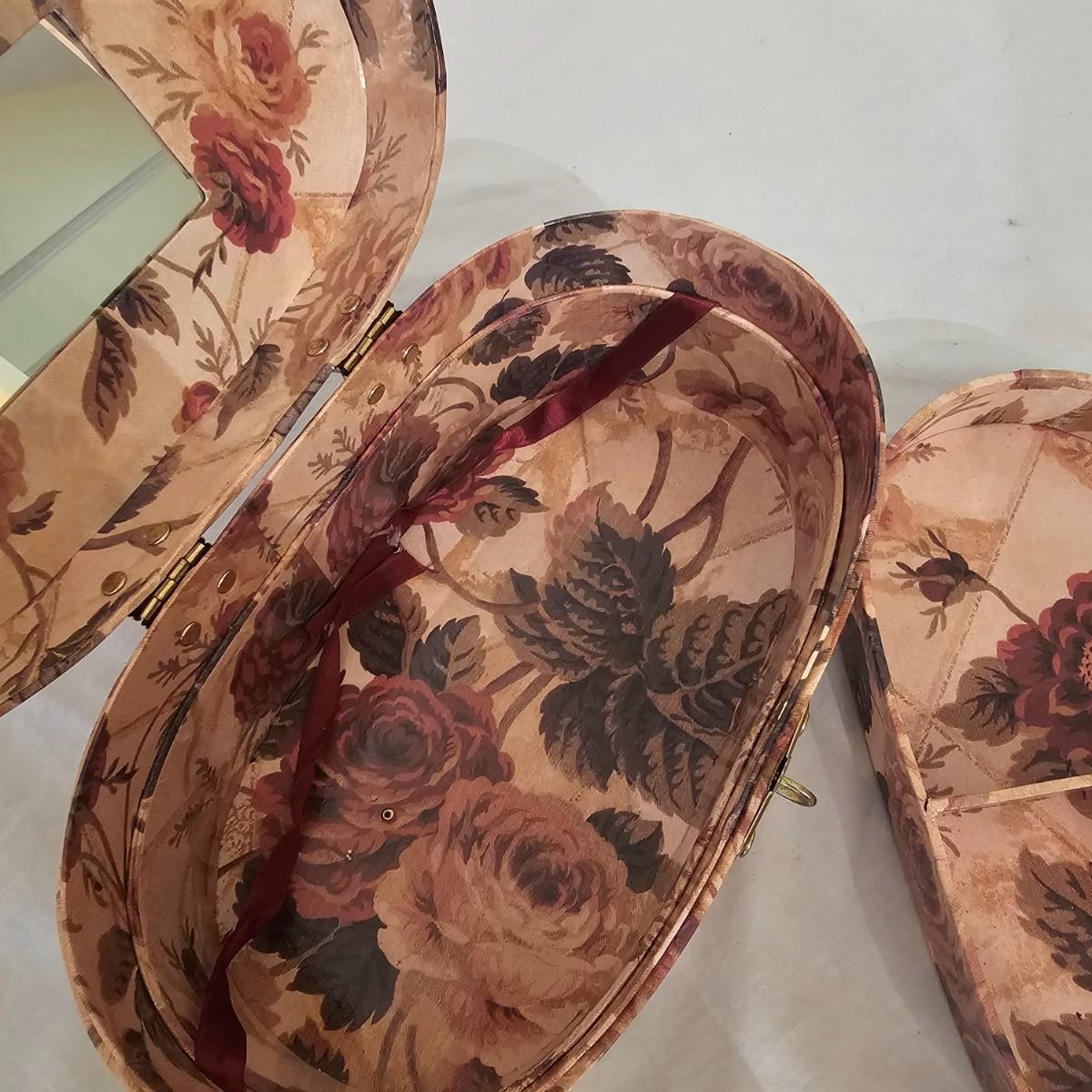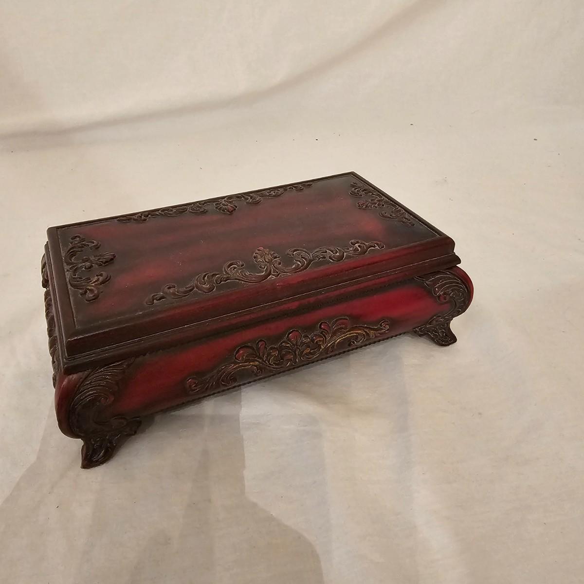 Six distinctive boxes in varying styles and shapes. Large suitcase style item has handles, wicker look inserts and metal corners. Measures 14" x 19" x 10"H. Long rectangle case is7.5" x 15" x 8"H. Oblong hassock style item has faux leather nail studded outside, measures 9" x 12" x 7"H. Flowered case with handle could be used for makeup, has removable tray and mirror in lid. Copper looking chest is metal, has clasp and raised design. Small flat box is embellished with scrollwork, has dark green faux felt interior. See photos for details. Local pickup only.