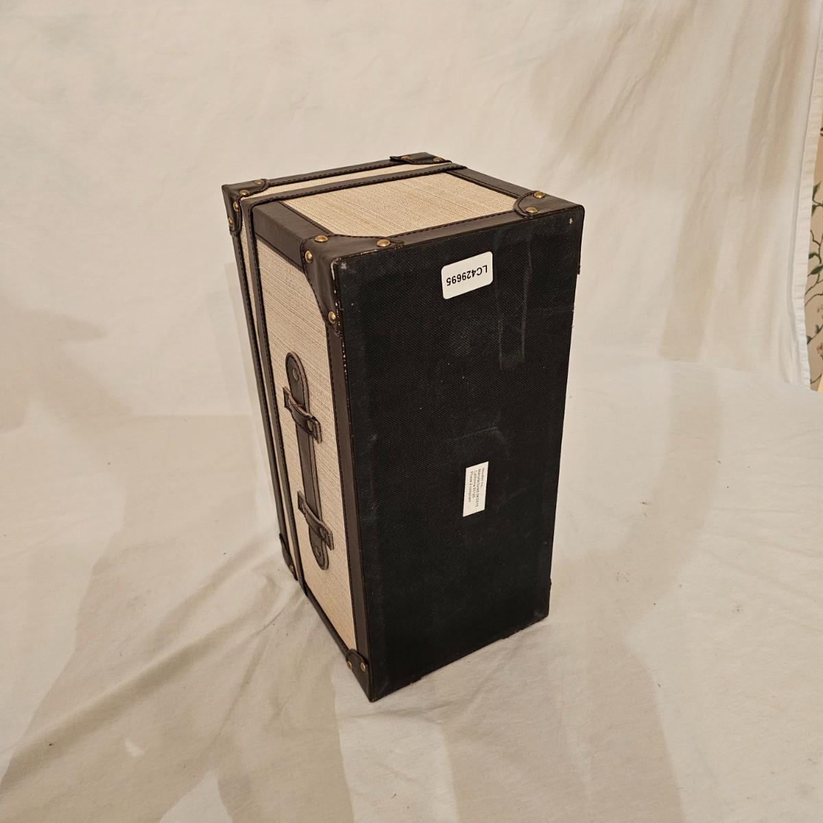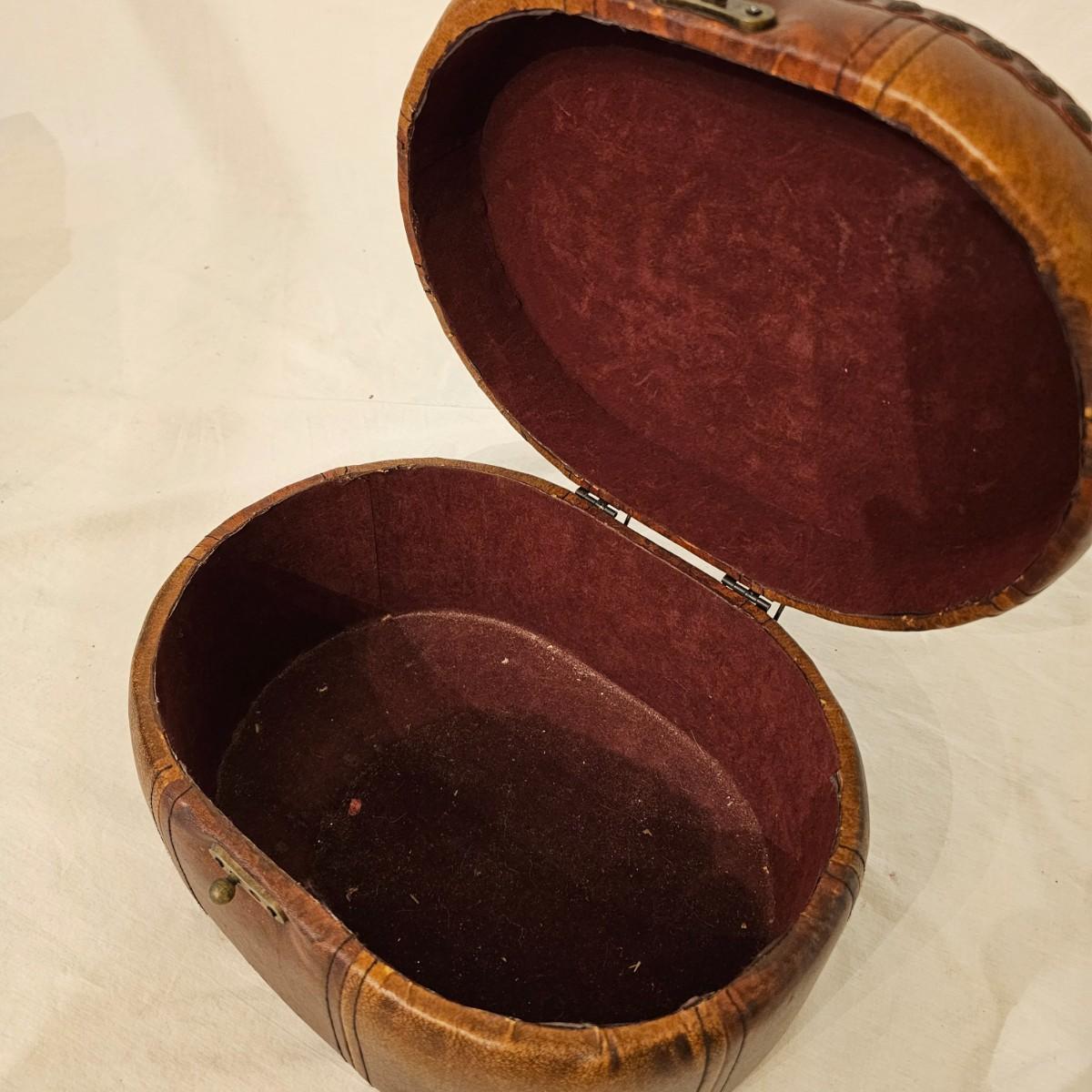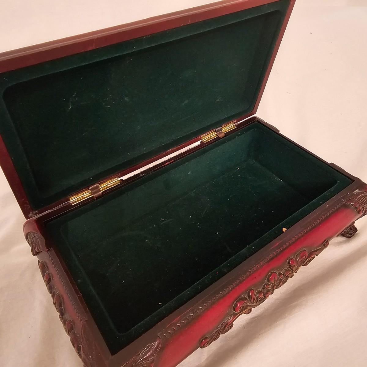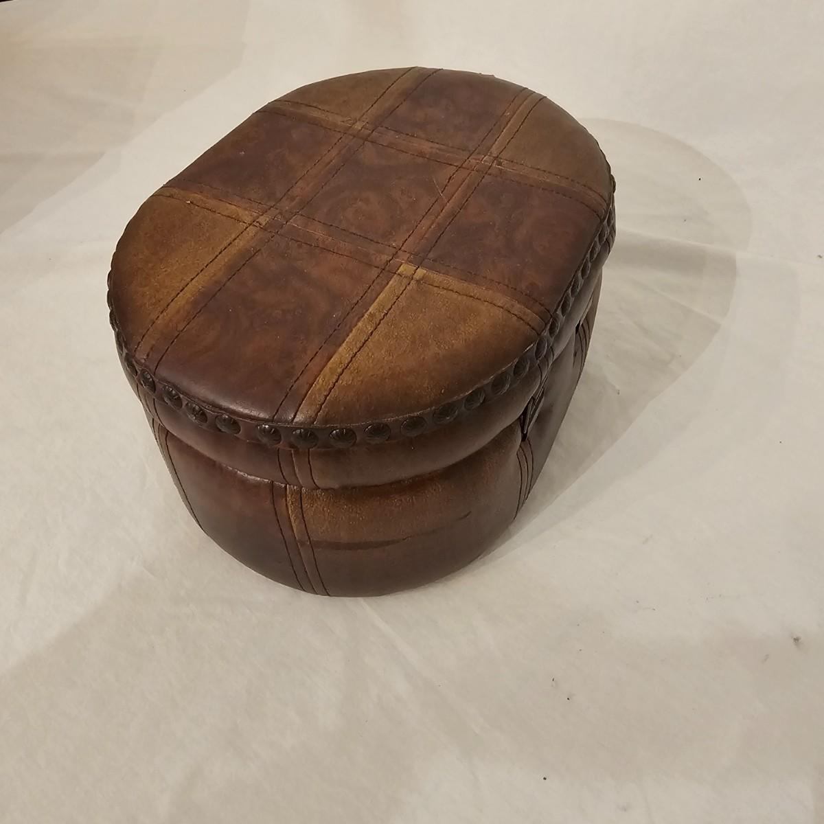 Six distinctive boxes in varying styles and shapes. Large suitcase style item has handles, wicker look inserts and metal corners. Measures 14" x 19" x 10"H. Long rectangle case is7.5" x 15" x 8"H. Oblong hassock style item has faux leather nail studded outside, measures 9" x 12" x 7"H. Flowered case with handle could be used for makeup, has removable tray and mirror in lid. Copper looking chest is metal, has clasp and raised design. Small flat box is embellished with scrollwork, has dark green faux felt interior. See photos for details. Local pickup only.