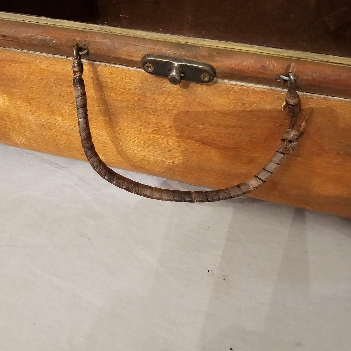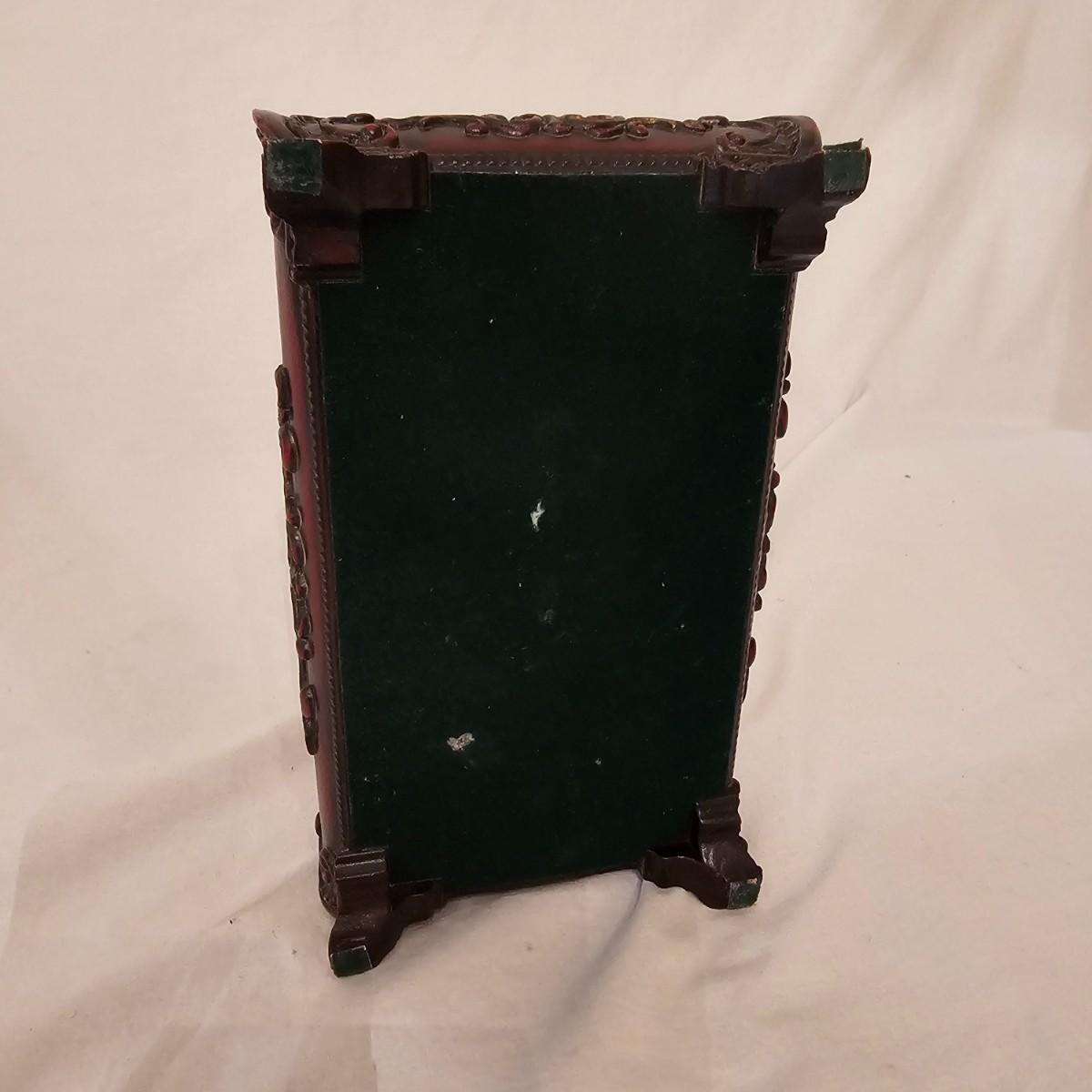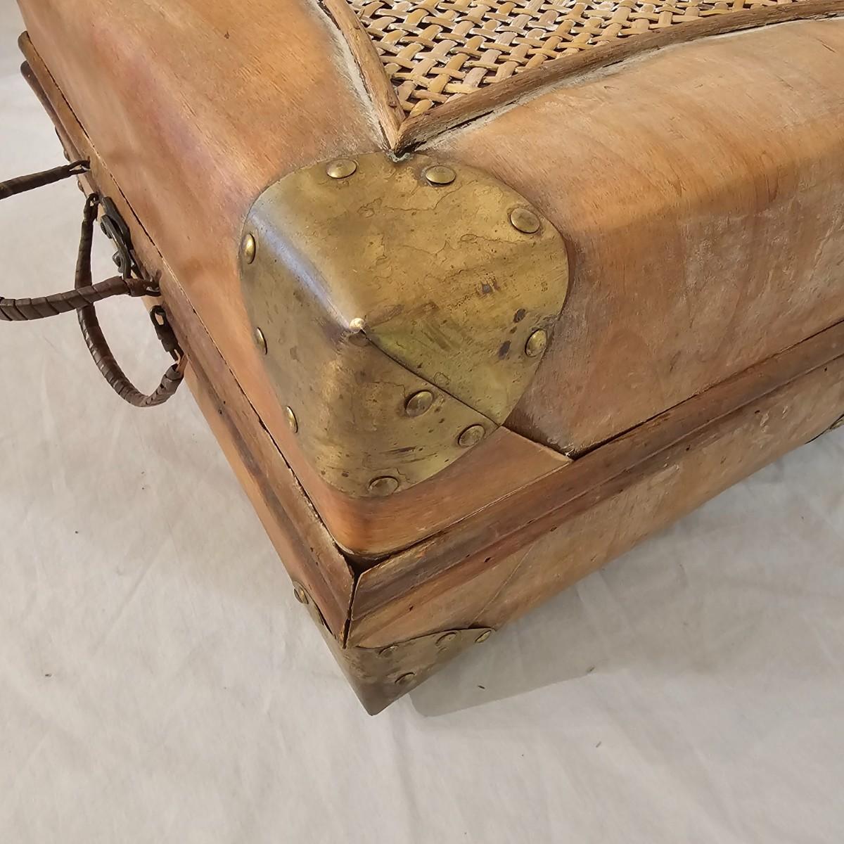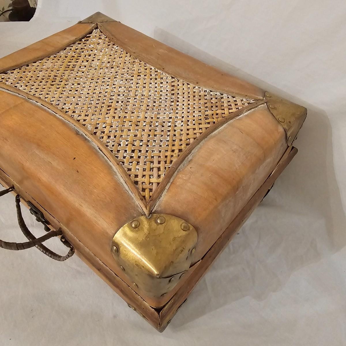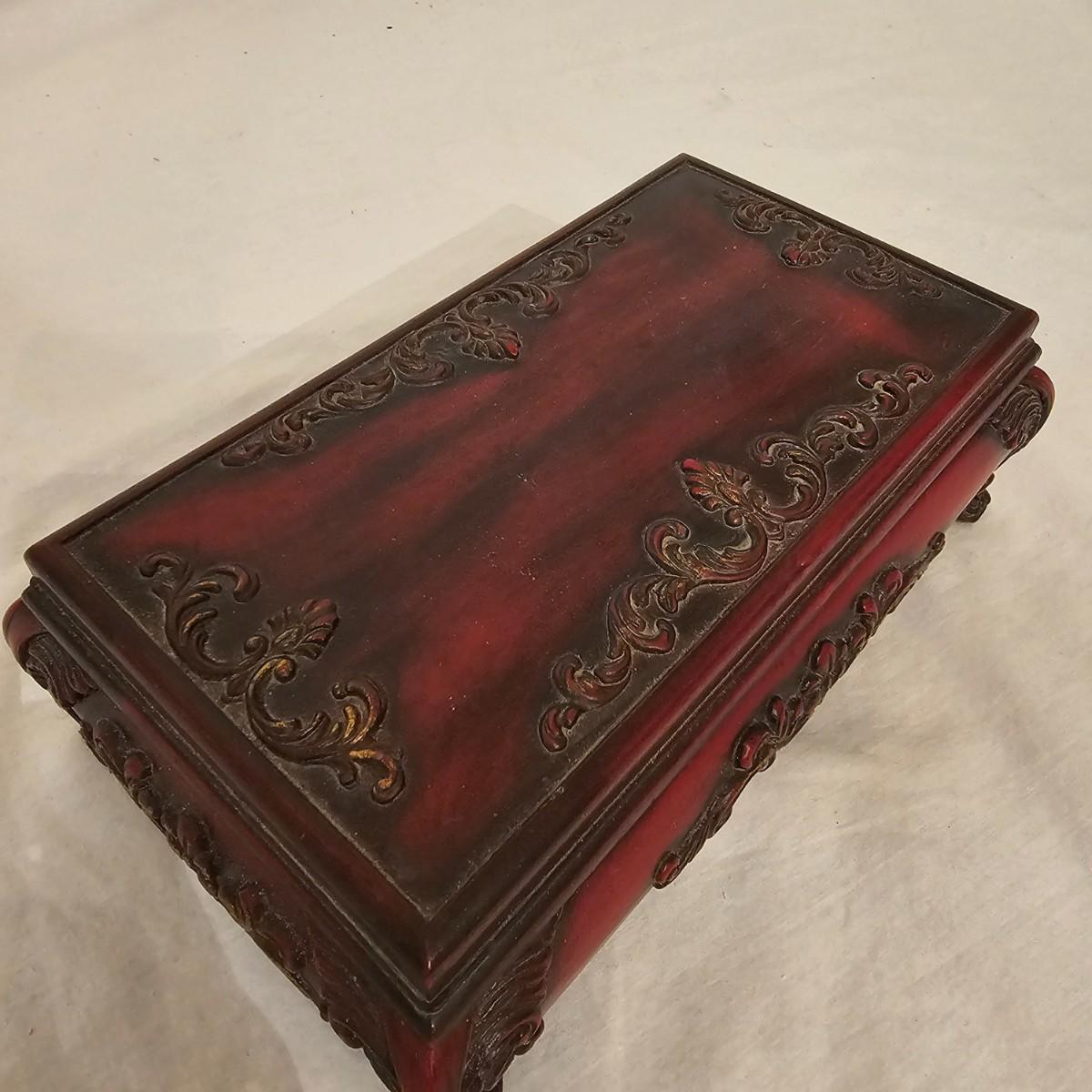 Six distinctive boxes in varying styles and shapes. Large suitcase style item has handles, wicker look inserts and metal corners. Measures 14" x 19" x 10"H. Long rectangle case is7.5" x 15" x 8"H. Oblong hassock style item has faux leather nail studded outside, measures 9" x 12" x 7"H. Flowered case with handle could be used for makeup, has removable tray and mirror in lid. Copper looking chest is metal, has clasp and raised design. Small flat box is embellished with scrollwork, has dark green faux felt interior. See photos for details. Local pickup only.