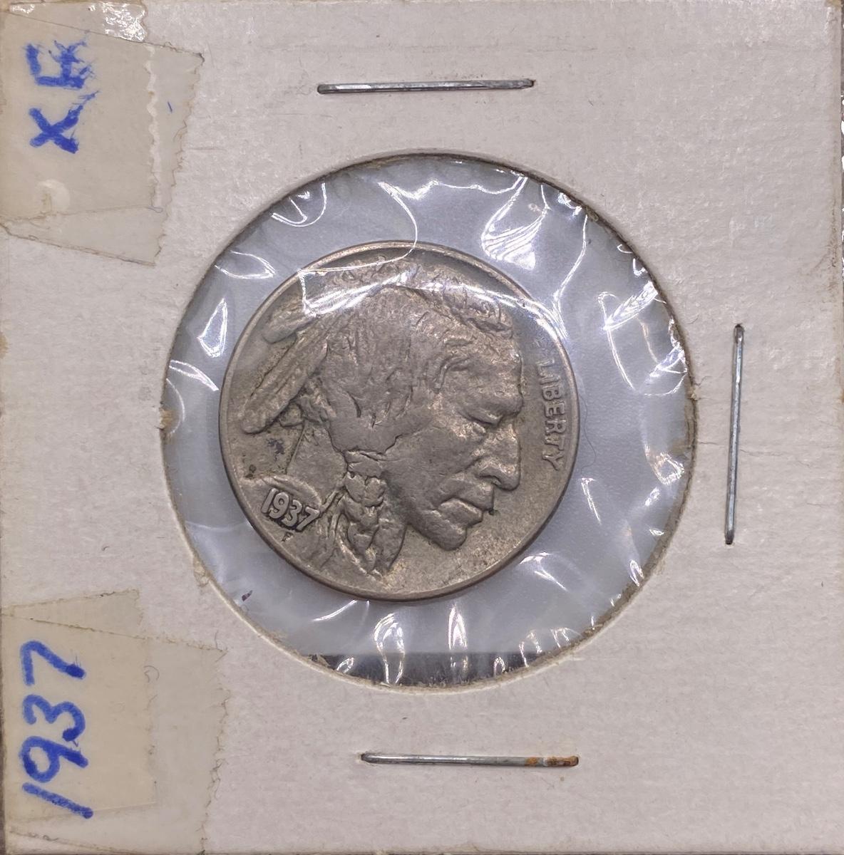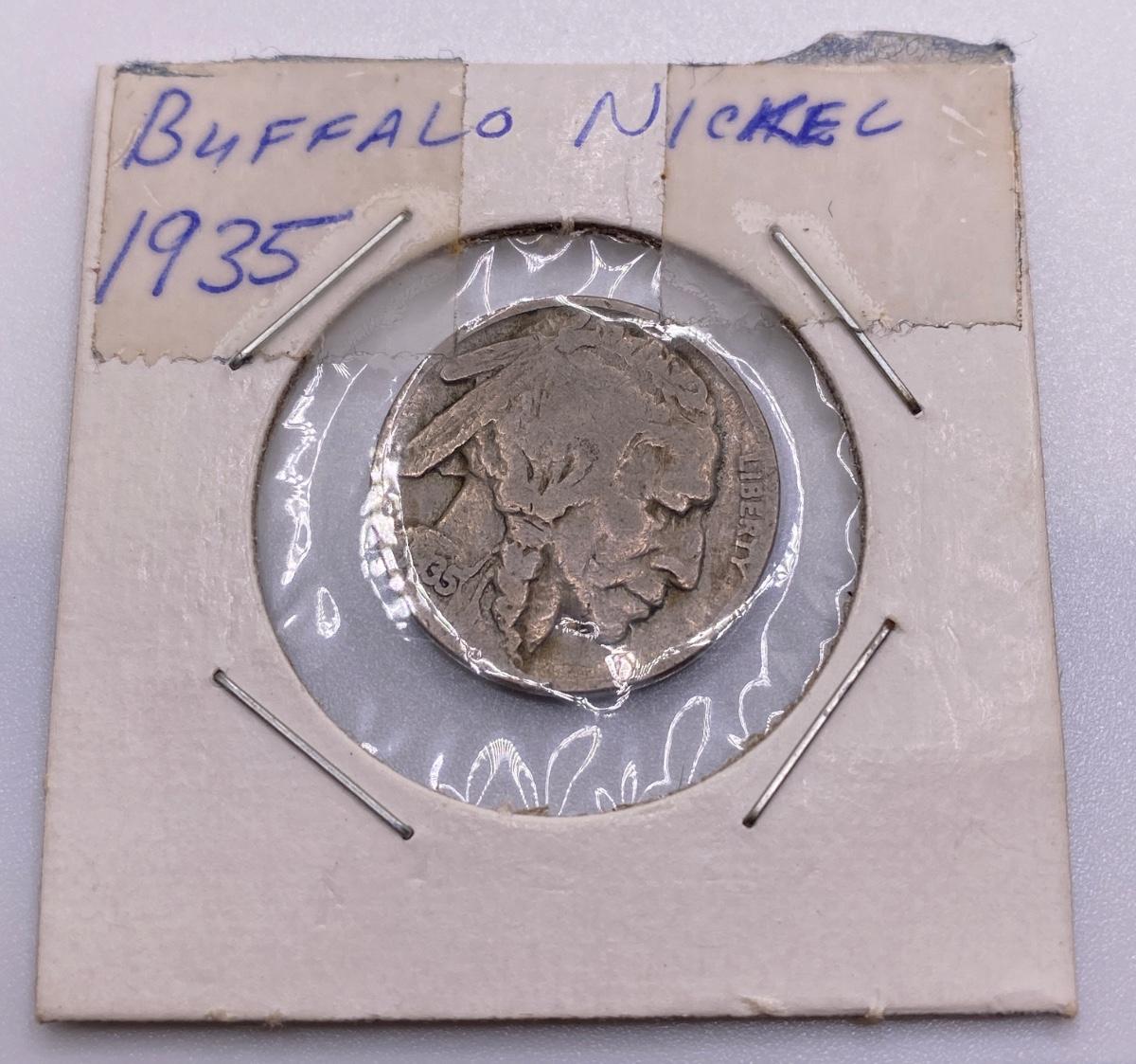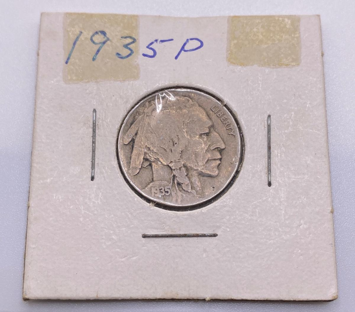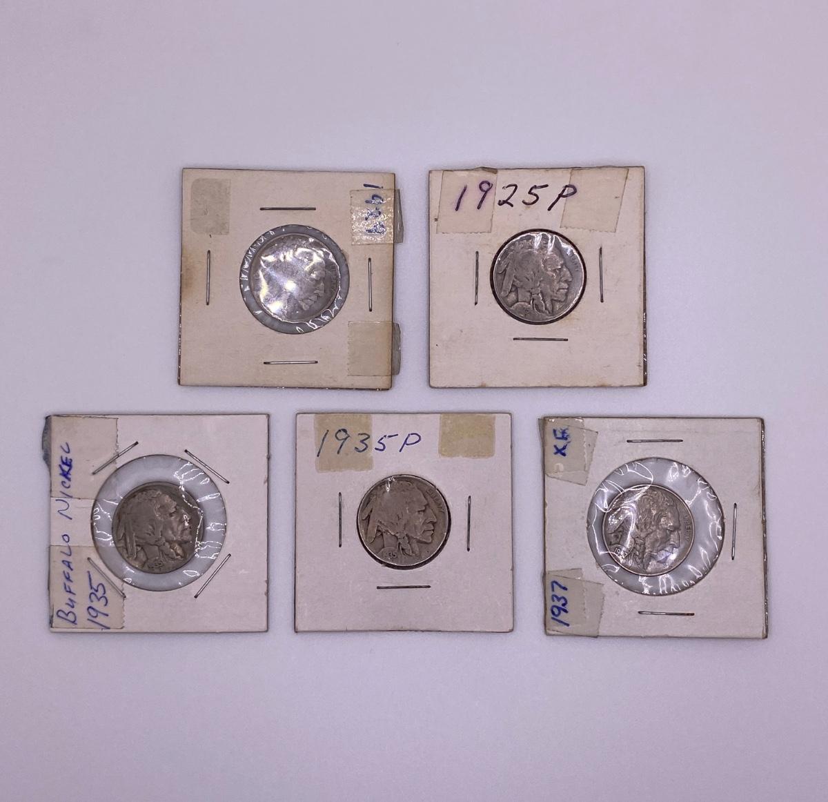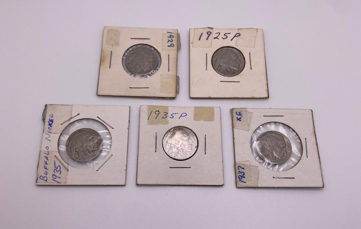 Collection of Buffalo Nickel Coins. Years Marked Include 1935, 1929, 1925 and 1937