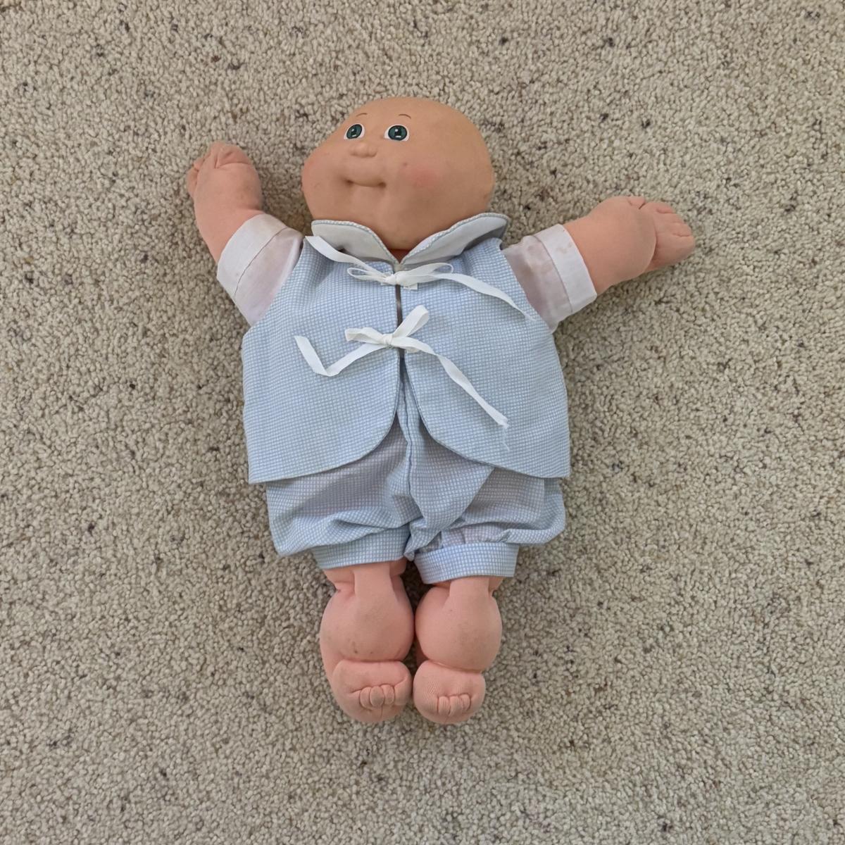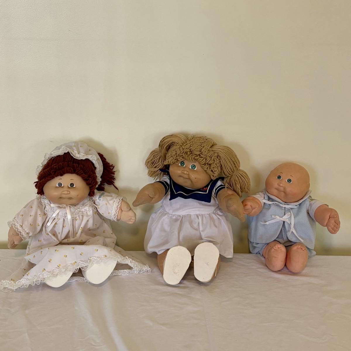 This lot has a collection of 3 Cabbage Patch kids which all appear to be fully clothed and in good condition. Two are girl dolls measuring approximately 16" long, and one baby boy doll measuring approximately 13" long. All dolls appear to be stamped on the back of the neck as an "Appalachian Art" product and have a Xavier Roberts signature on the back of the doll.