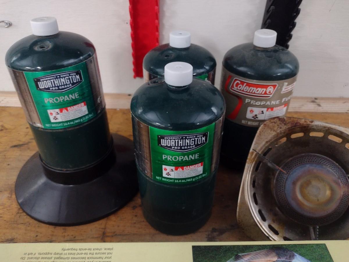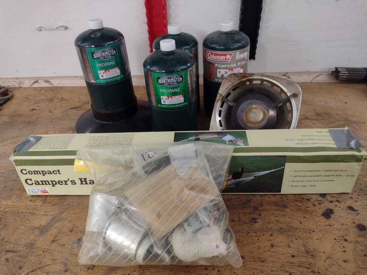 Collection of Camp Related Accessories. Unknown propane volume in tanks.