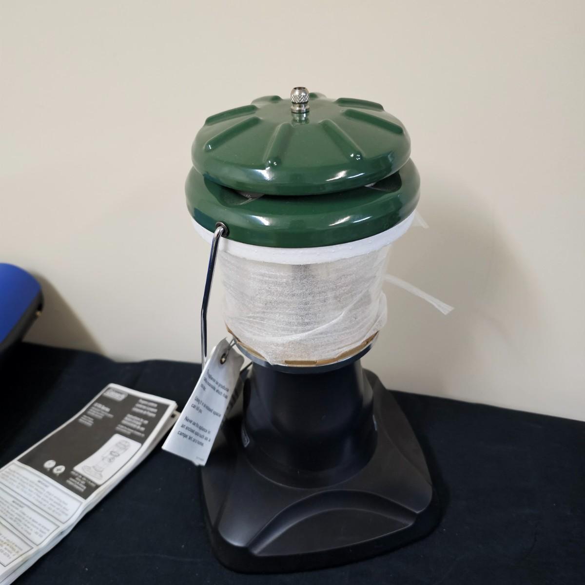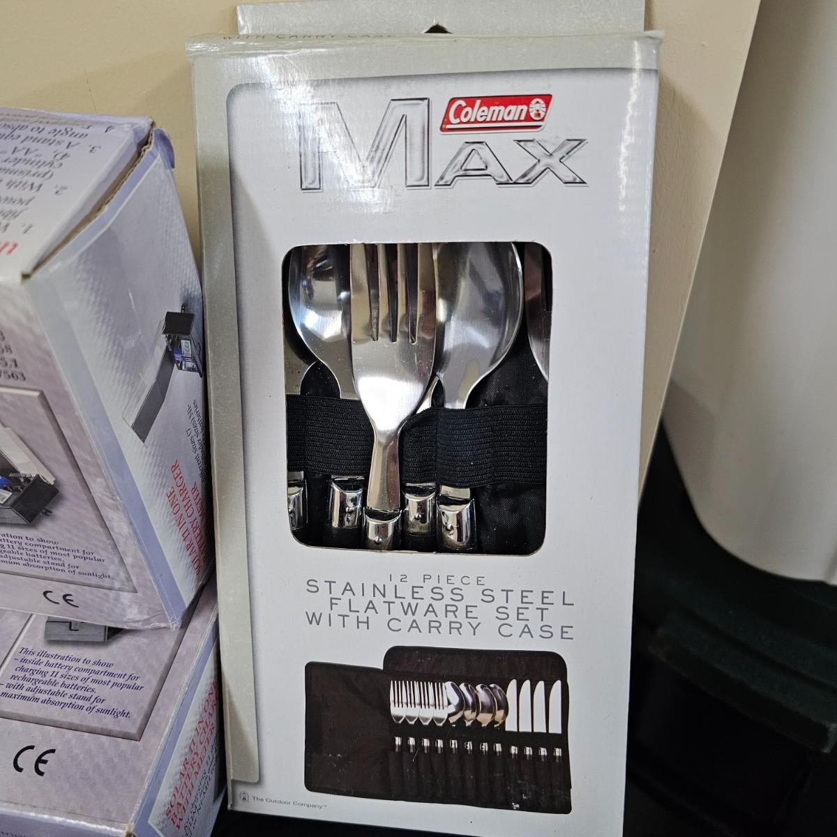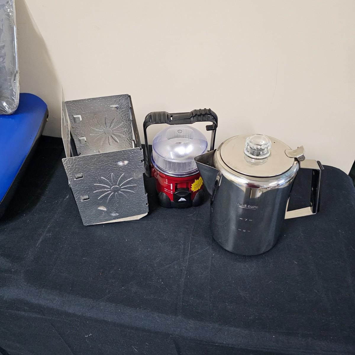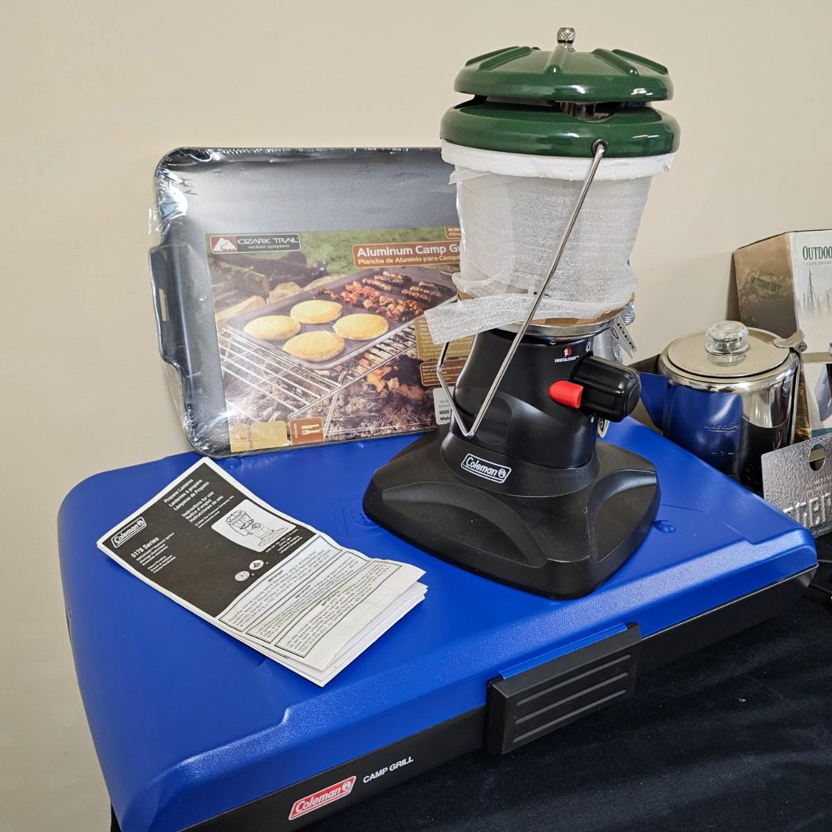 Camp stove, propane lantern, folding shovel, griddle and more. Coleman items include NIB propane stove, propane lantern, set of stainless flatware. Also one Outdoor Life NIB folding camp shovel. An older style stainless percolator coffee pot. Two NIB solar battery chargers. 16" x 10" camp griddle, tablecloth and battery lantern. Propane items not tested as are new. See photos for details. Local pickup only.