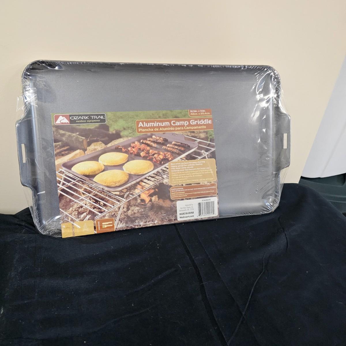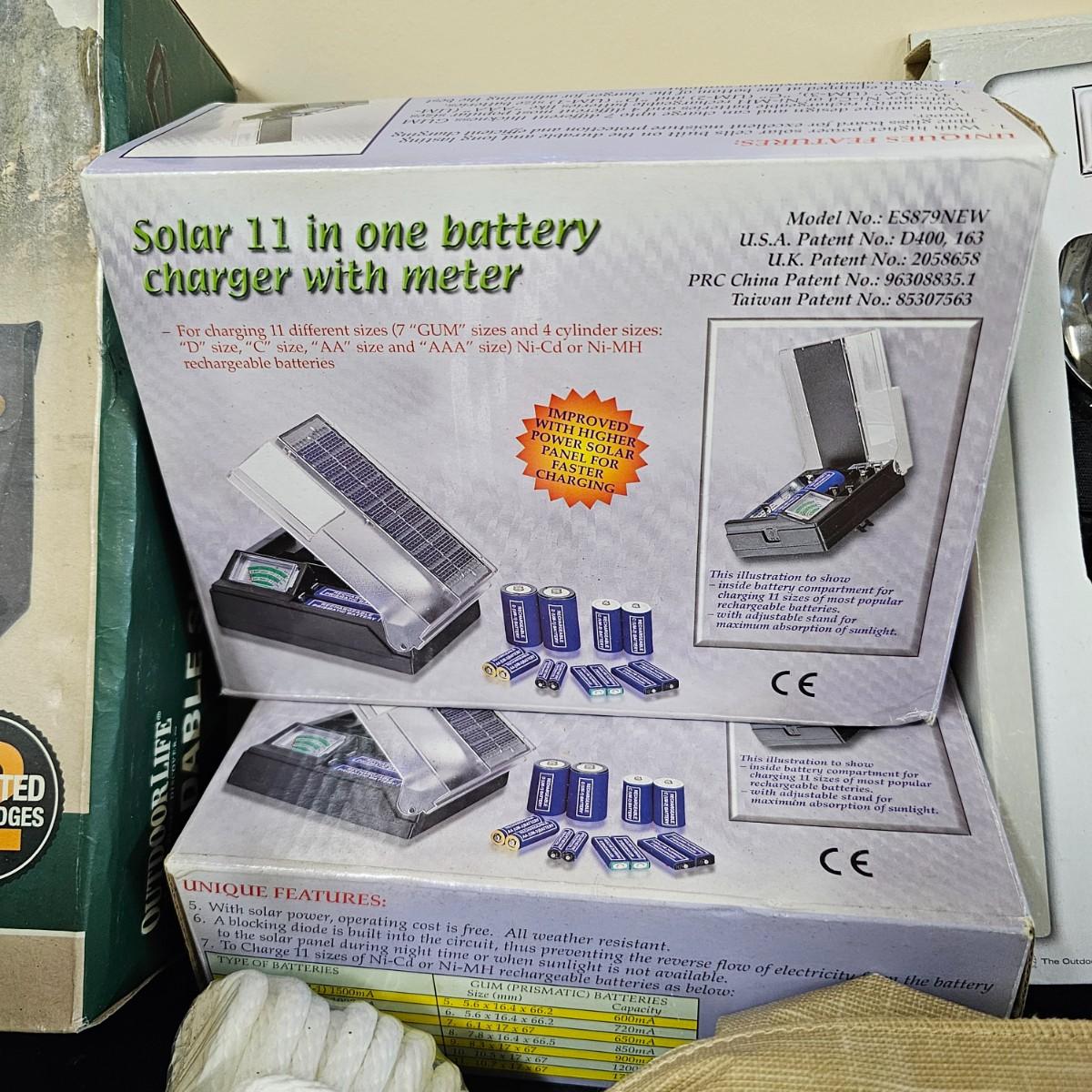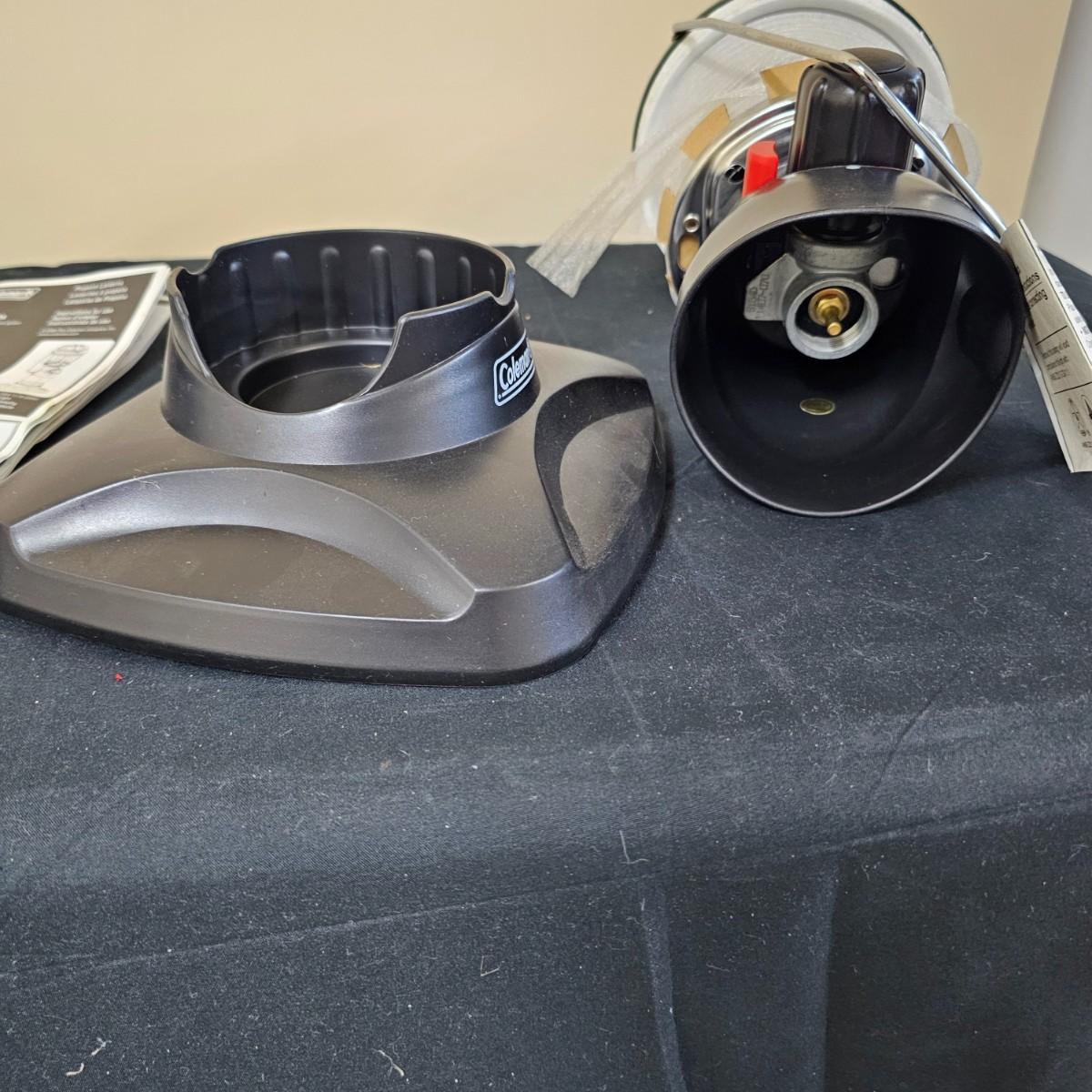 Camp stove, propane lantern, folding shovel, griddle and more. Coleman items include NIB propane stove, propane lantern, set of stainless flatware. Also one Outdoor Life NIB folding camp shovel. An older style stainless percolator coffee pot. Two NIB solar battery chargers. 16" x 10" camp griddle, tablecloth and battery lantern. Propane items not tested as are new. See photos for details. Local pickup only.