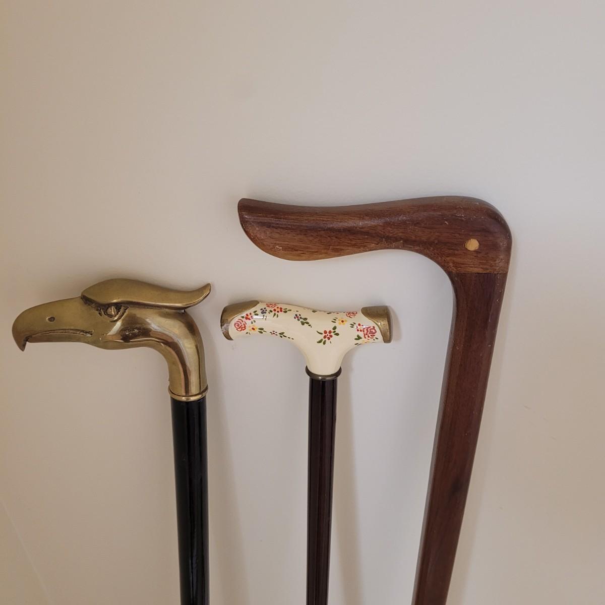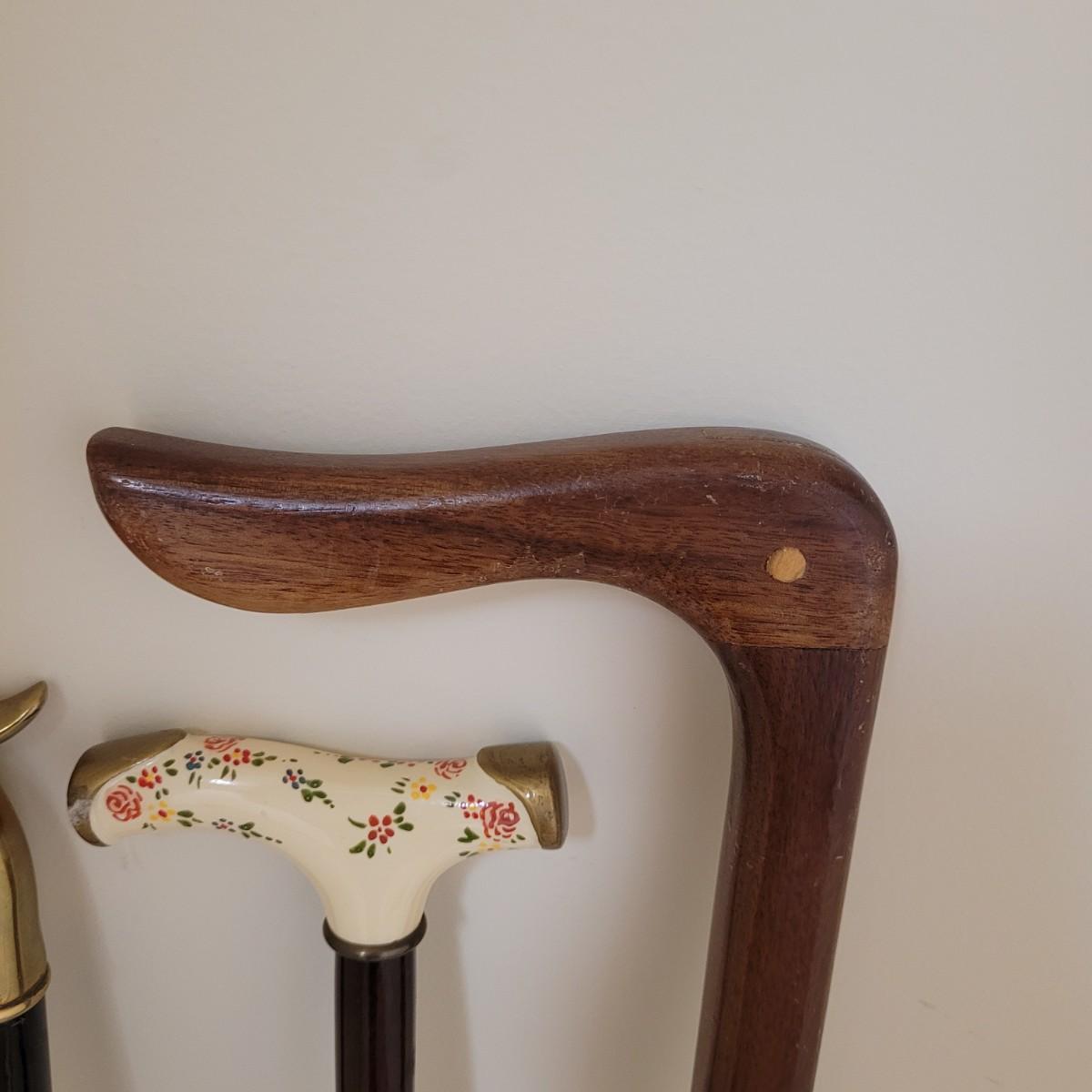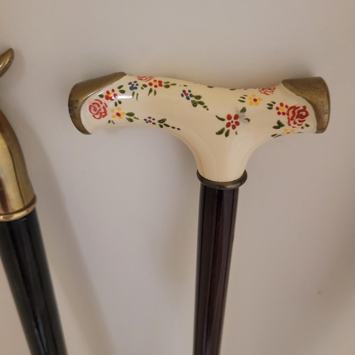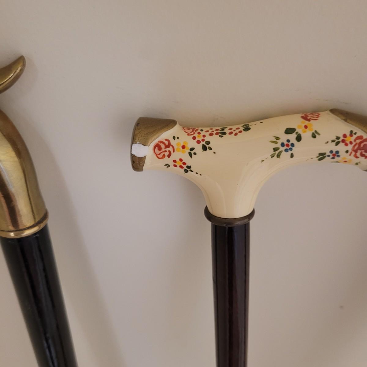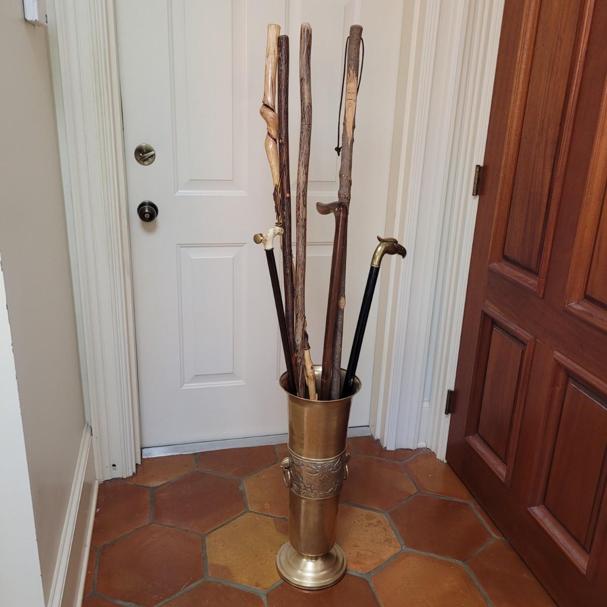 This collection of canes and walking sticks comes with a sturdy, decorative metal urn that appears to be brass. The cane with the floral painted handle has a chip (see photos). Walking stick with carved animals measures approximately 56” long. Urn measures approximately 8.5”DIA x 23”H. Local pickup only.