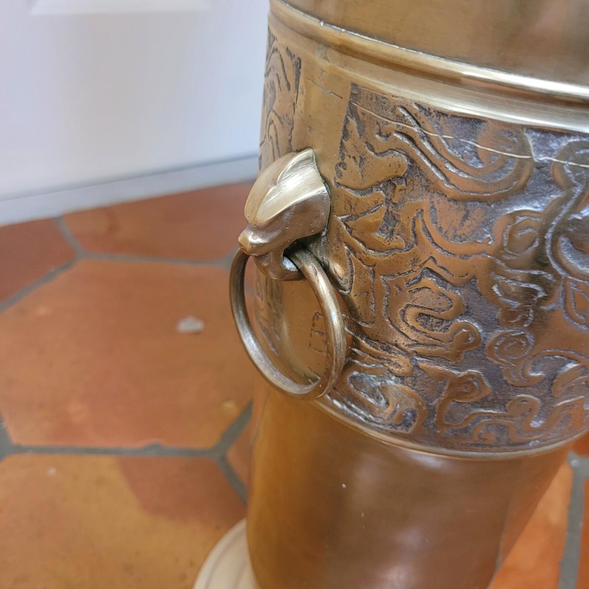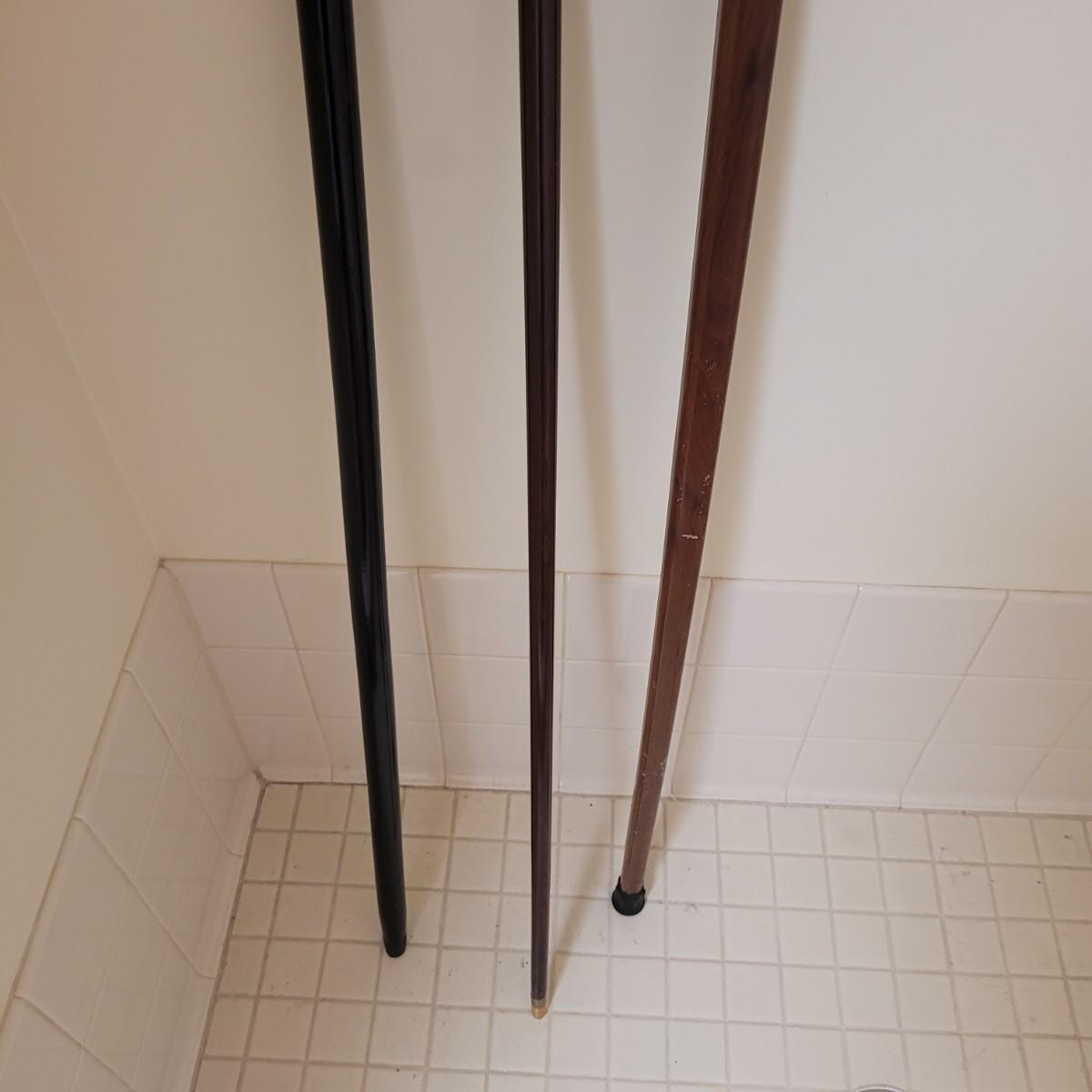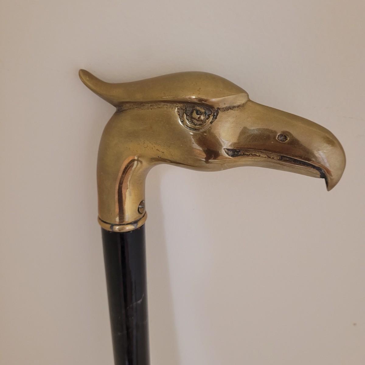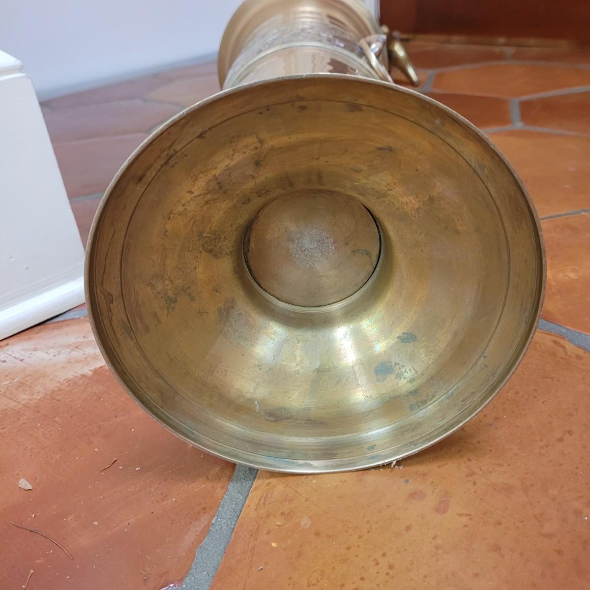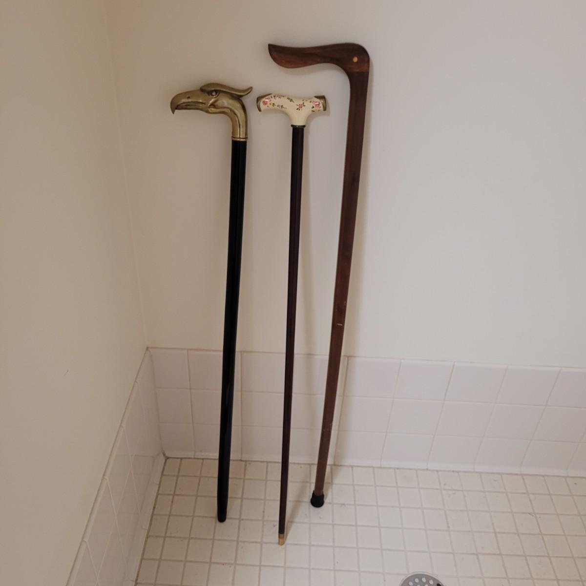 This collection of canes and walking sticks comes with a sturdy, decorative metal urn that appears to be brass. The cane with the floral painted handle has a chip (see photos). Walking stick with carved animals measures approximately 56” long. Urn measures approximately 8.5”DIA x 23”H. Local pickup only.