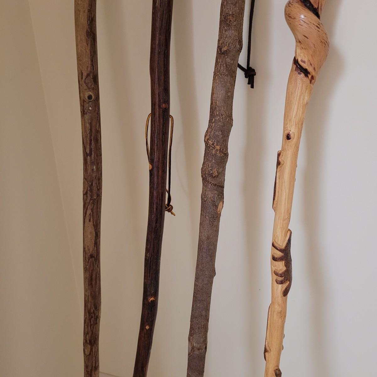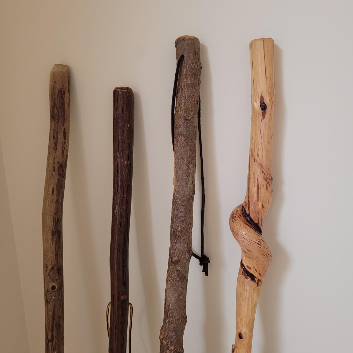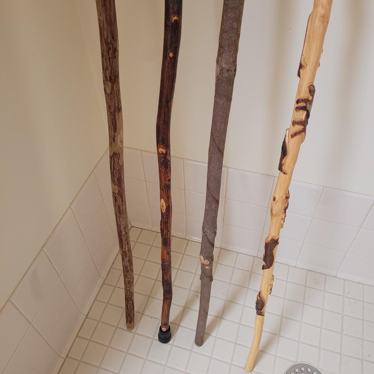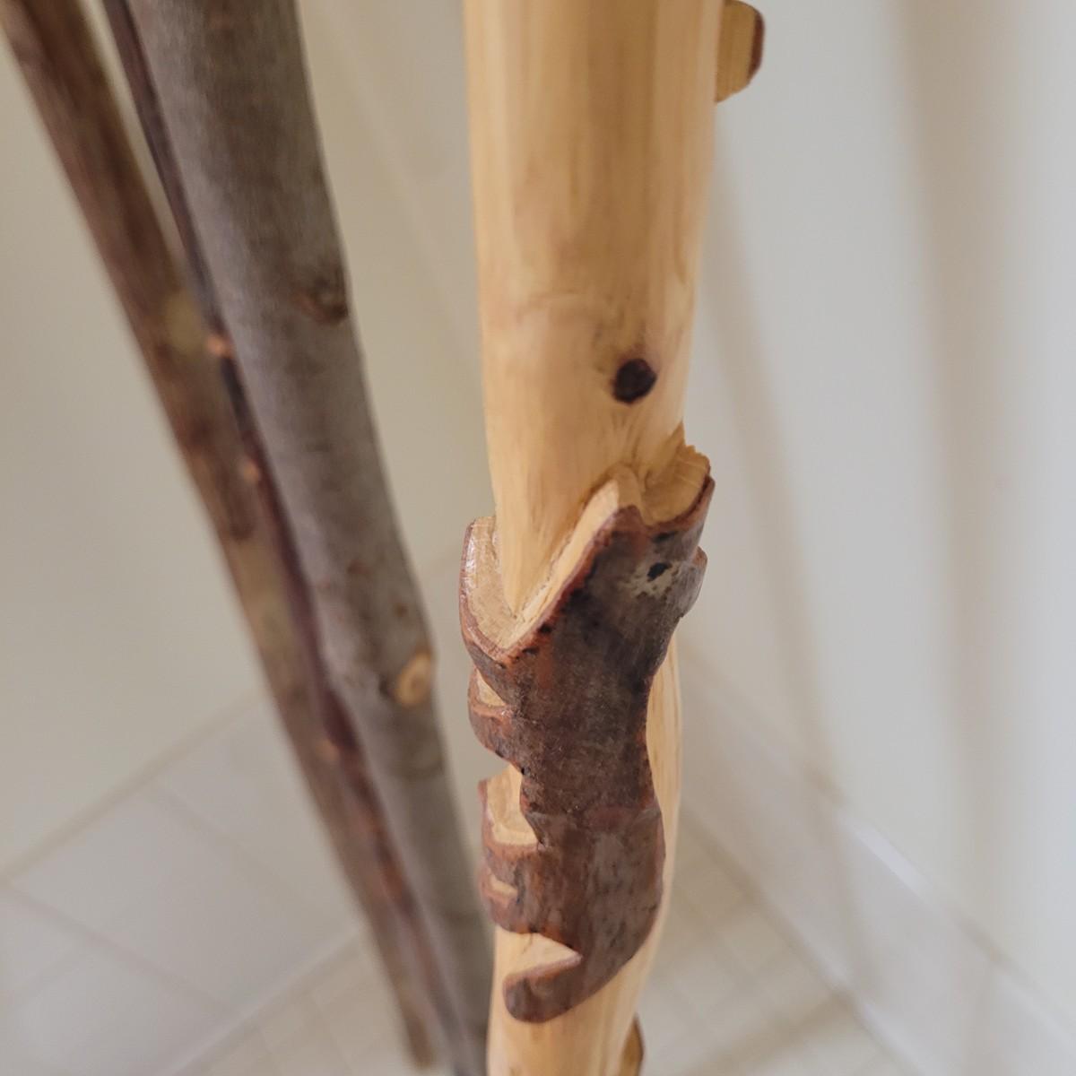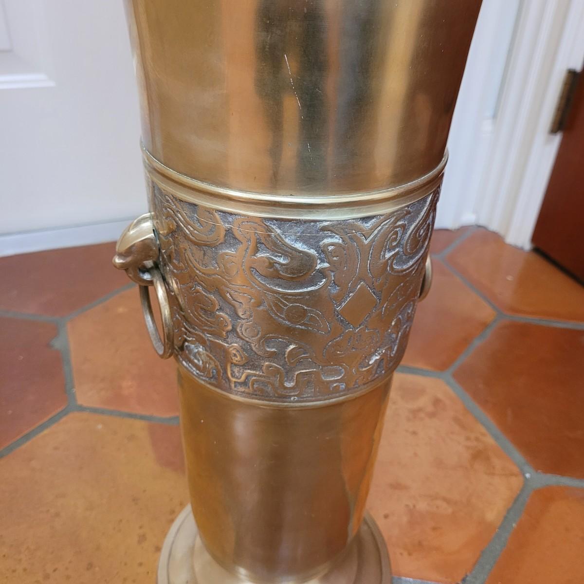 This collection of canes and walking sticks comes with a sturdy, decorative metal urn that appears to be brass. The cane with the floral painted handle has a chip (see photos). Walking stick with carved animals measures approximately 56” long. Urn measures approximately 8.5”DIA x 23”H. Local pickup only.