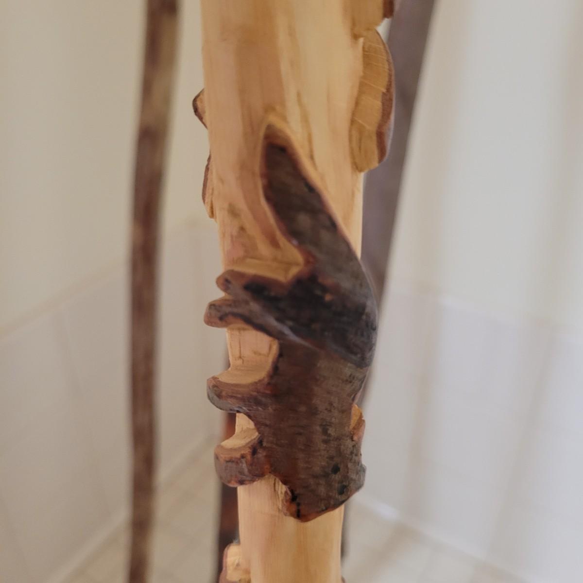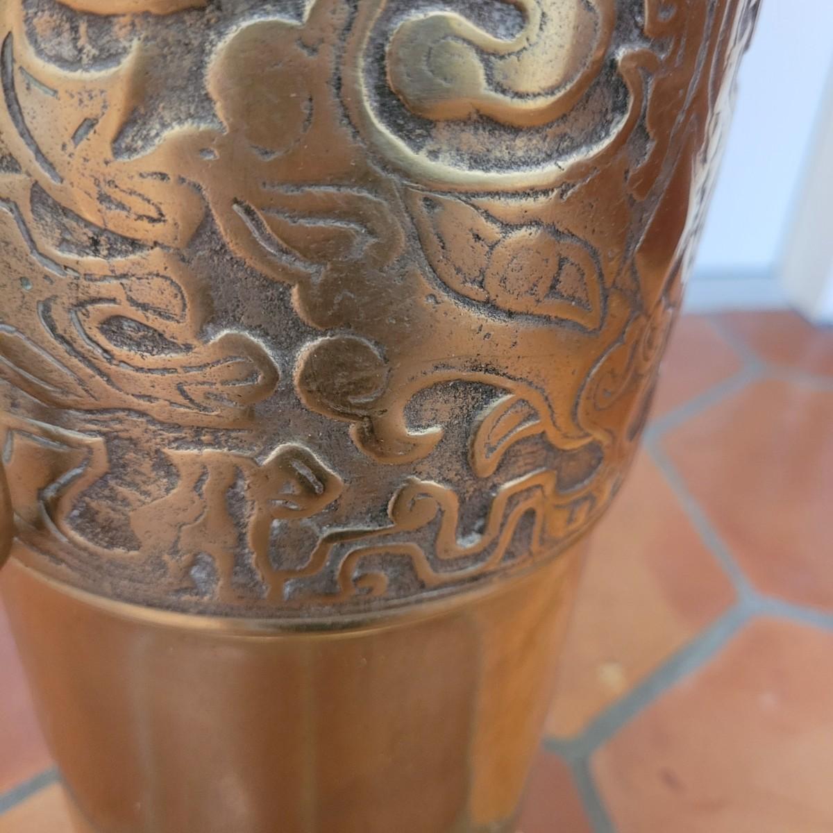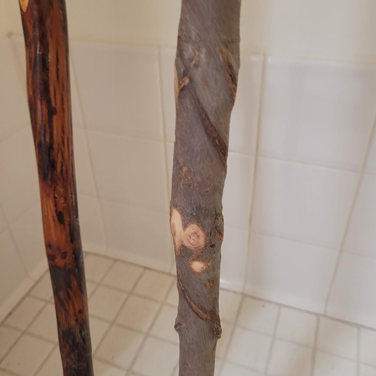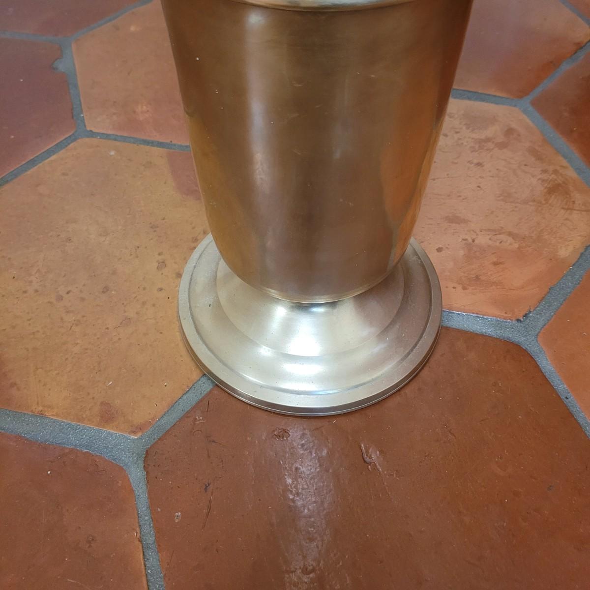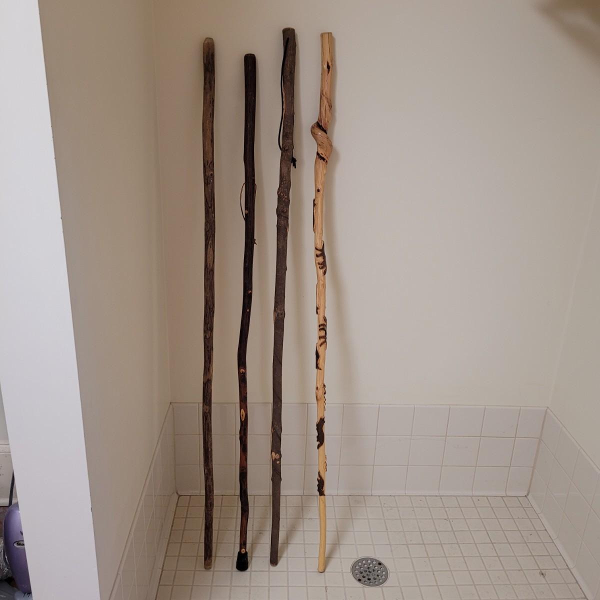 This collection of canes and walking sticks comes with a sturdy, decorative metal urn that appears to be brass. The cane with the floral painted handle has a chip (see photos). Walking stick with carved animals measures approximately 56” long. Urn measures approximately 8.5”DIA x 23”H. Local pickup only.