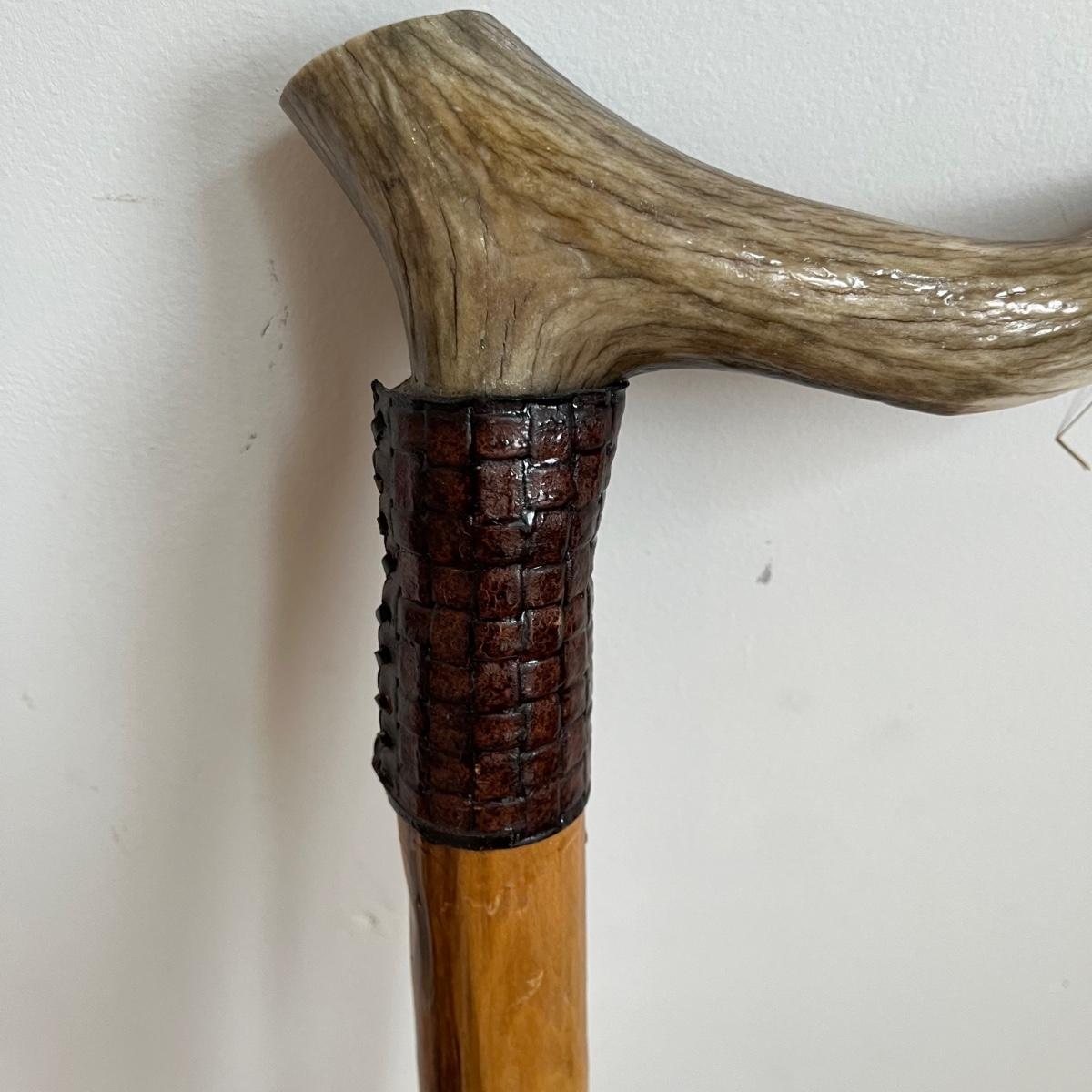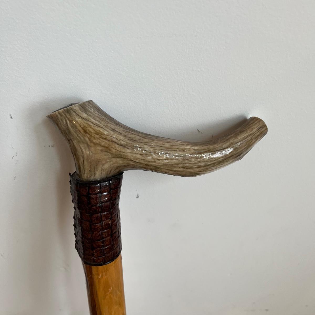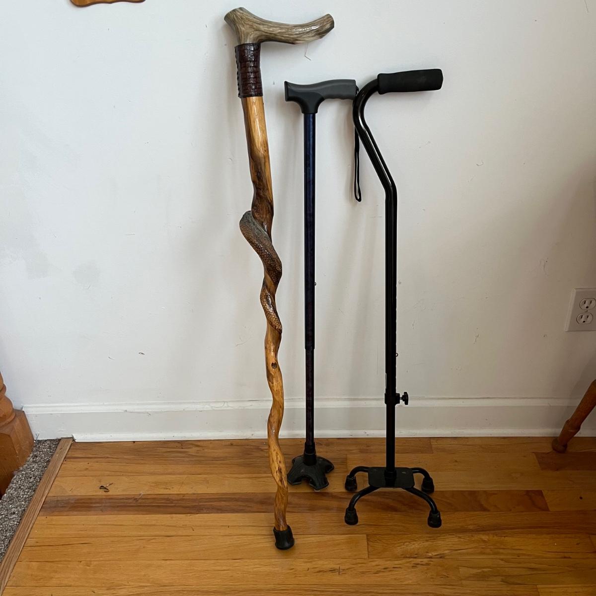 Lot includes a wooden cane with a antler for the handle, and two adjustable height metal canes with stable base.
