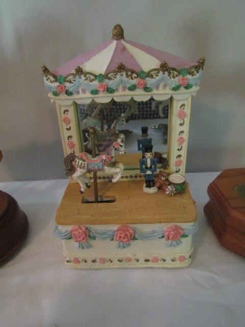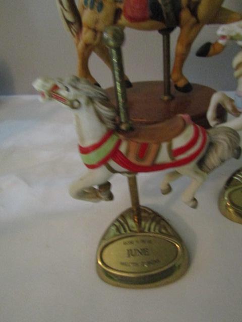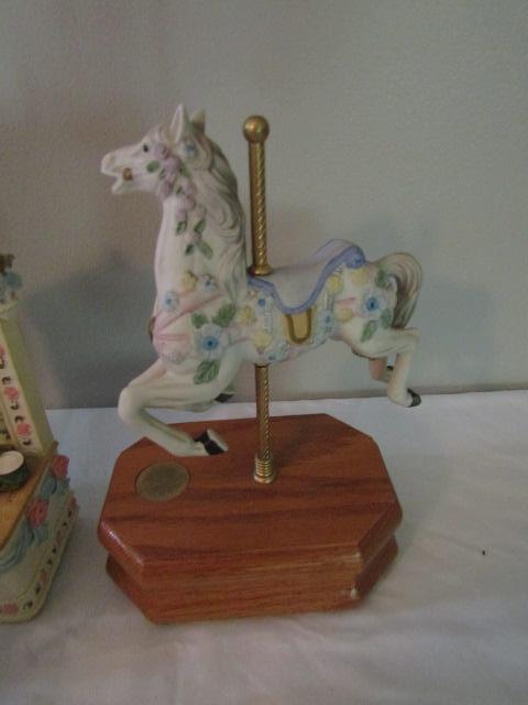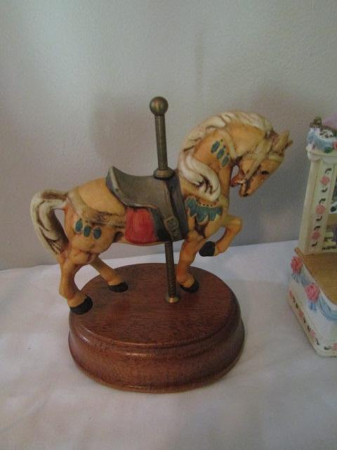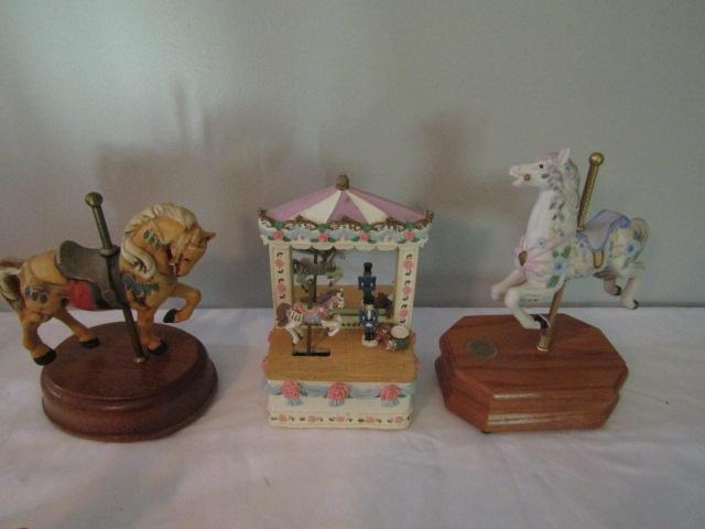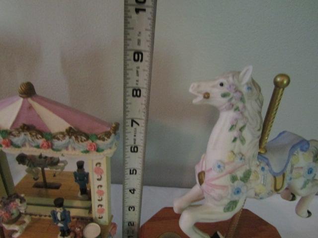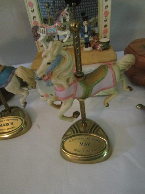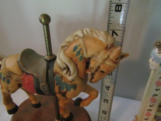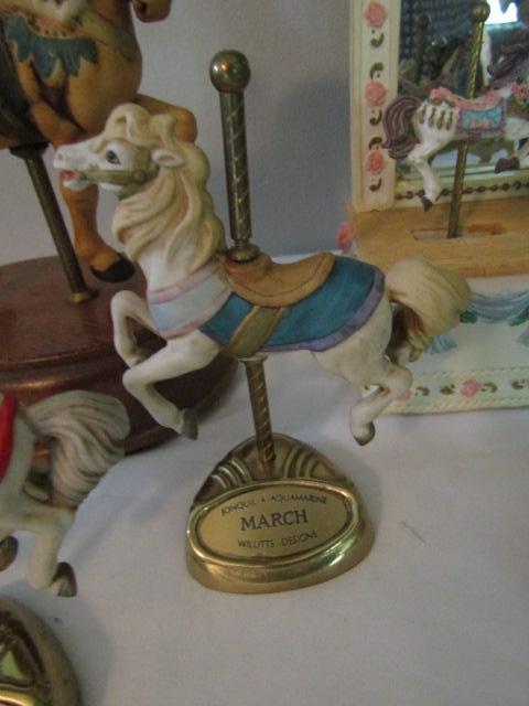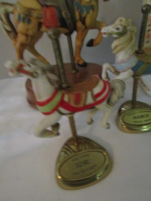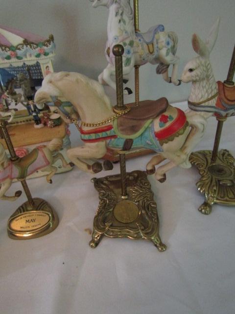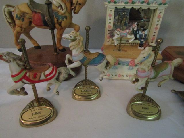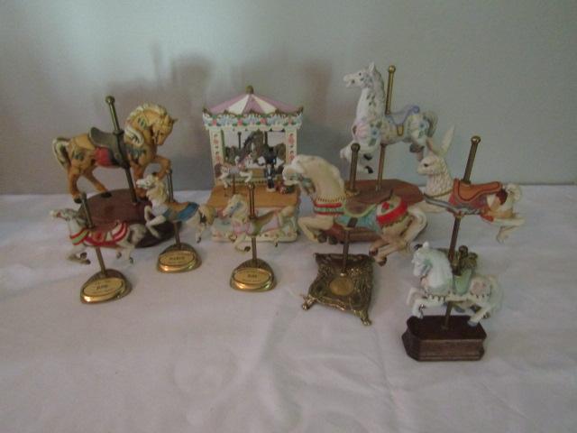 Collection of Carousel Horses- Various Sizes- Three in back of picture are music boxes.