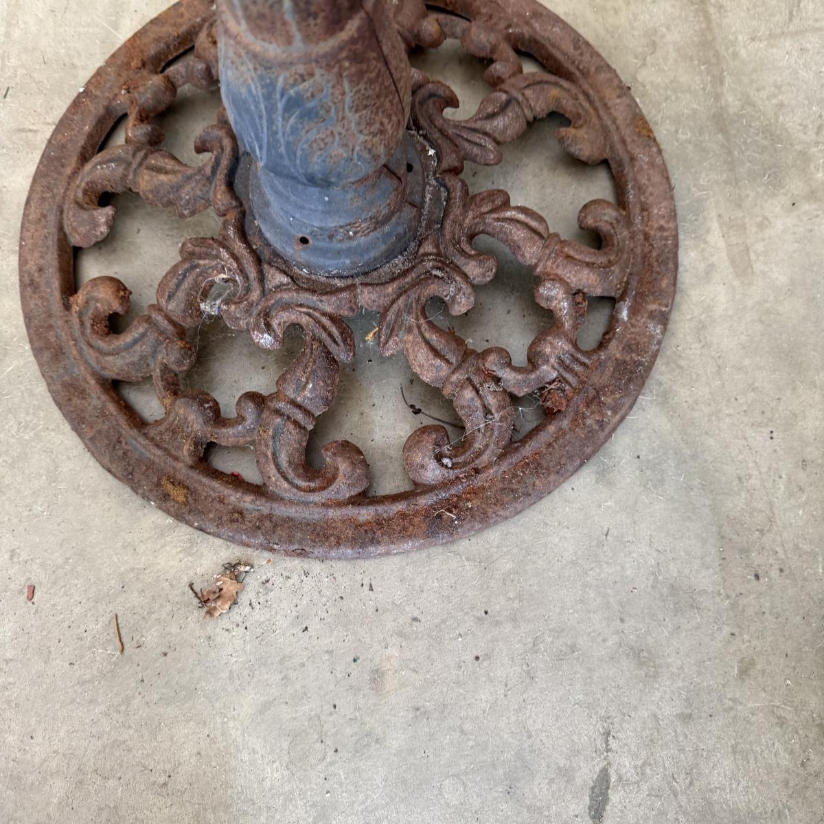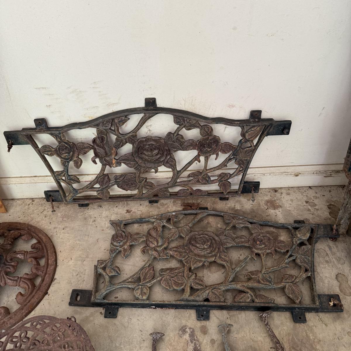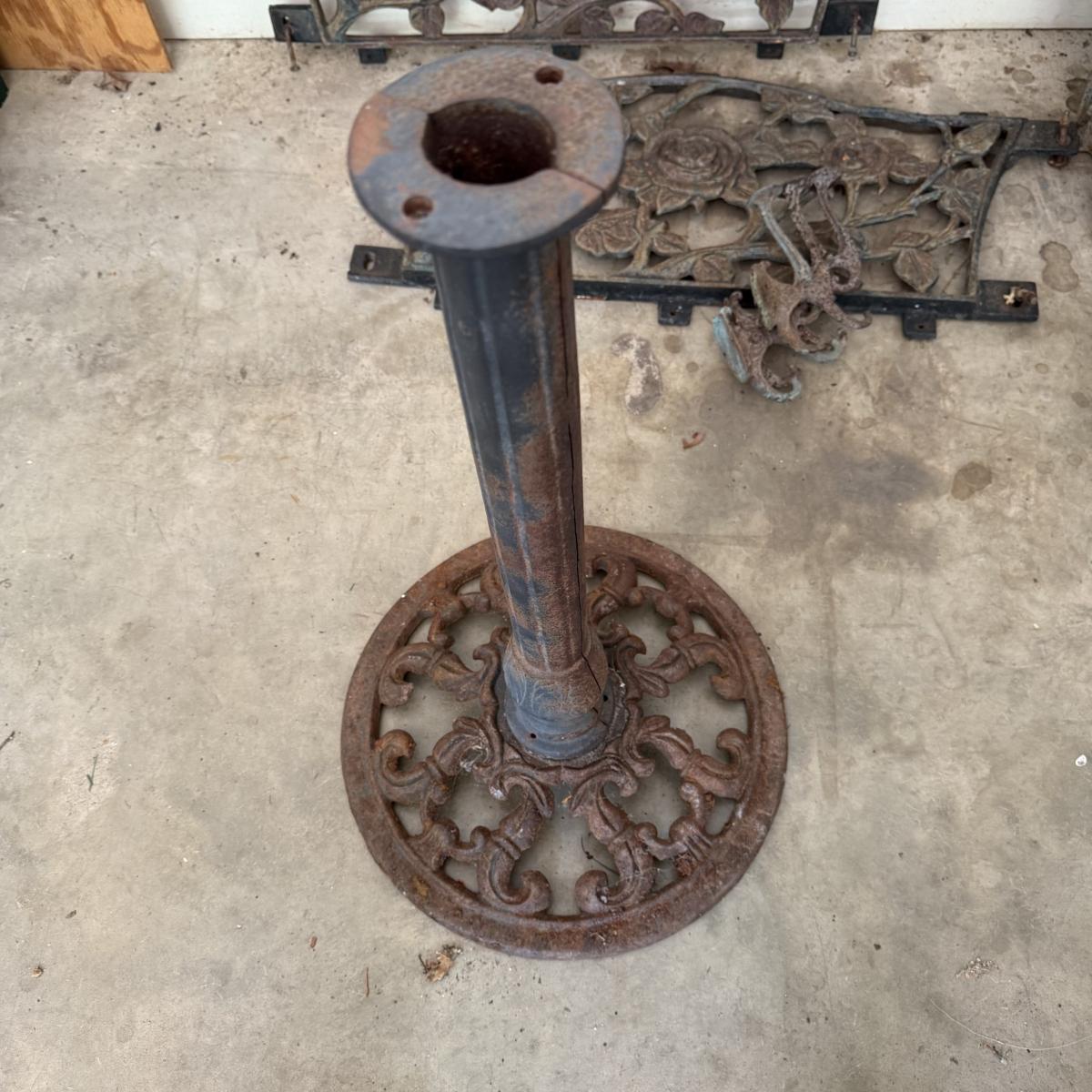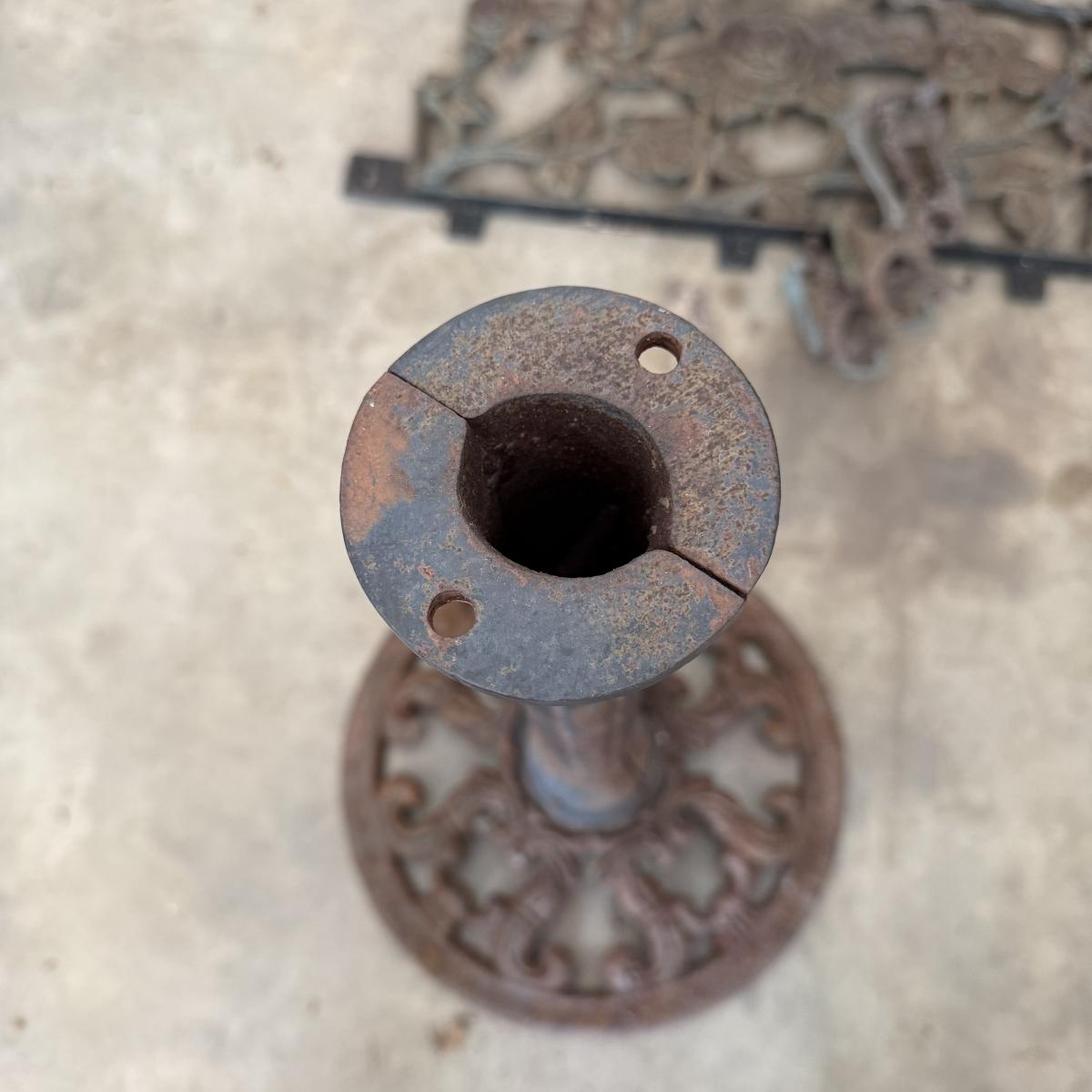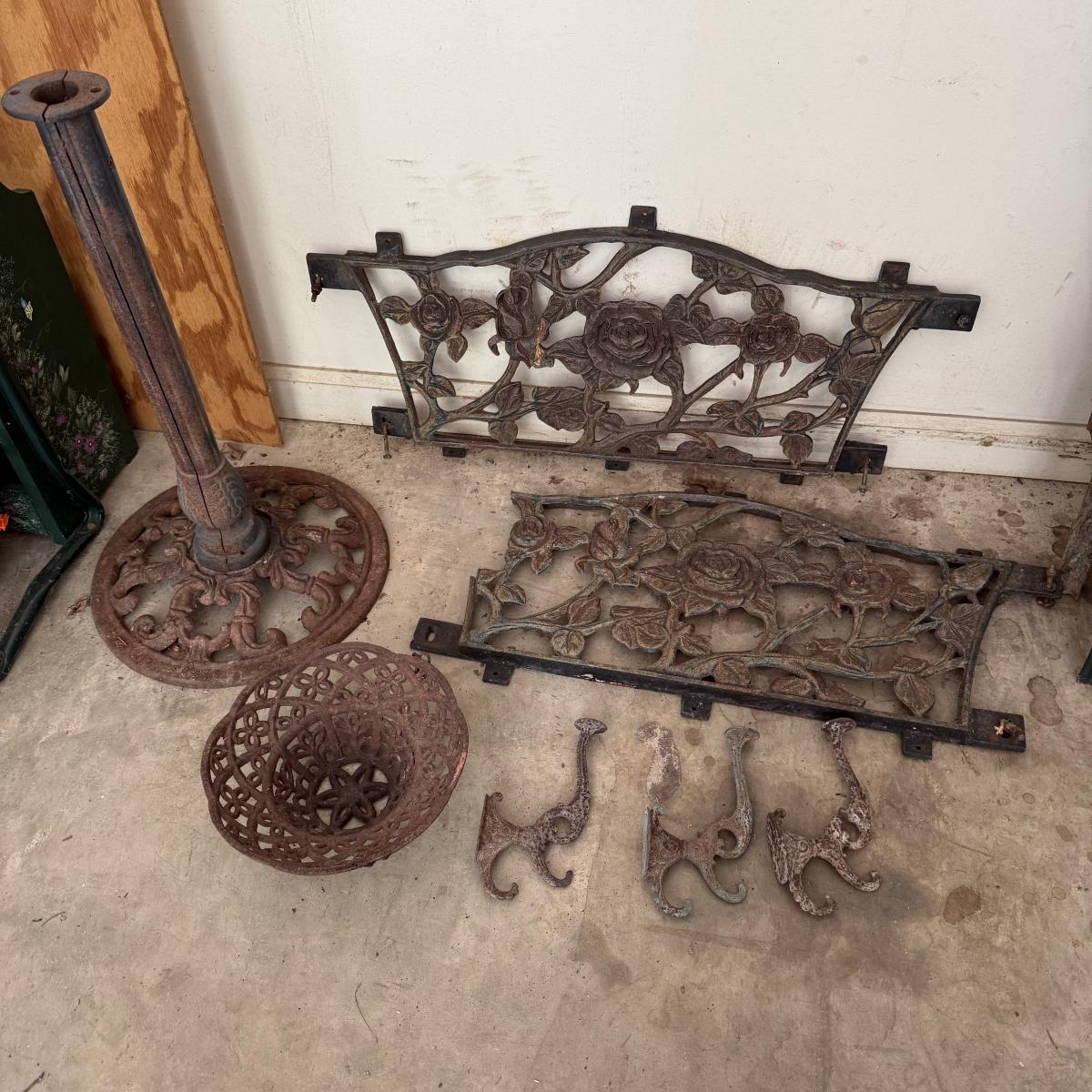 This lot contains a small collection of cast iron items. Included is a cast iron pedestal that could possibly hold a bird-feeder or umbrella, this item measures 16”D at the base and stands 23”H. Also included are two floral bench backs. One of them appears to be missing a corner, see pictures for details. Also included is an ornate bowl or plant holder as well as three iron hooks. The bowl measures 10”D x 3”H. Items are rusted.
