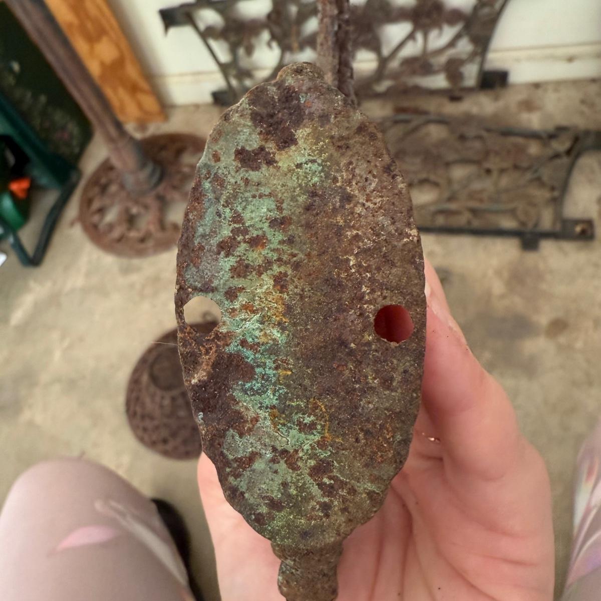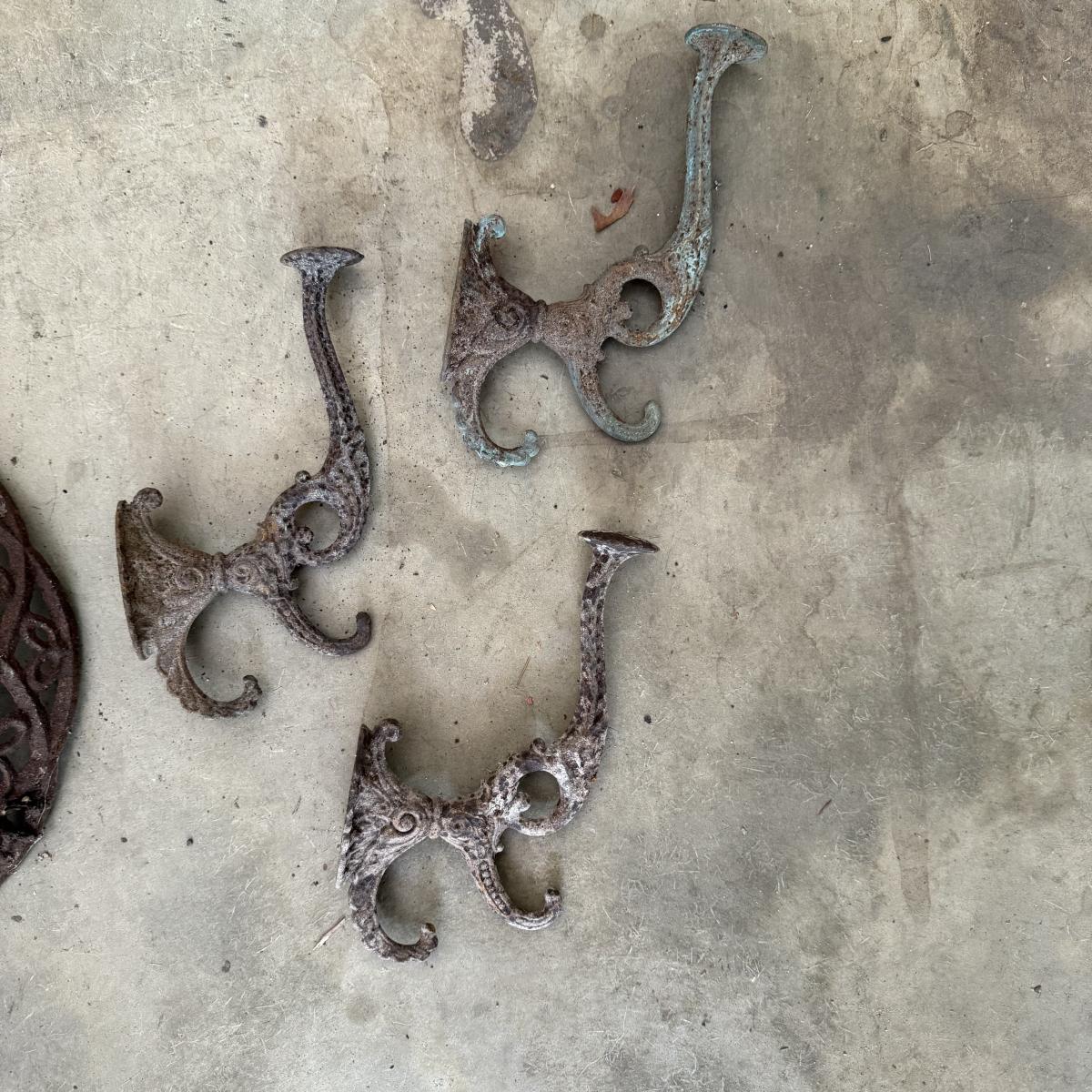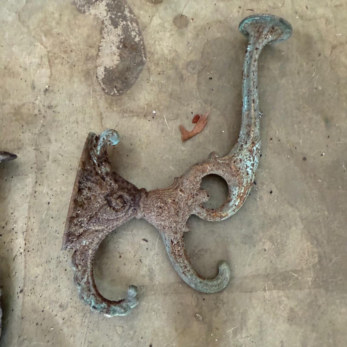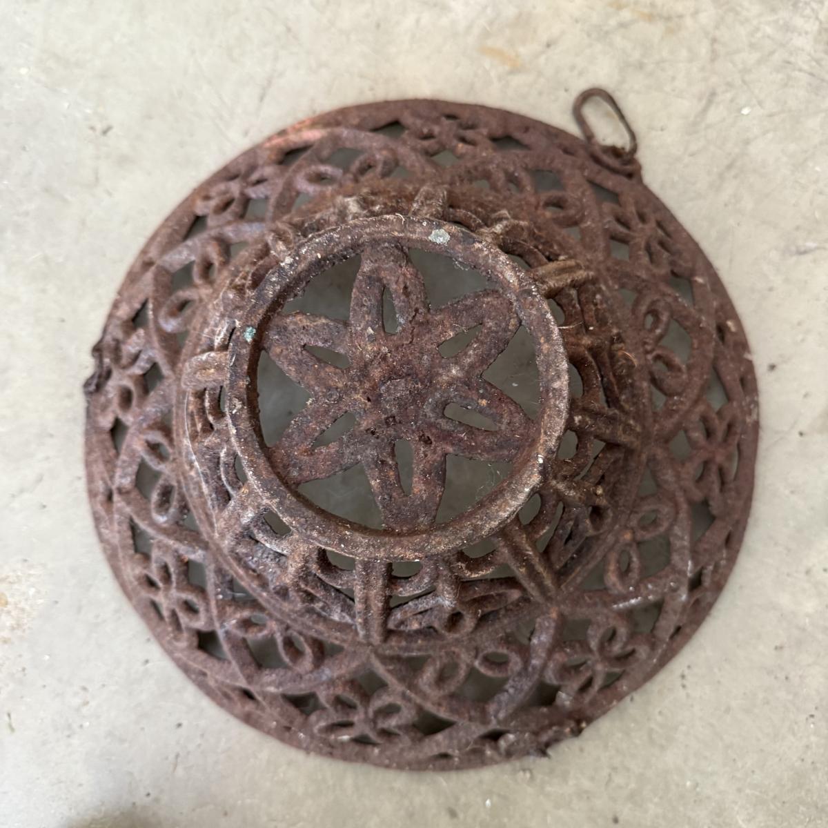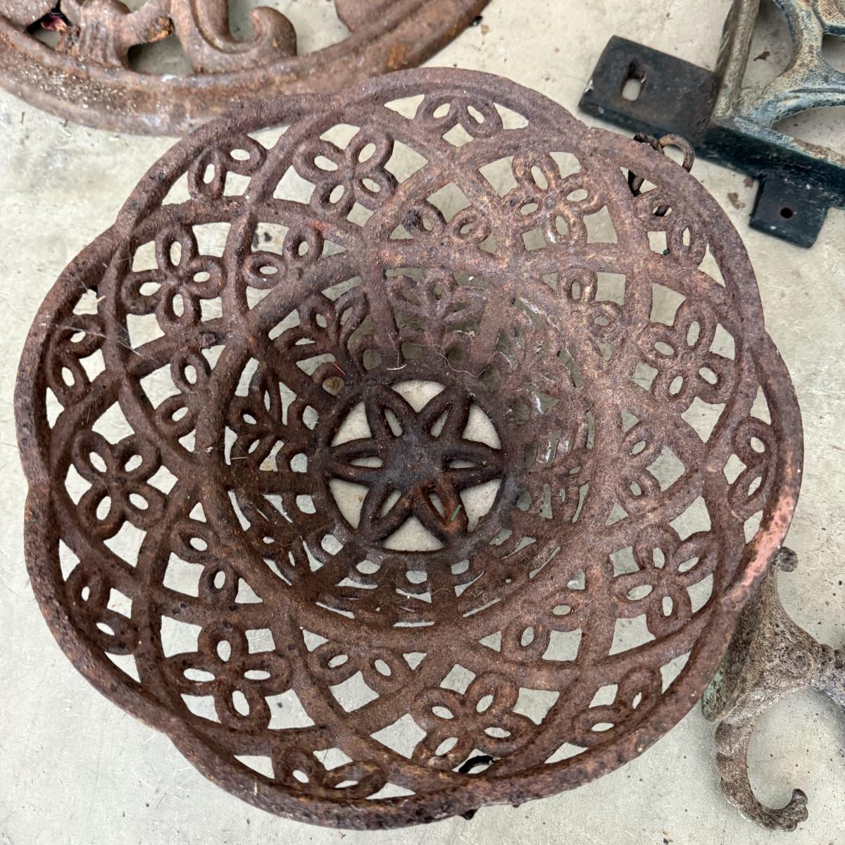 This lot contains a small collection of cast iron items. Included is a cast iron pedestal that could possibly hold a bird-feeder or umbrella, this item measures 16”D at the base and stands 23”H. Also included are two floral bench backs. One of them appears to be missing a corner, see pictures for details. Also included is an ornate bowl or plant holder as well as three iron hooks. The bowl measures 10”D x 3”H. Items are rusted.