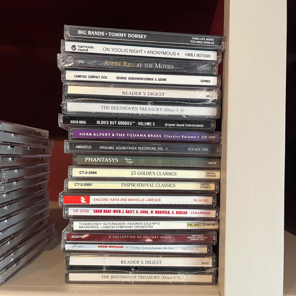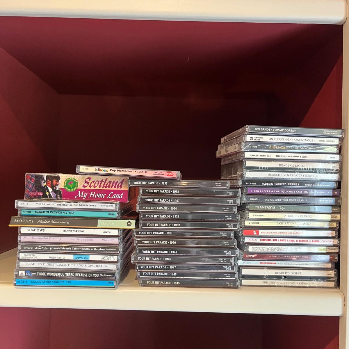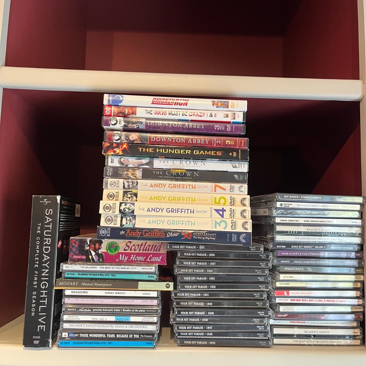 Lot contains a collection of CDs & DVDs including over forty CDs with most being from the 50s and over 10 DVDs including Saturday Night Live season One, four seasons of Andy Griffith and more.