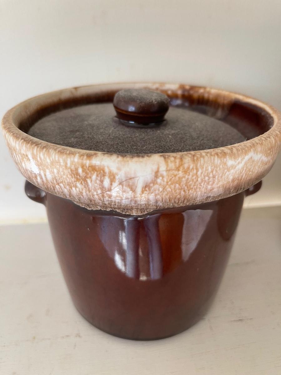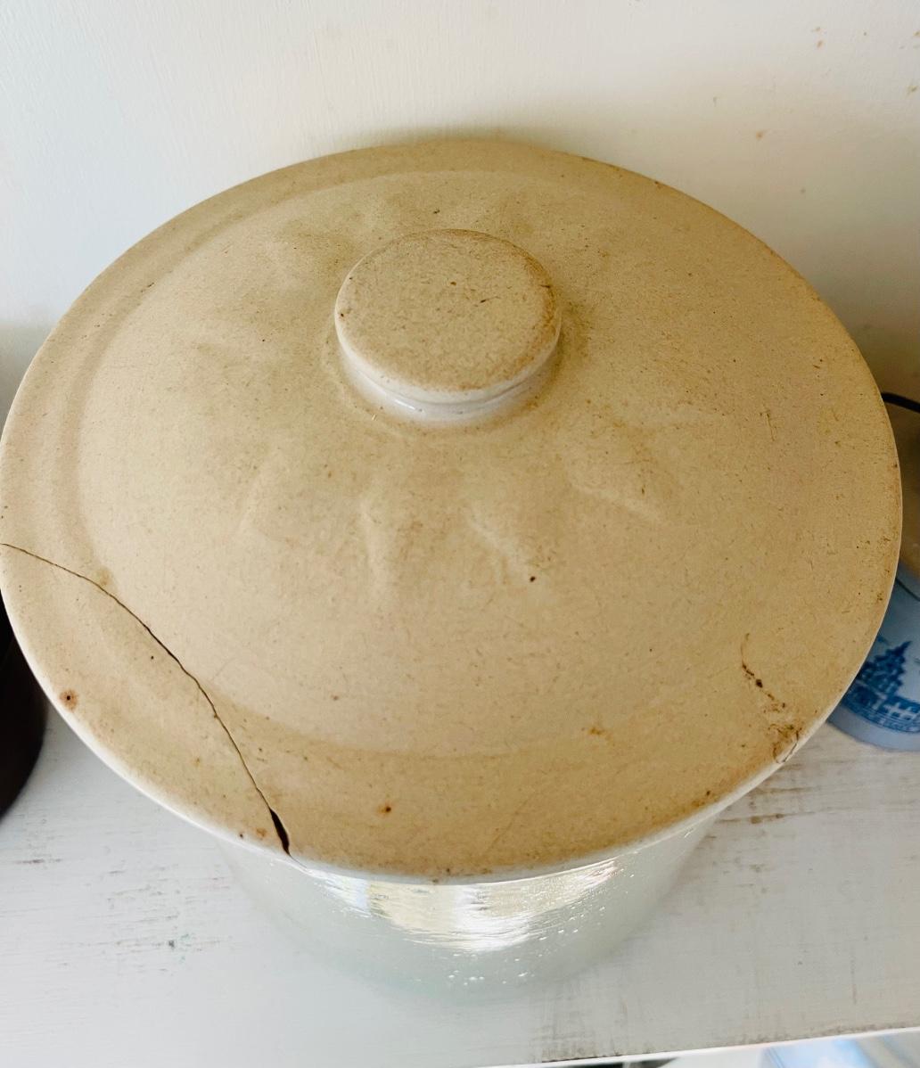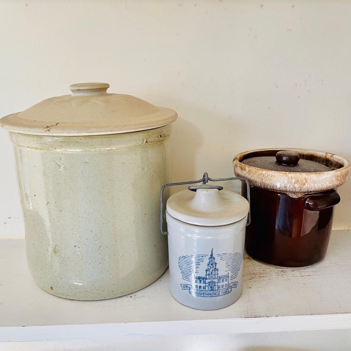 Three miscellaneous crocks. Large Stoneware Crock 8”HX8”D, has a crack on lid. Brown McCoy Crock measures 5”HX6”D and blue and white crock has metal lid press but seal is missing. Shipping available.