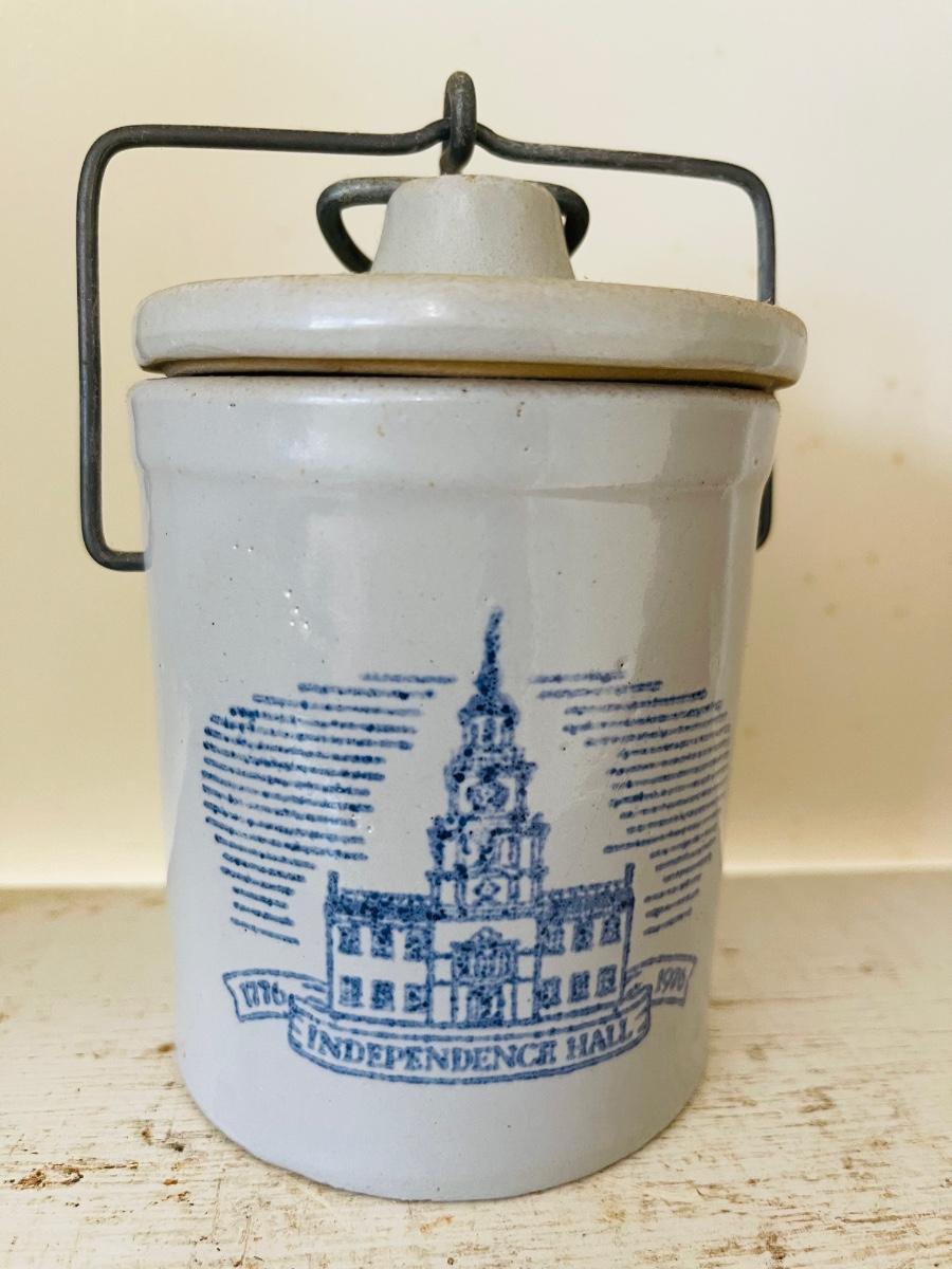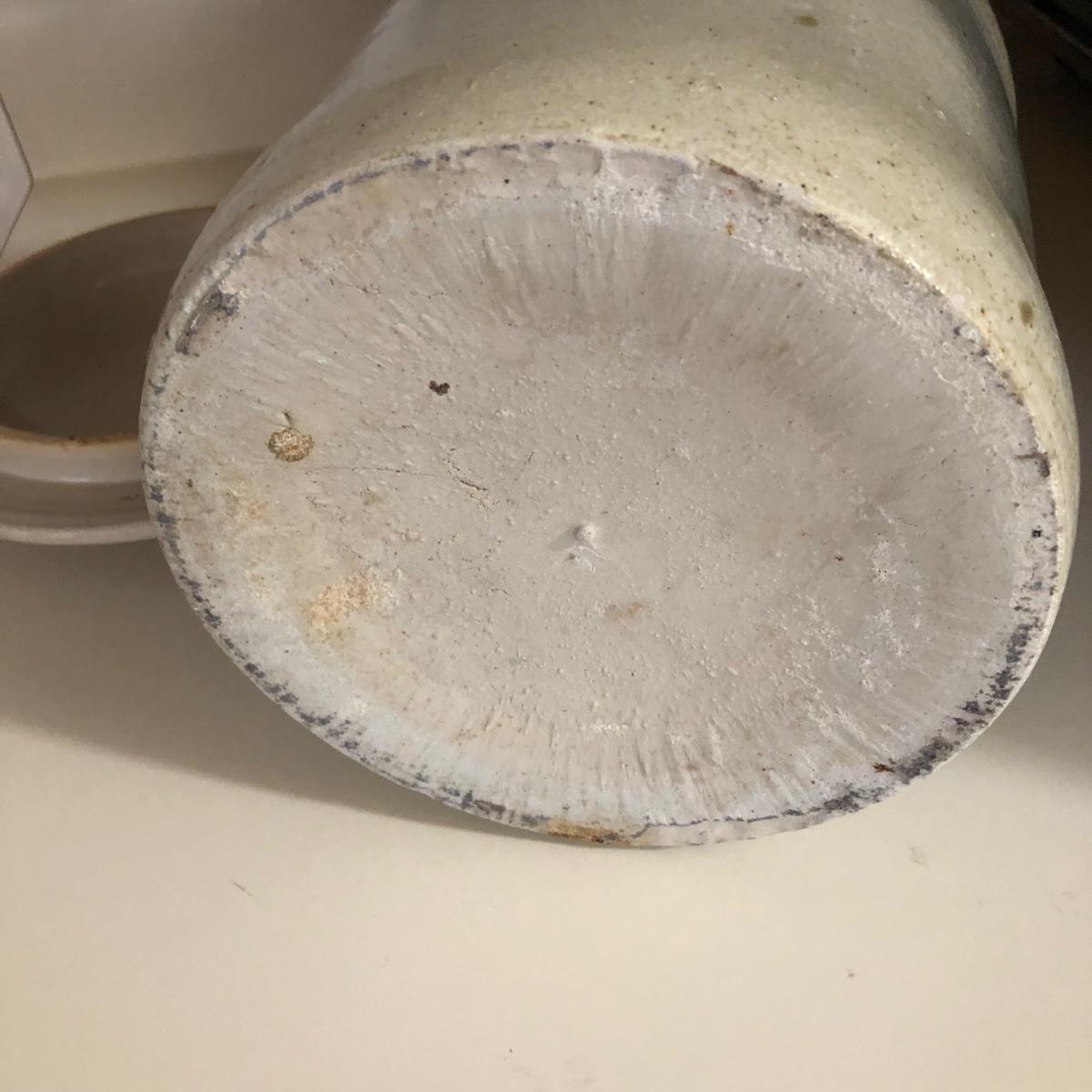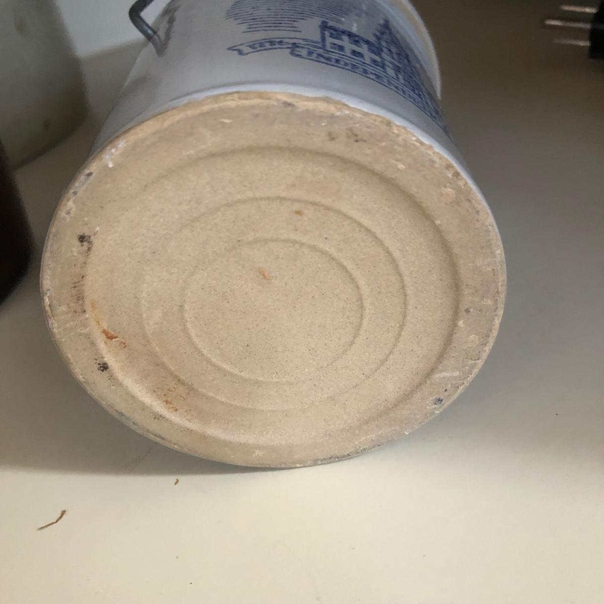 Three miscellaneous crocks. Large Stoneware Crock 8”HX8”D, has a crack on lid. Brown McCoy Crock measures 5”HX6”D and blue and white crock has metal lid press but seal is missing. Shipping available.