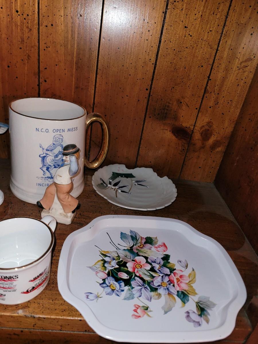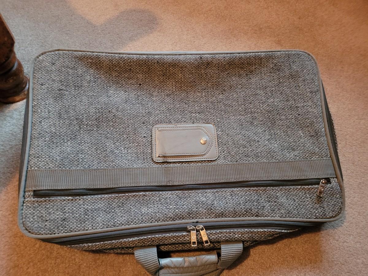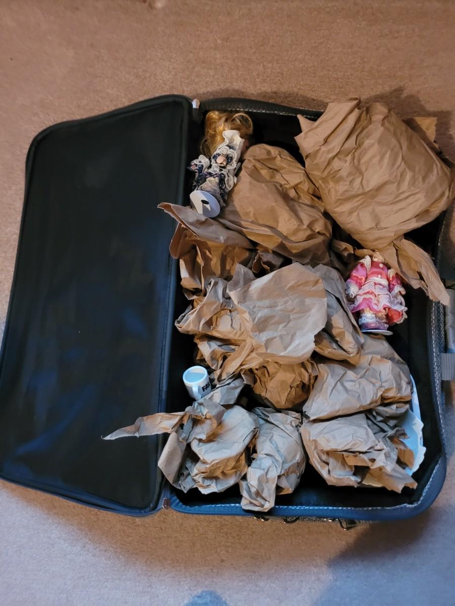 Collection of ceramics in a vintage Samsonite carry on bag