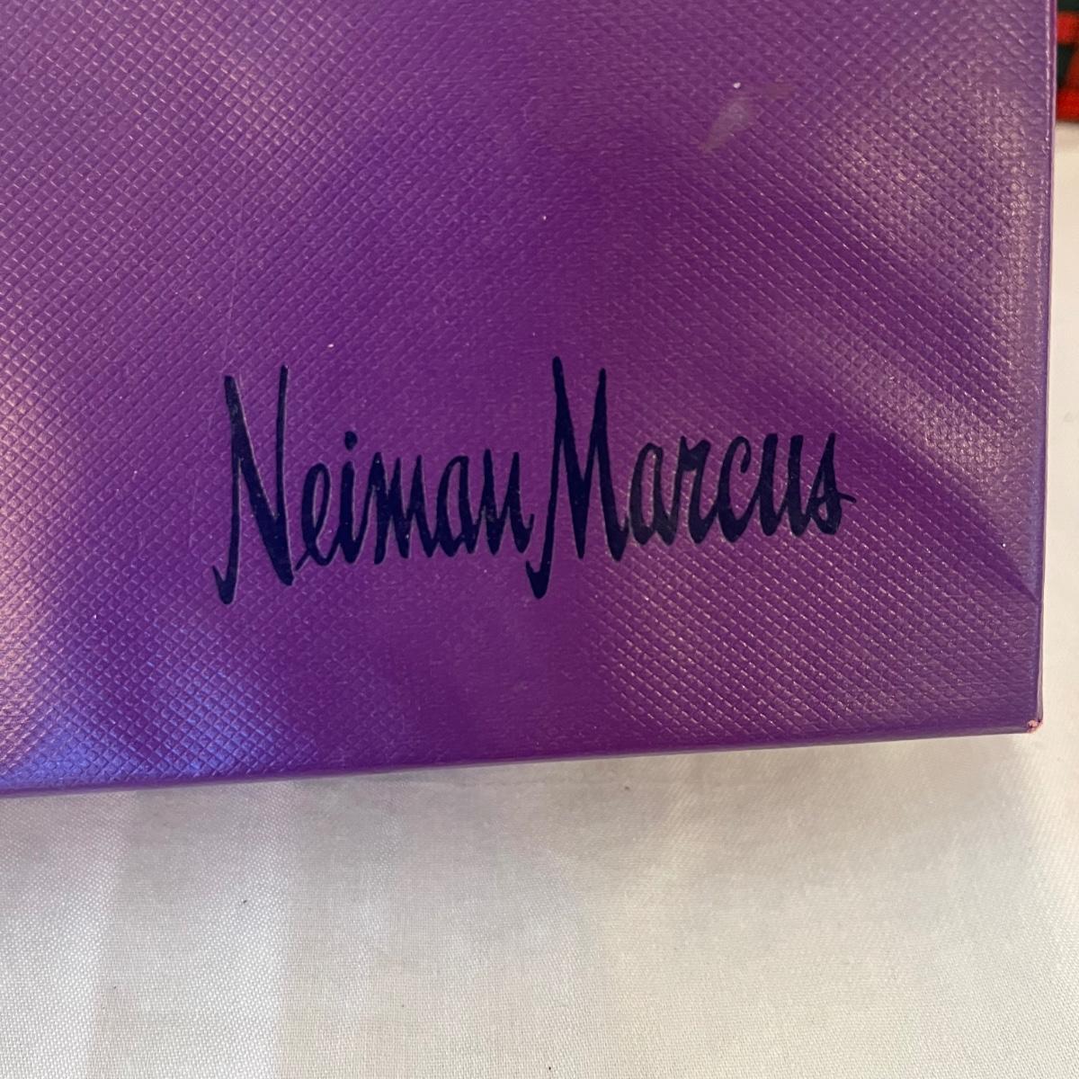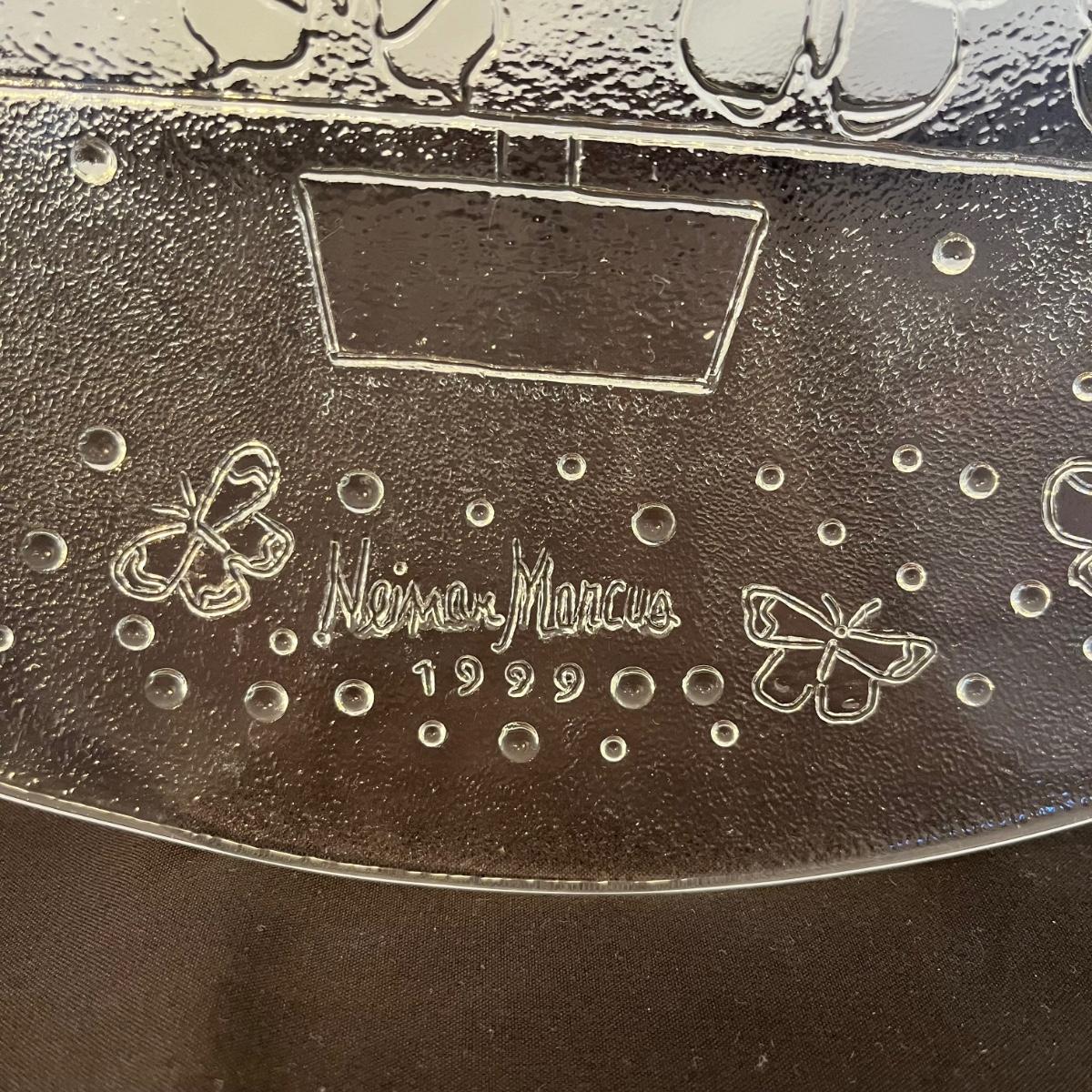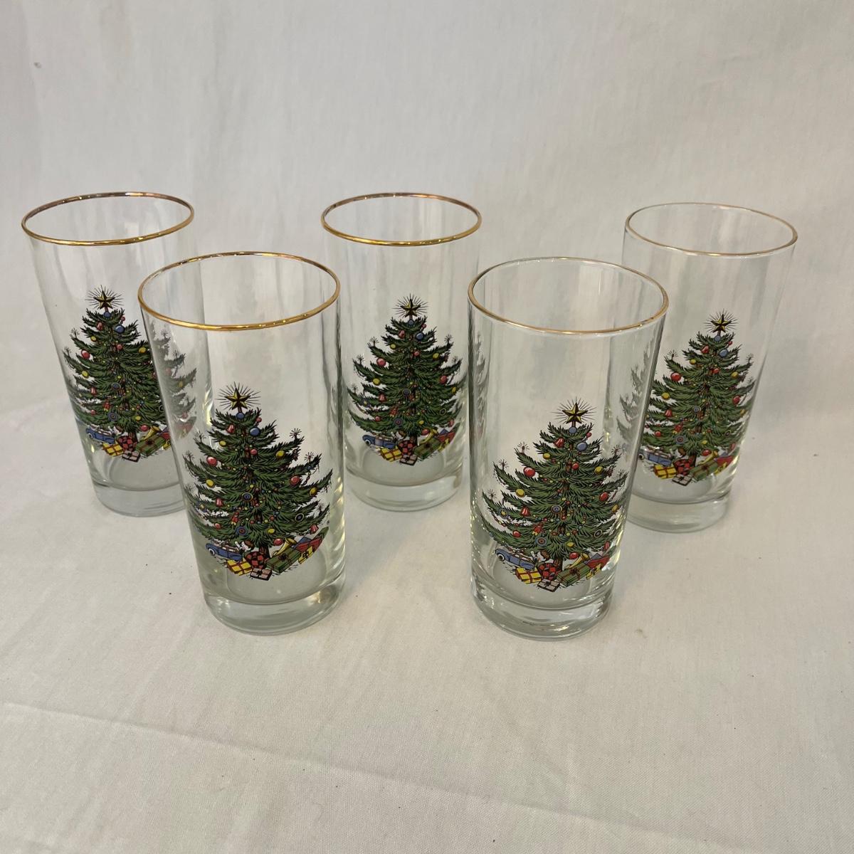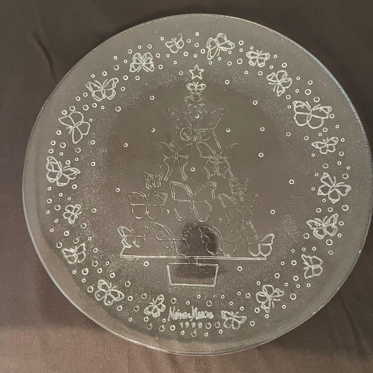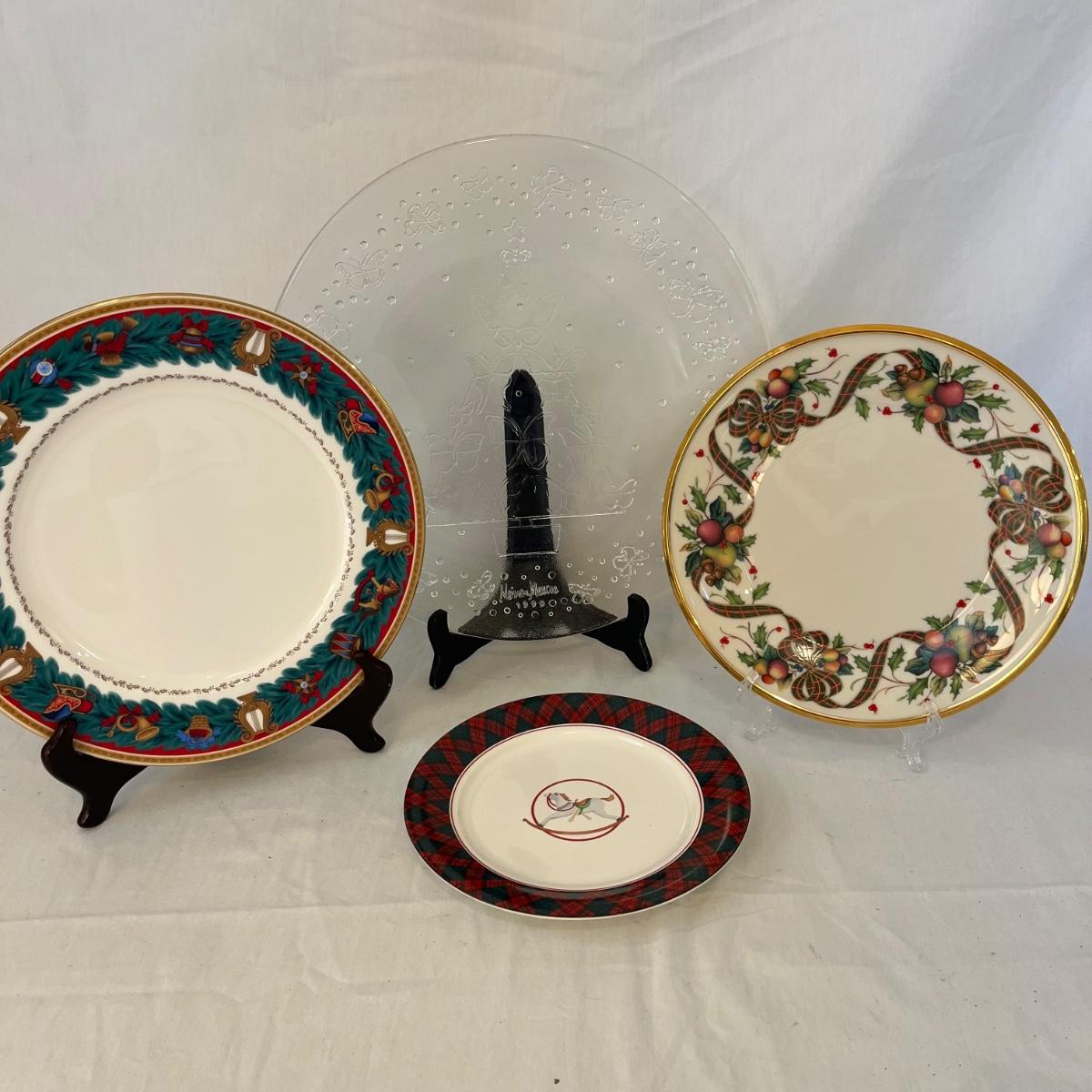 This lot includes a variety of Christmas plates, glasses, platters and decorative items, including a five piece “Christmas Traditions” place setting of plates measuring 10.75”D by Nikko, five gold rimmed Christmas tree glasses measuring 2.75”D x 5.5”H and two serving plates. The largest being a clear glass platter with a Christmas tree design by Neiman Marcus, measuring 13”D.