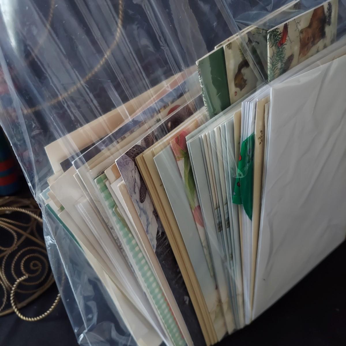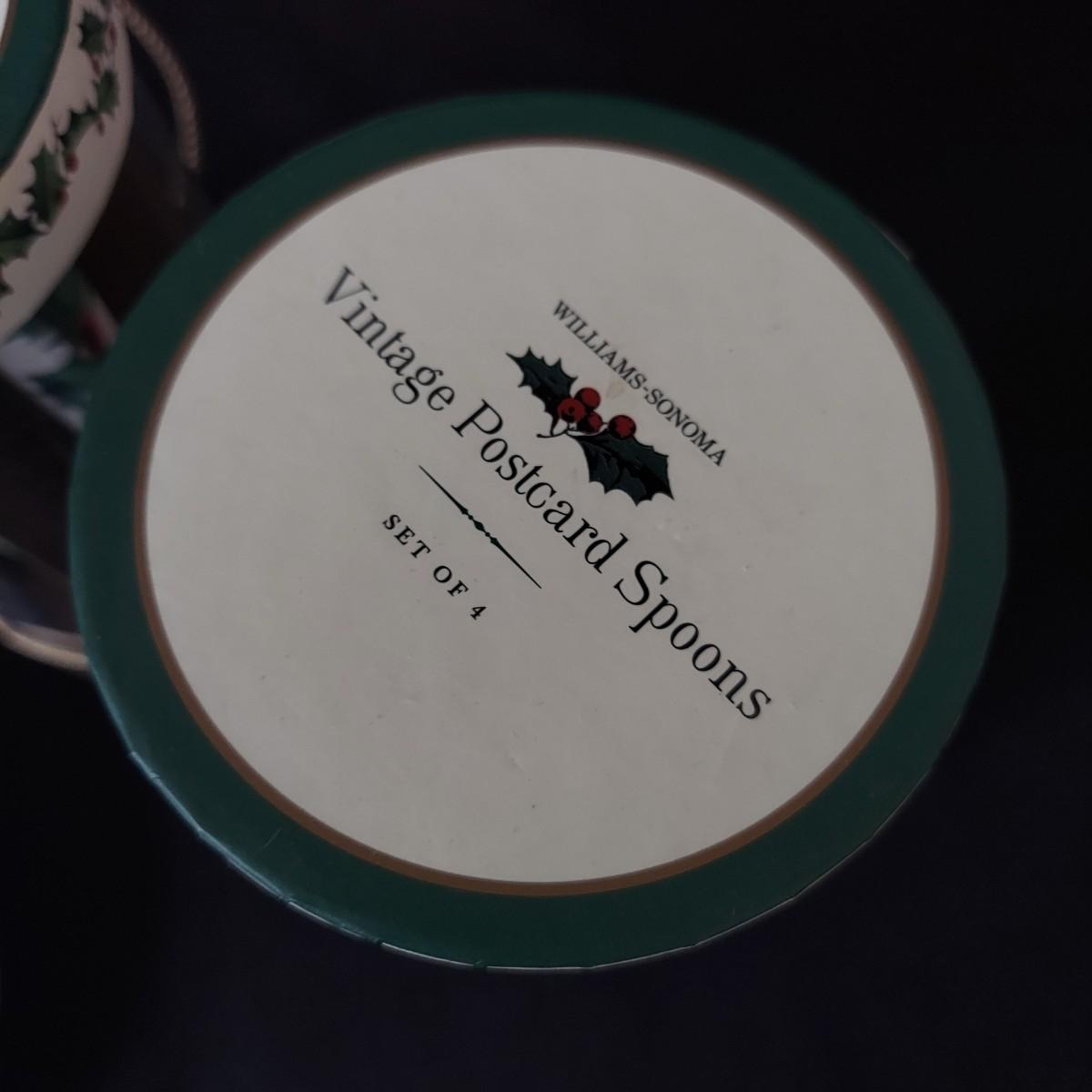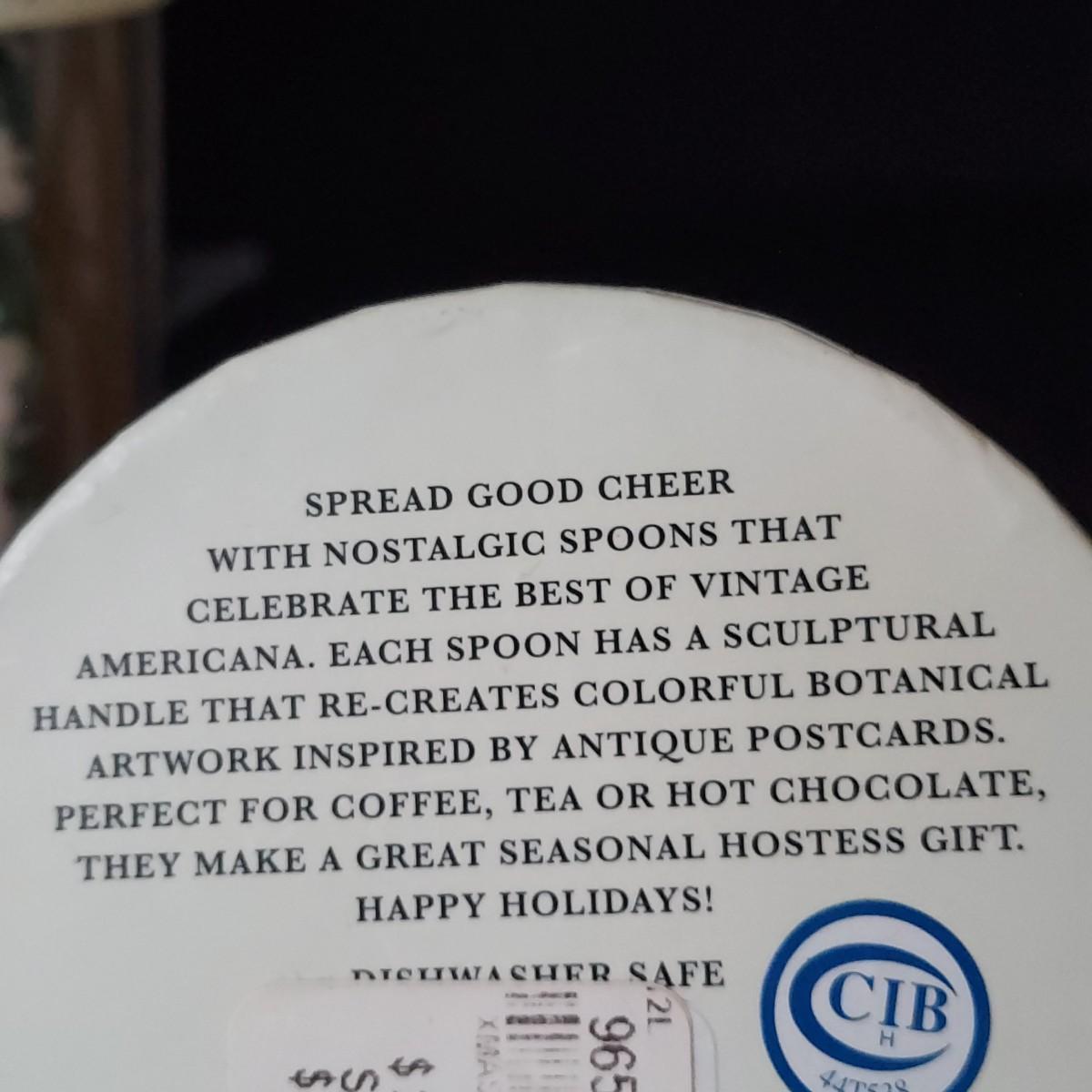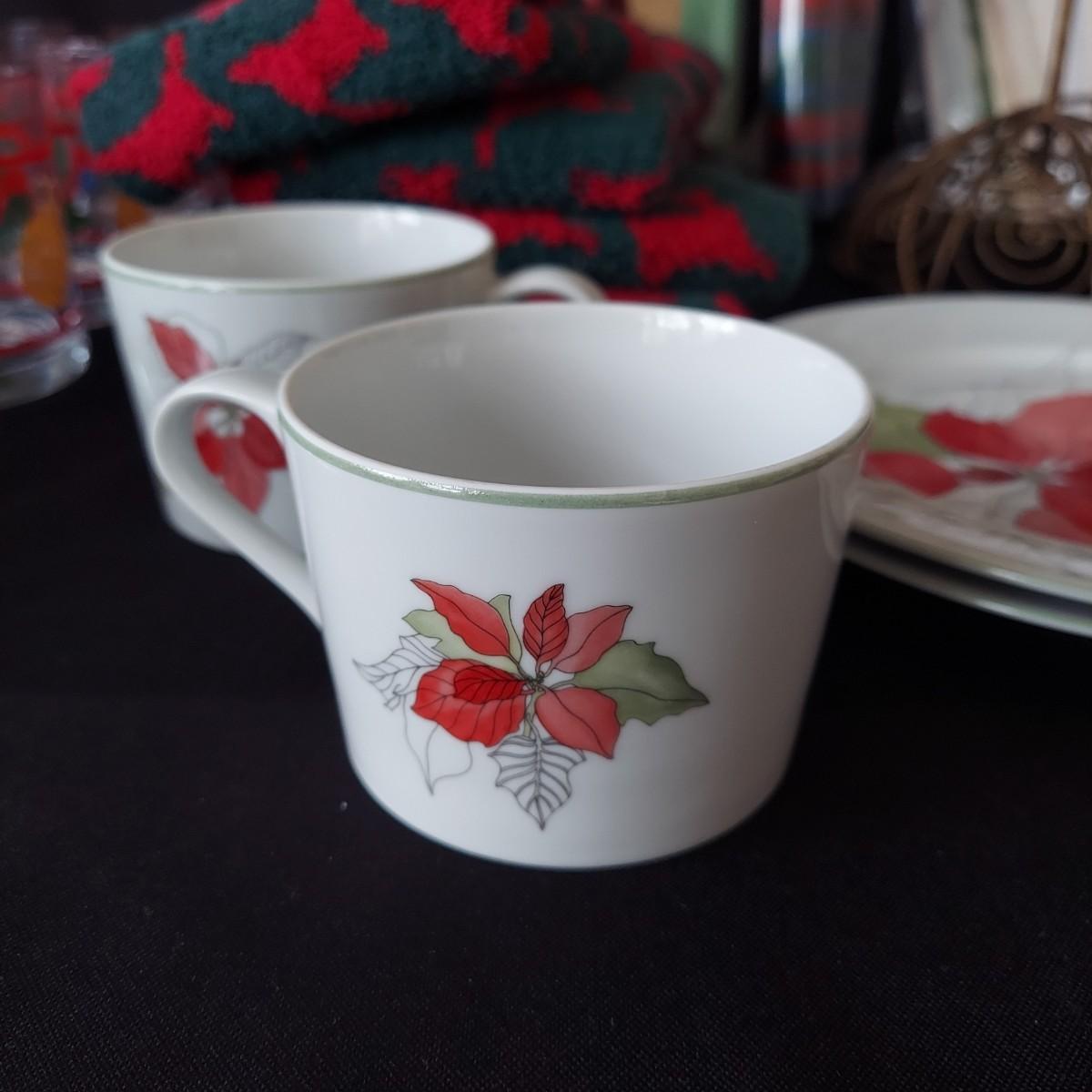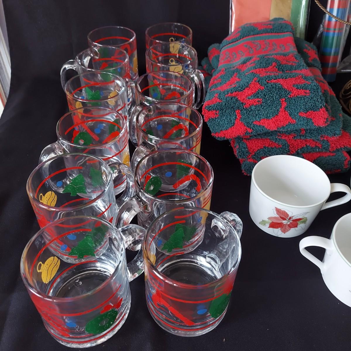 Includes ceramic spoons by Williams Sonoma, four pieces of China by Block Spal Portugal and 12 eggnog vintage glasses that appear to be by Libbe. Plus wrapping paper, cards and a metal card tree. Tree has a broken branch. Please see photos for details. Shipping available