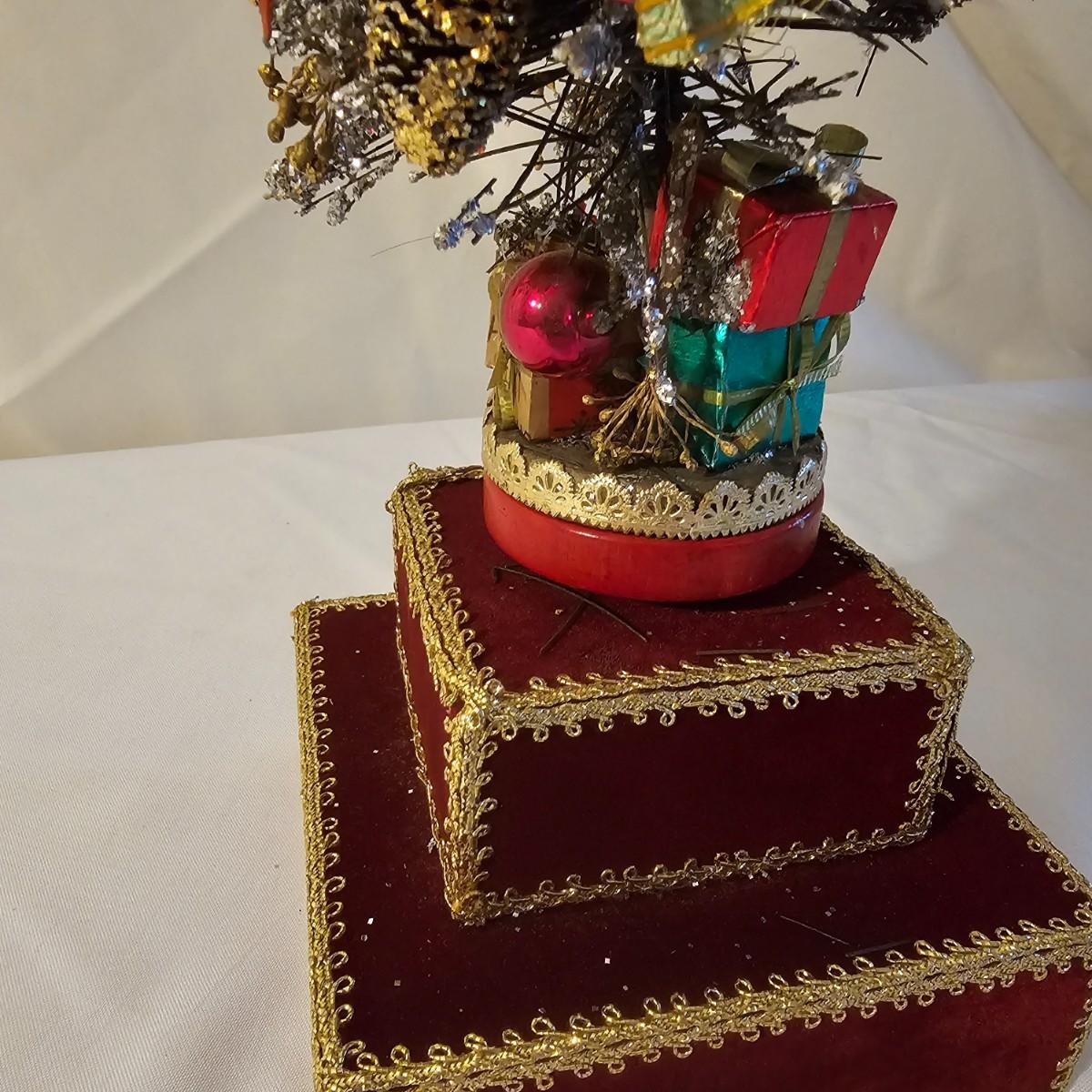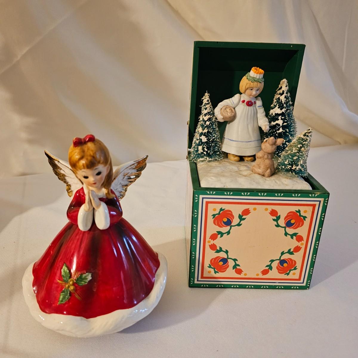 Four unique music boxes with Christmas themes. Decorative tree on package base is 6" x 6" x 15"H. Tree rotates to wind music box. Santa and sleigh is ceramic, measures 5" x 11" x 7"H. Angel is also ceramic, has twist base to wind, is 5" D x 6" H. Diorama box with bunny is by Enesco, measures 4.5" xc6" x 8"H. Wood with ceramic figures. See photos for details. Shipping available.