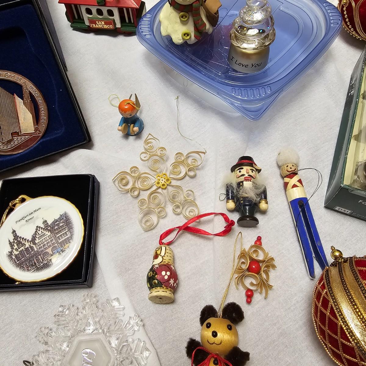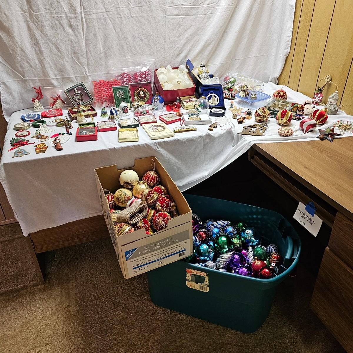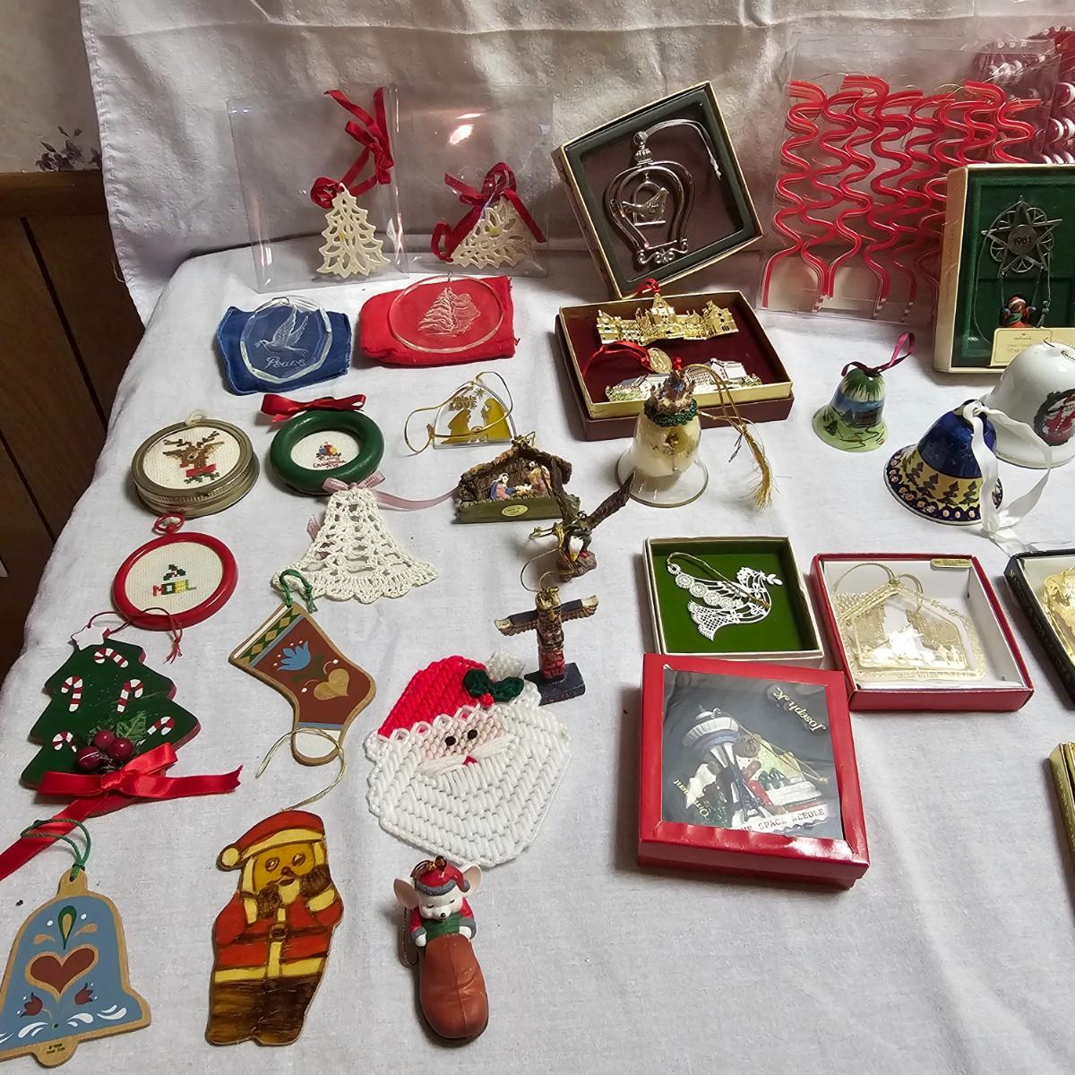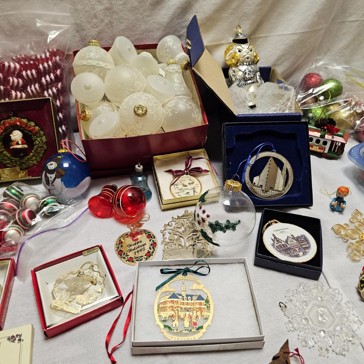 Lots and lots of unique ornaments. Some are older handmade style, painted, crochet, needlework. Others are metal, brass, plastic, resin, ceramic and more. Several destination commemoratives: the Capitol, Biltmore, Grove Park, Williamsburg, others. Also includes a large tub of plastic outdoor safe ornaments in a variety of shapes and colors. Includes a few vintage glass ornaments. See photos for details. Includes storage bins, local pickup only.