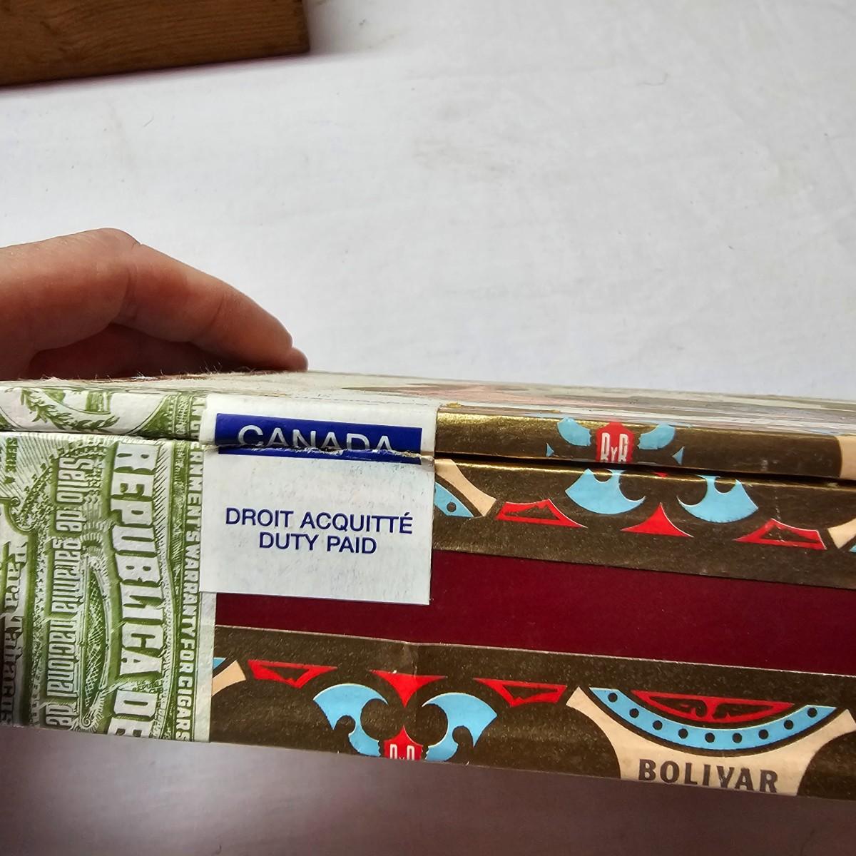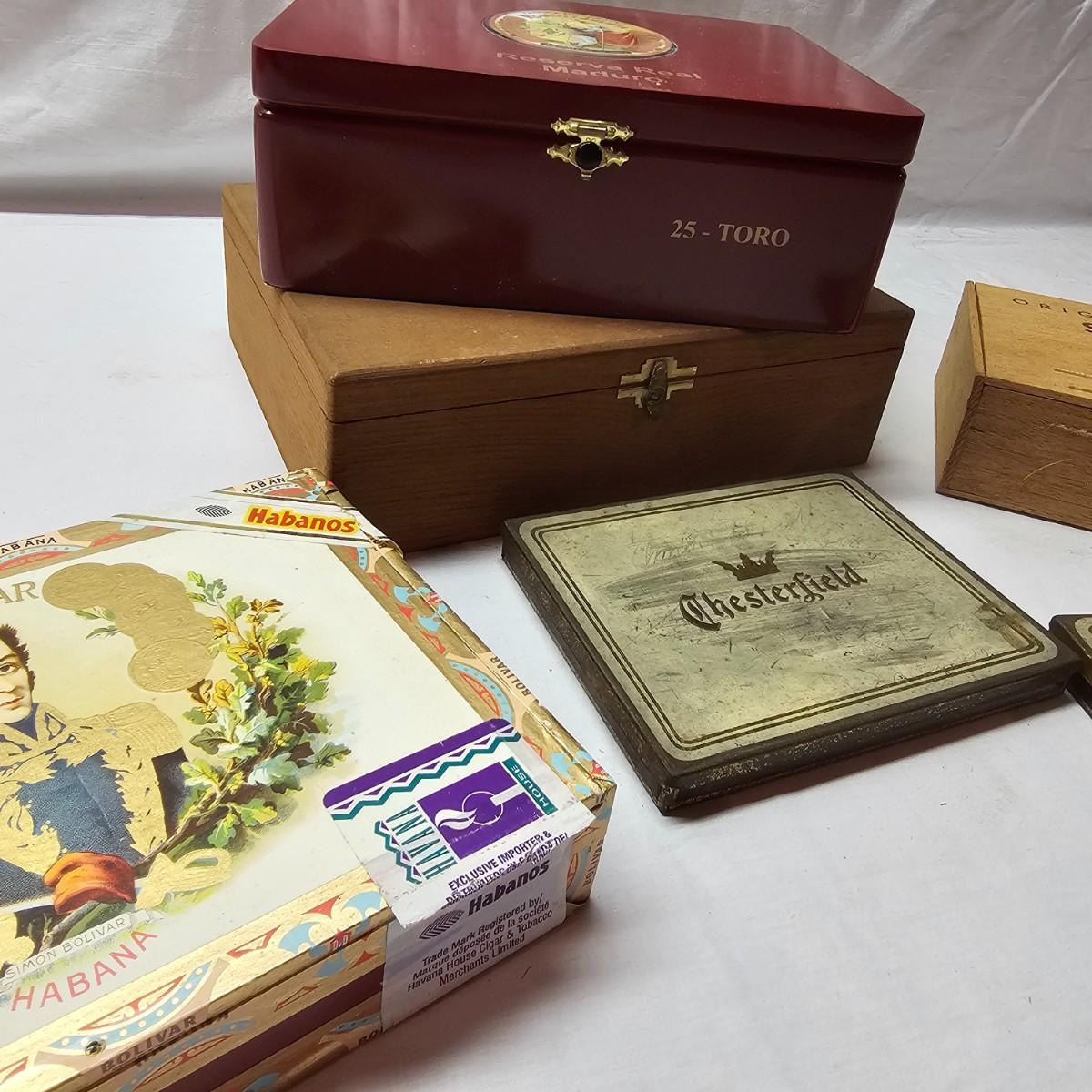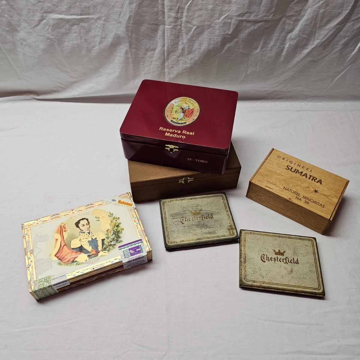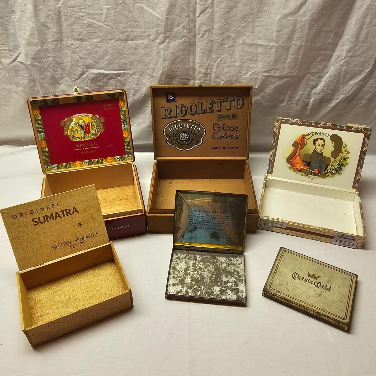 Six unique cigar and cigarette boxes with original advertising and some with duty stamps. Bolivar, Romeo & Julieta, Sumatra and others. The two Chesterfield items are similiar and are metal tins, 5.5" x 4.5" x .75"H. All other items are wood or paper. The Bolivar box is 8.25" x 5.5" x 1.5"H and the Reserva Maduro measures 8.5" x 7" x 3"H. See photos for details. Shipping available.