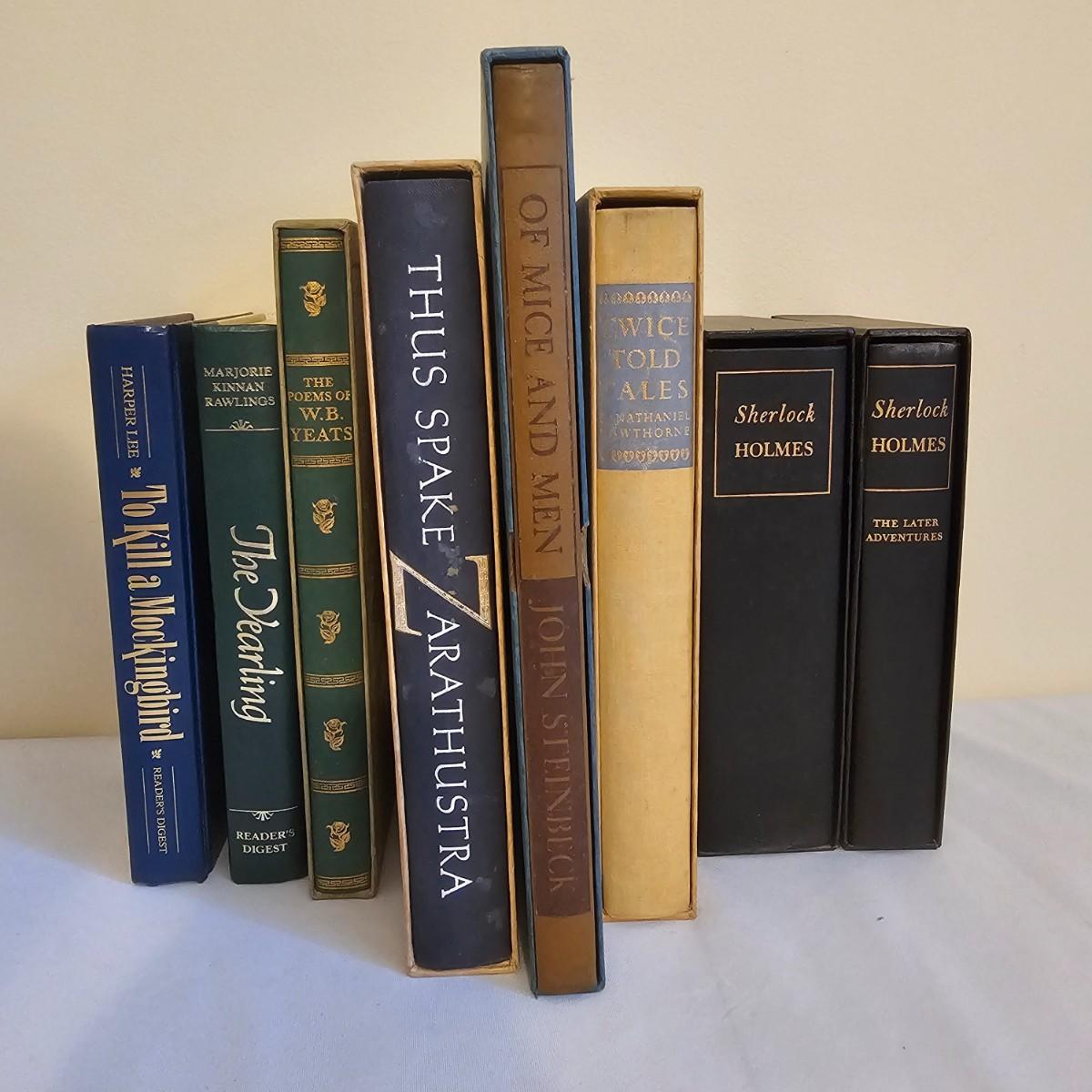 Seven of the great classic stories and poems in literature. Sherlock Holmes, Of Mice & Men and others included. All volumes are hardback, five of them have cover slipcases. The case for Thus Spake Zarathustra is stained and discolored. Each item has a commentary pamphlet with it. See photos for details. Shipping Available.