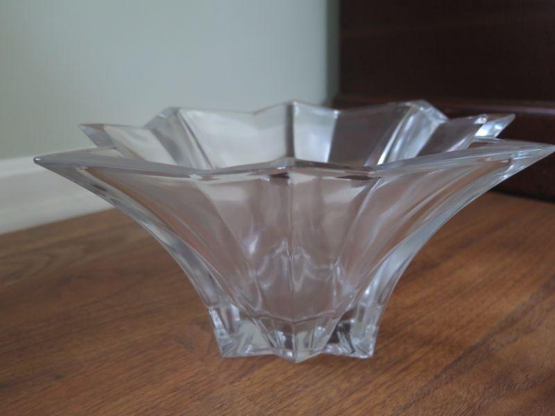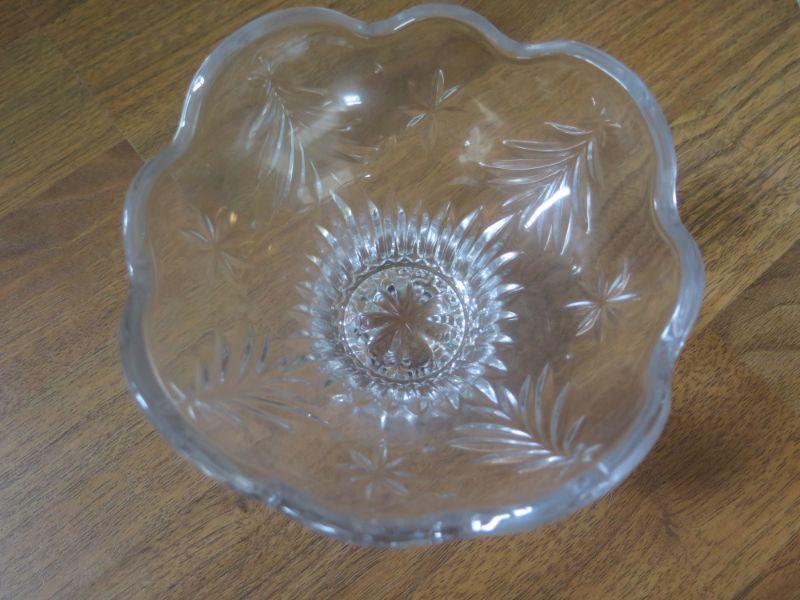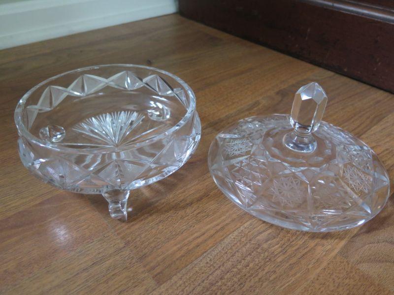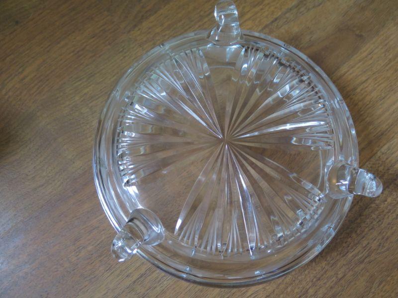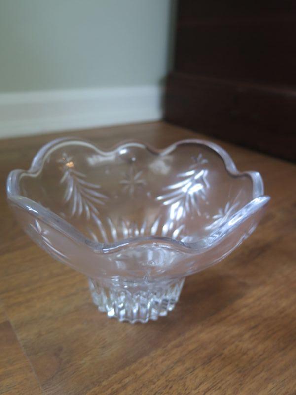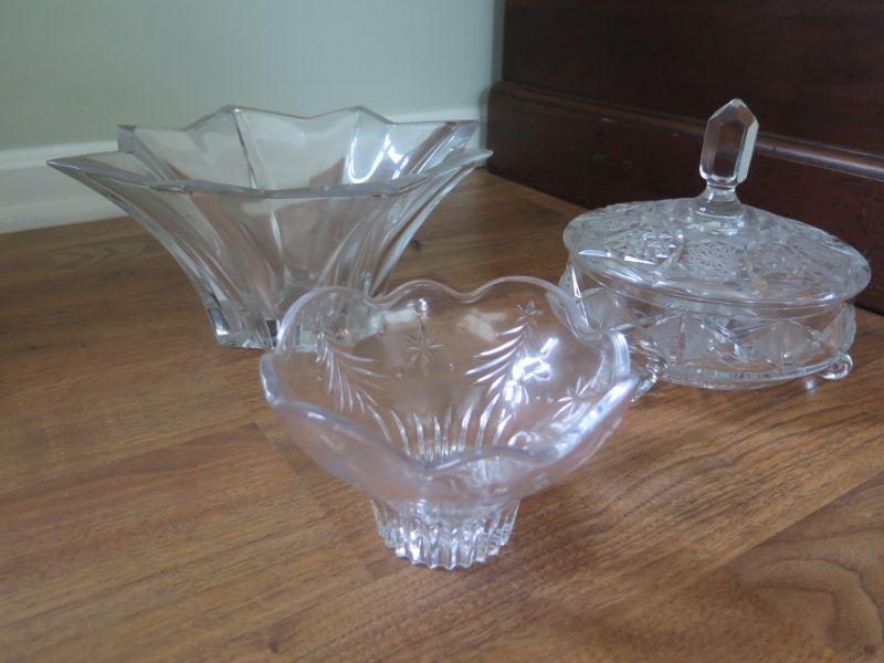 Three pieces of clear glass. Largest is 10" **Please read Terms and Conditions before placing a bid. Pick up is Sunday, September 1, 2019 from 10am to 4pm in Williamstown. All sales are final. All sales are as is, where is. Please review all photos. Any props included in photos are not included in listing. All measurements are approximate.