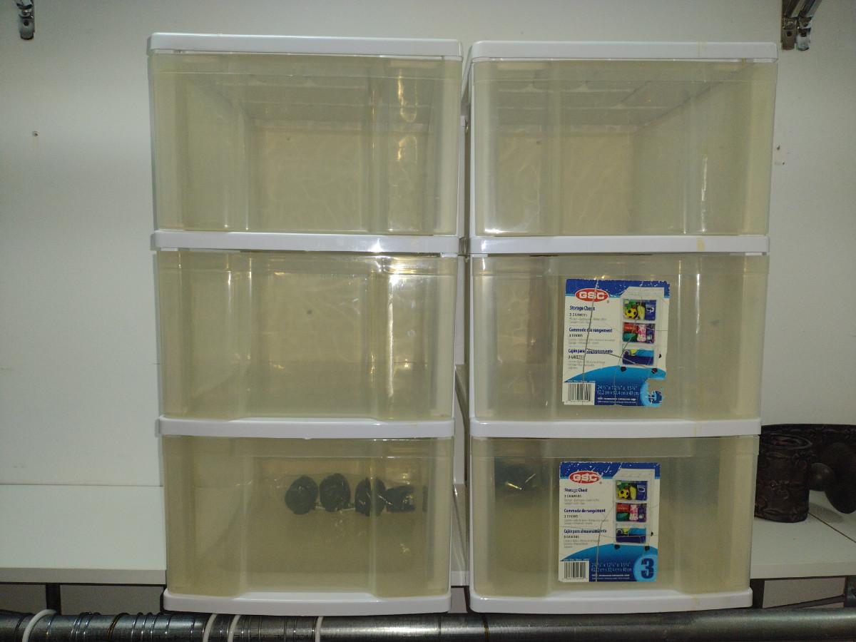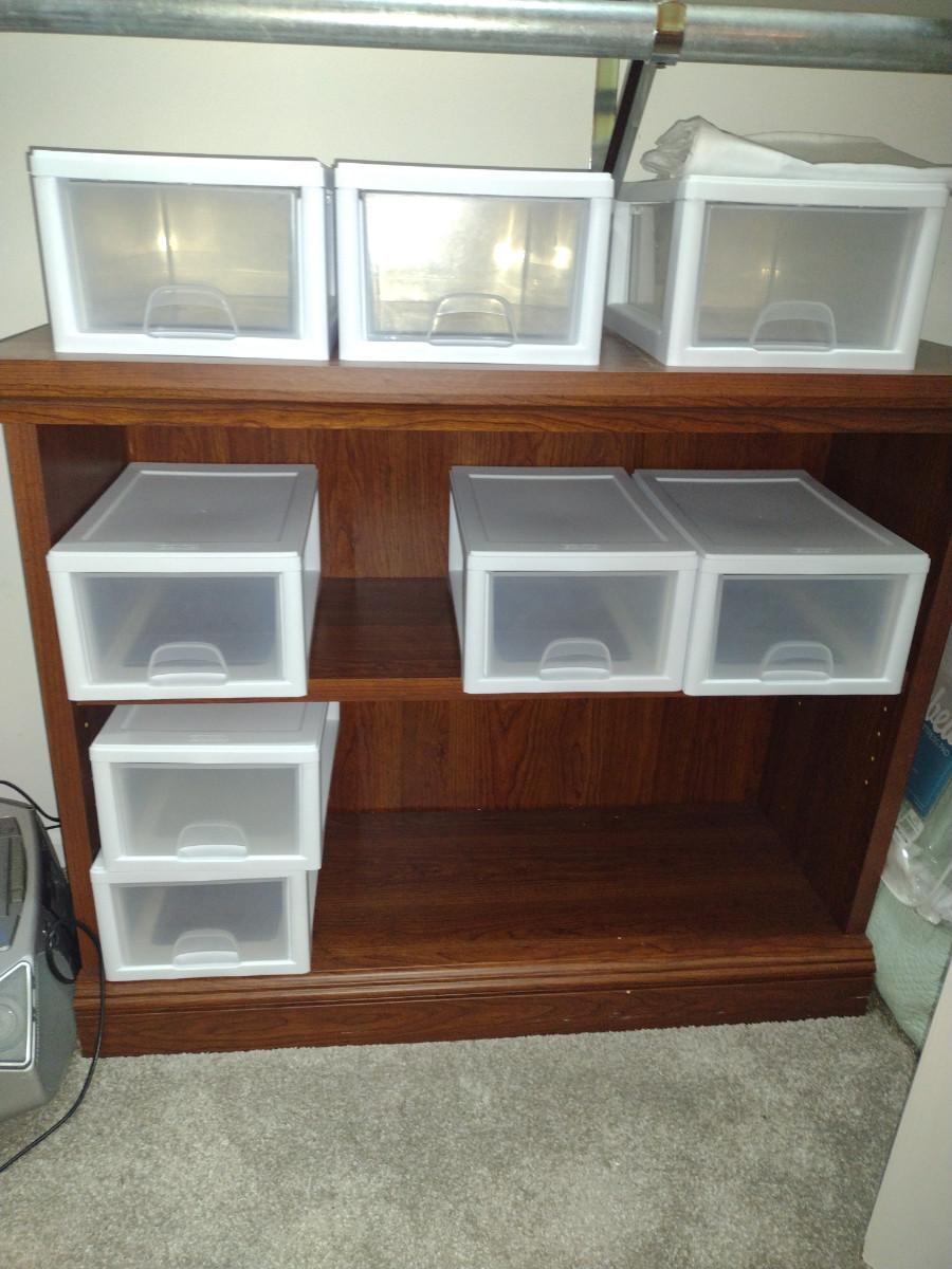 Collection of Closet Organizers. Stacked organizers have wheels for rolling.