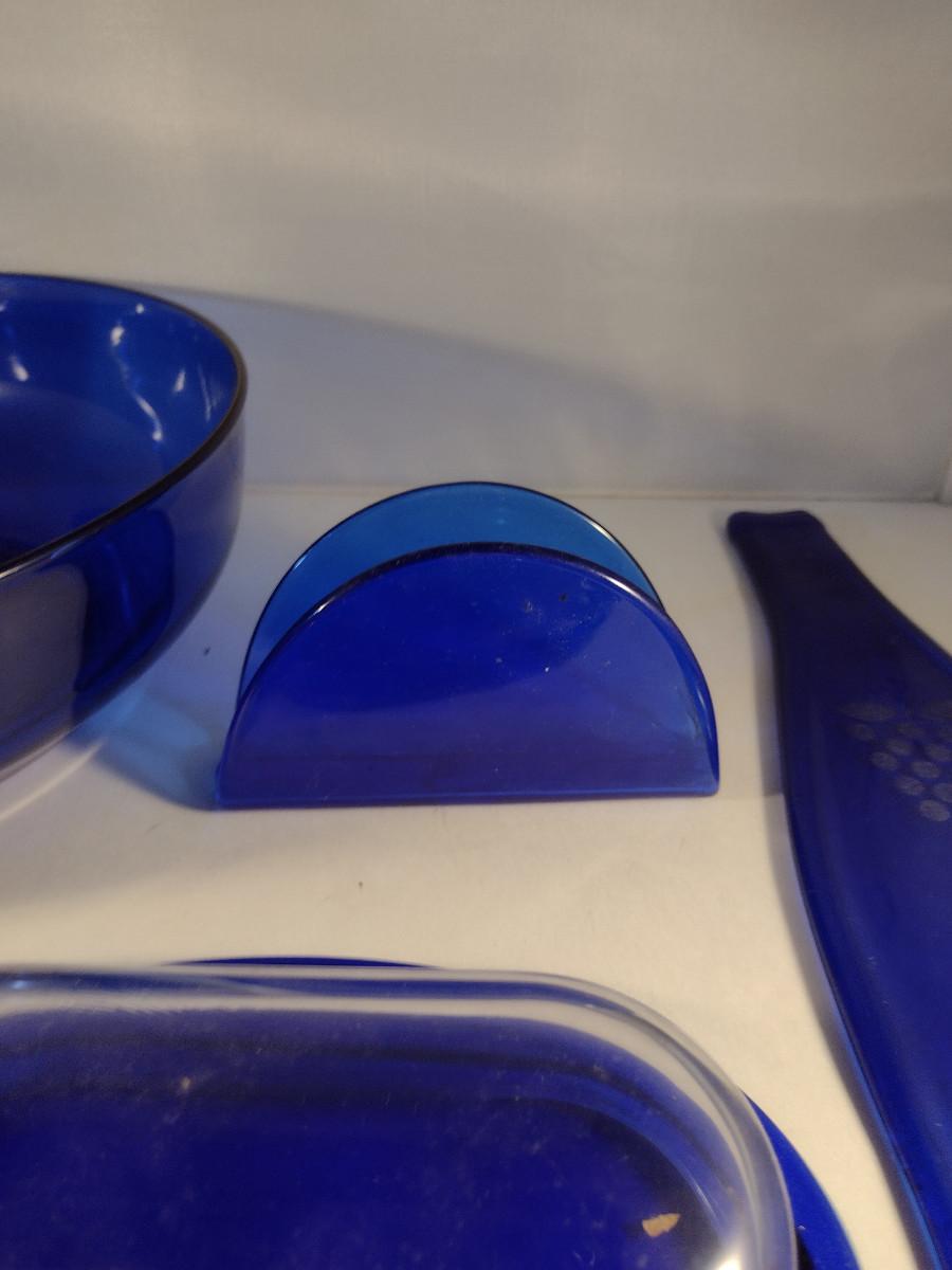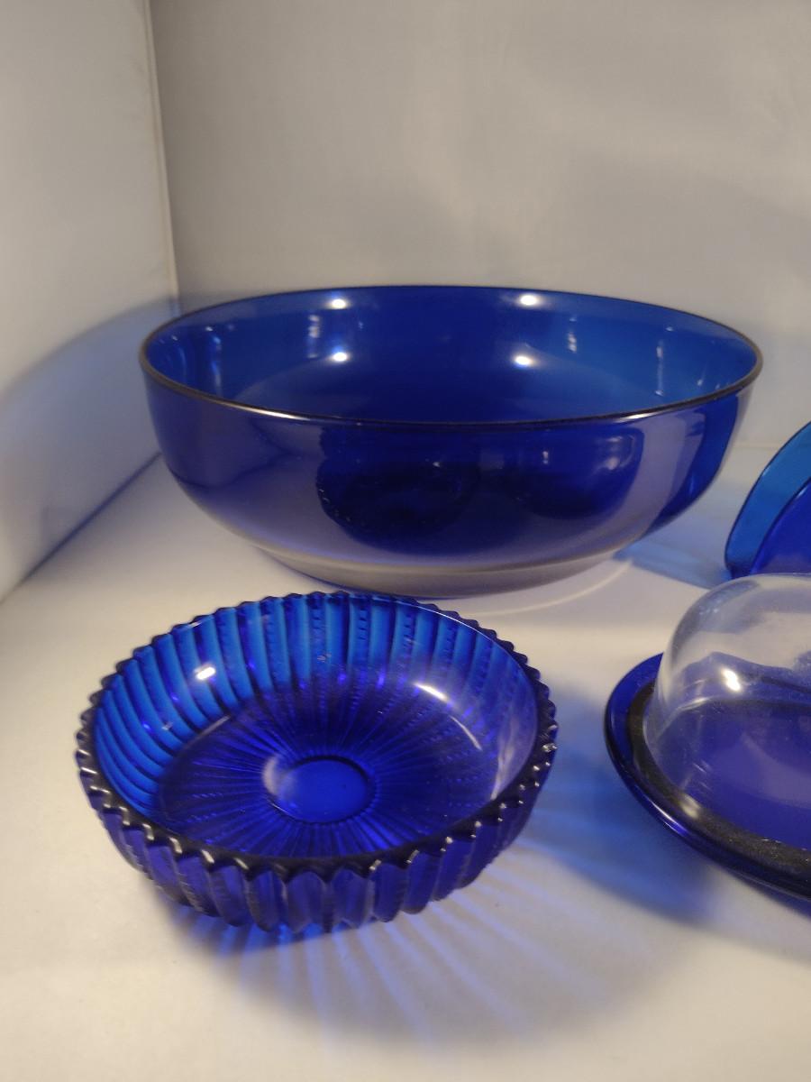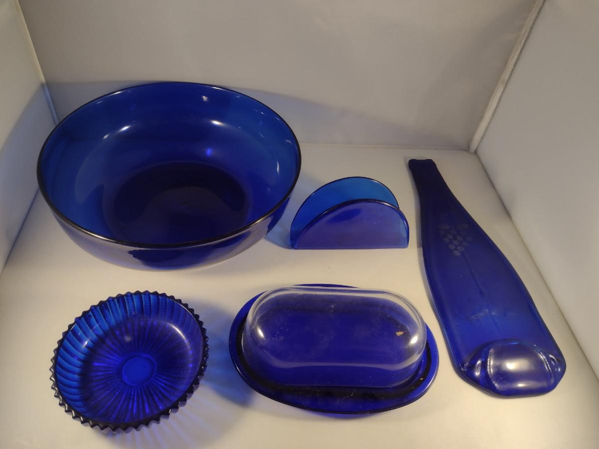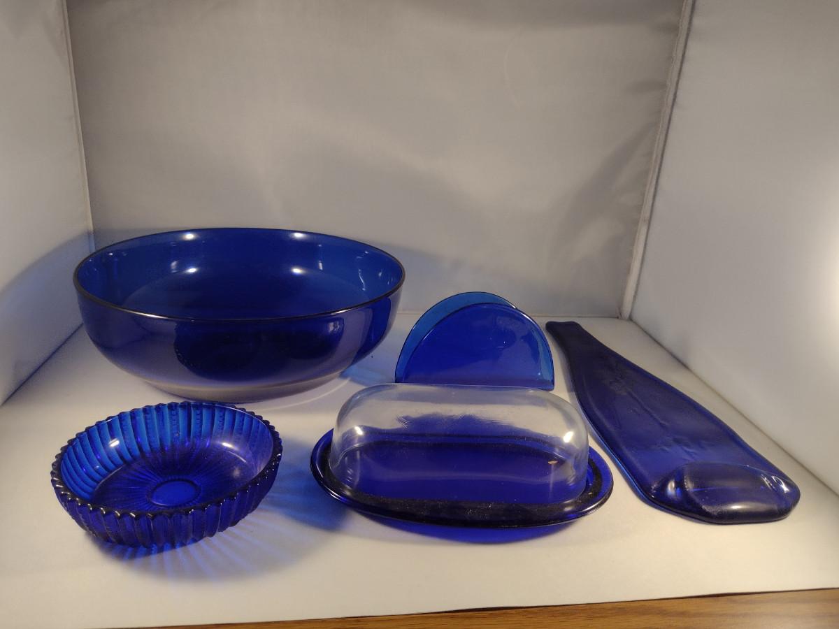 Collection of Cobalt Blue Glass Kitchen Ware- Bowls, Napkin Holder, Butter Dish, Spoon Rest