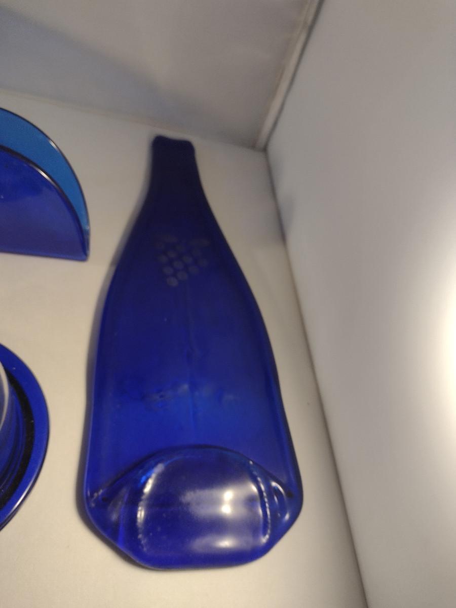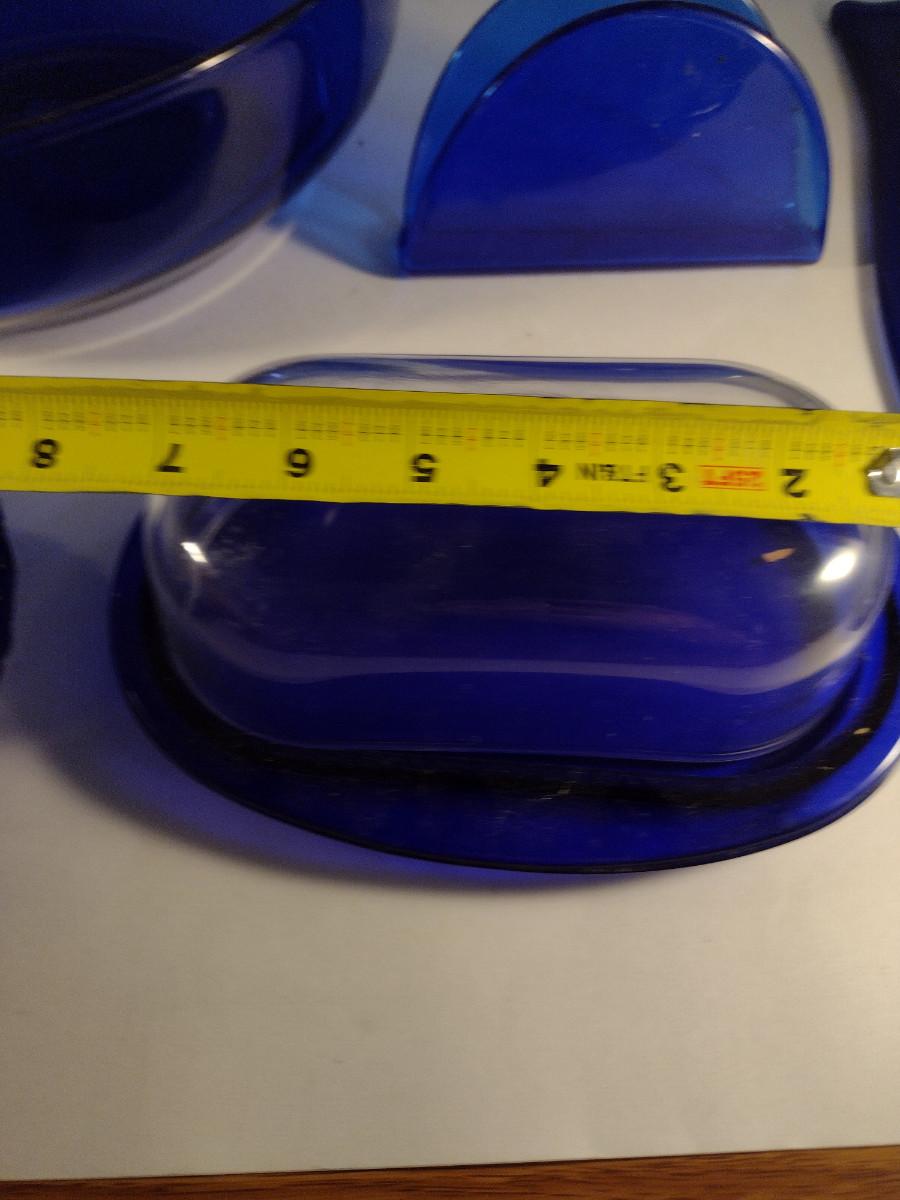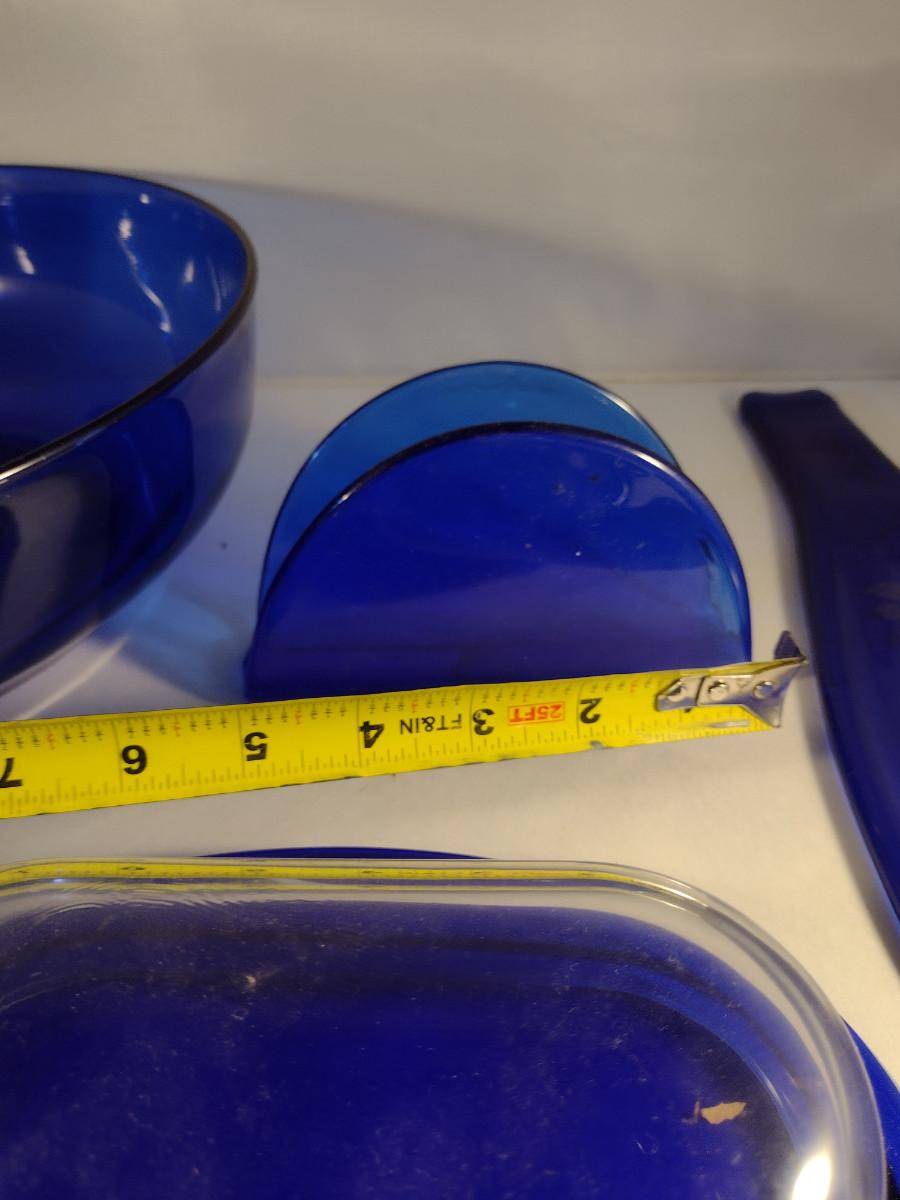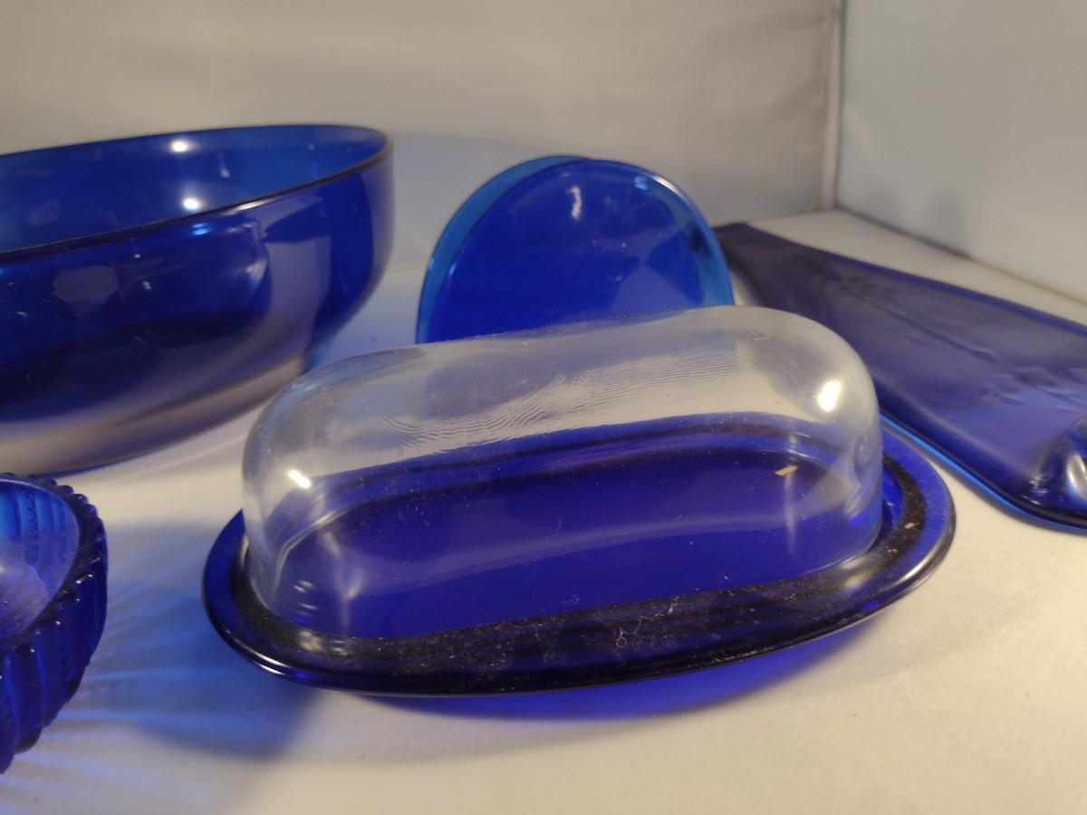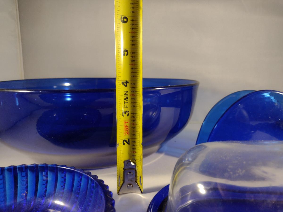 Collection of Cobalt Blue Glass Kitchen Ware- Bowls, Napkin Holder, Butter Dish, Spoon Rest