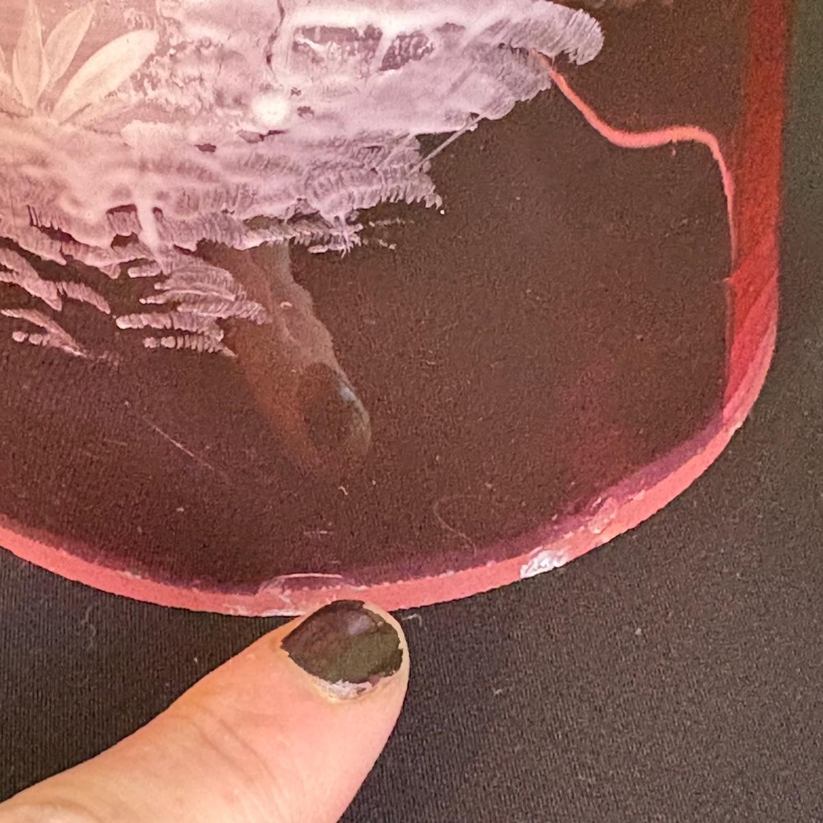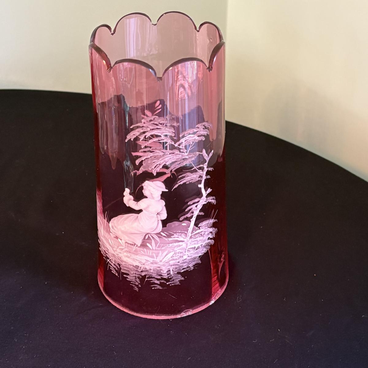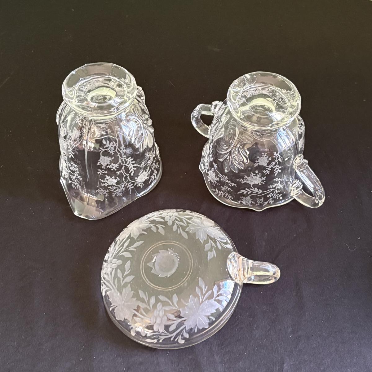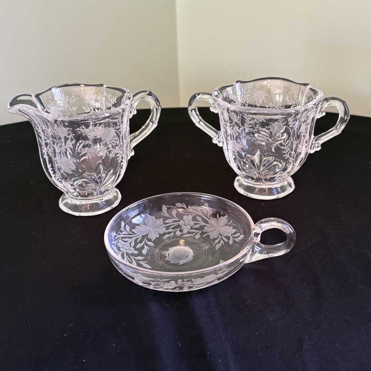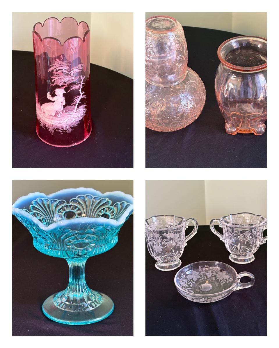 A seven piece set including a Fenton opalescent blue footed compote, a light pink depression-style etched vase and nightstand decanter/cup, a Fostoria cream and sugar set, Mary Gregory style cranberry glass with painted white enamel, and more. The measurements of the Fenton compote are approximately 5.5" x 5" x 5"H and the cranberry glass are 4.5"D x 8.5"H. The cranberry glass has blemishes in the base, see pictures for reference.