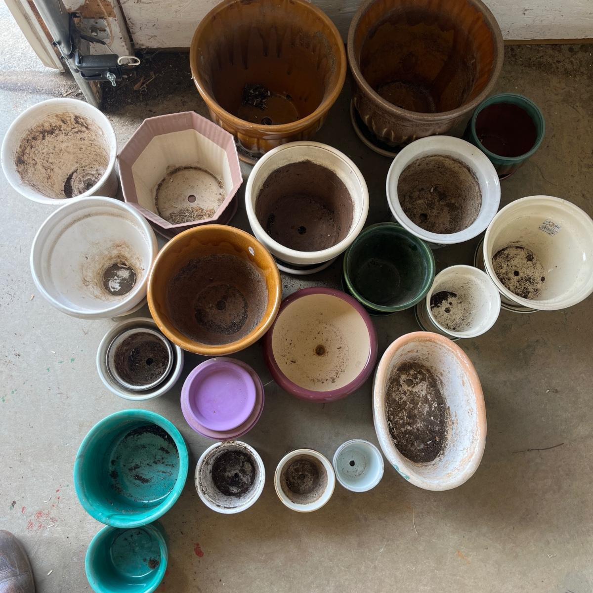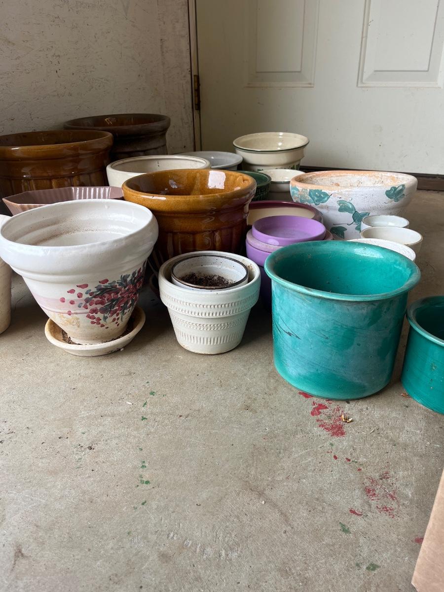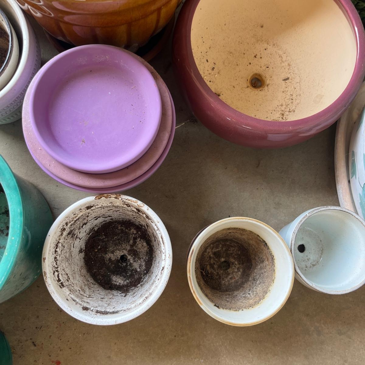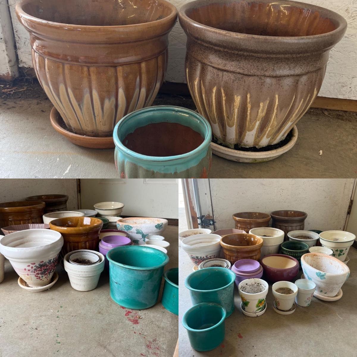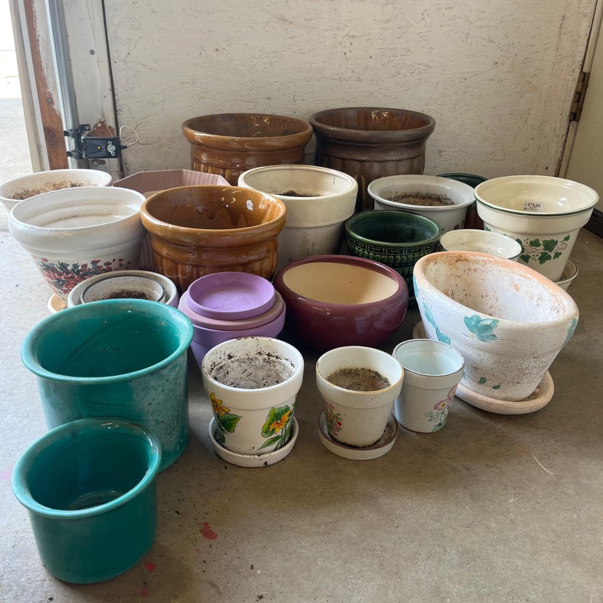 Lot includes over 20 colorful ceramic pots in a variety of sizes and styles. Largest pot measures 10”D x 9”H.