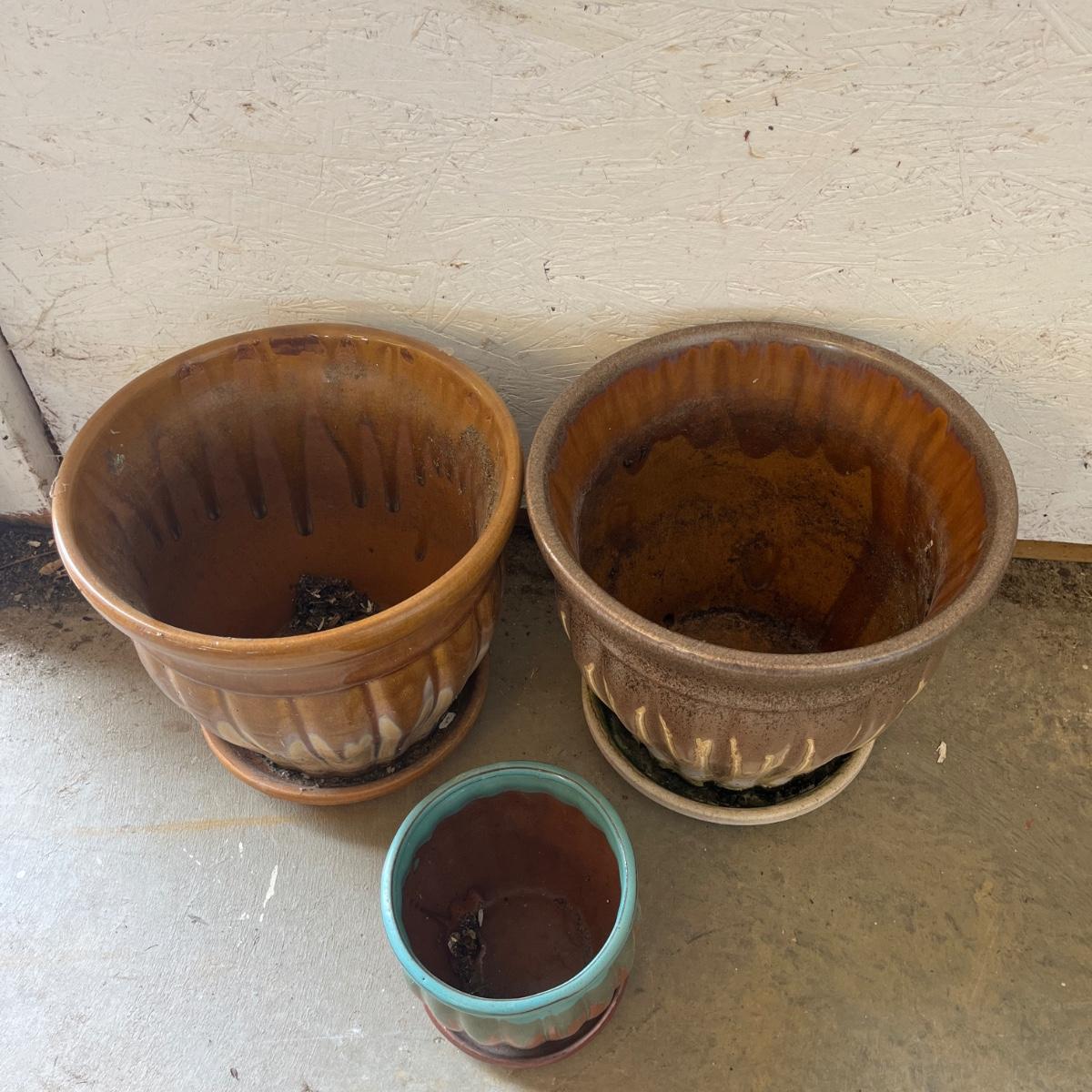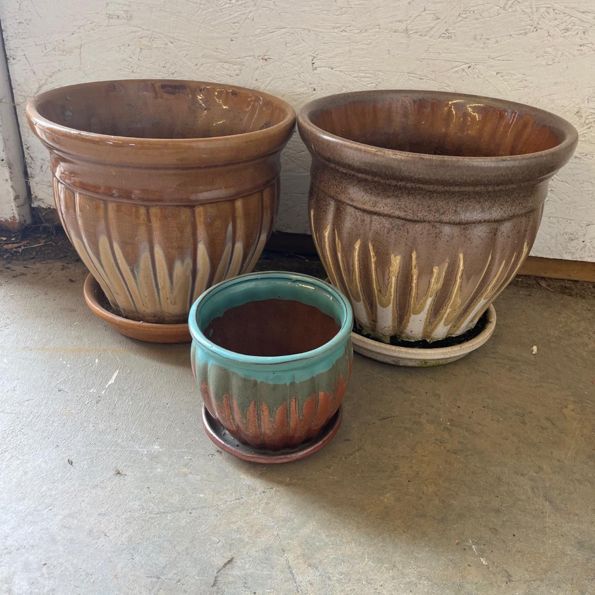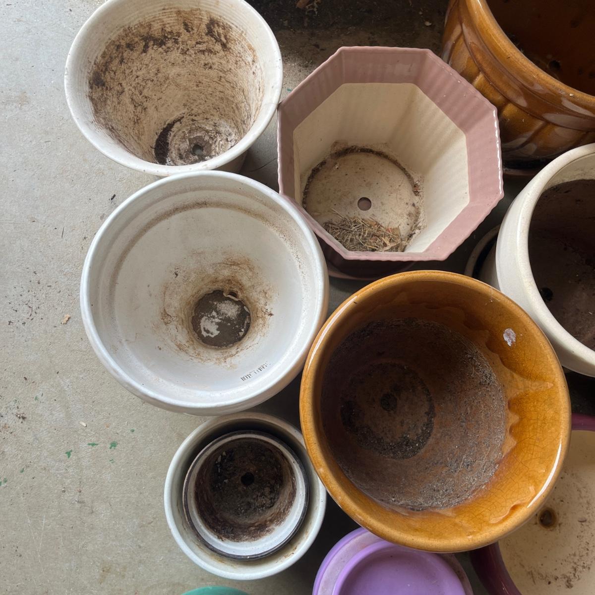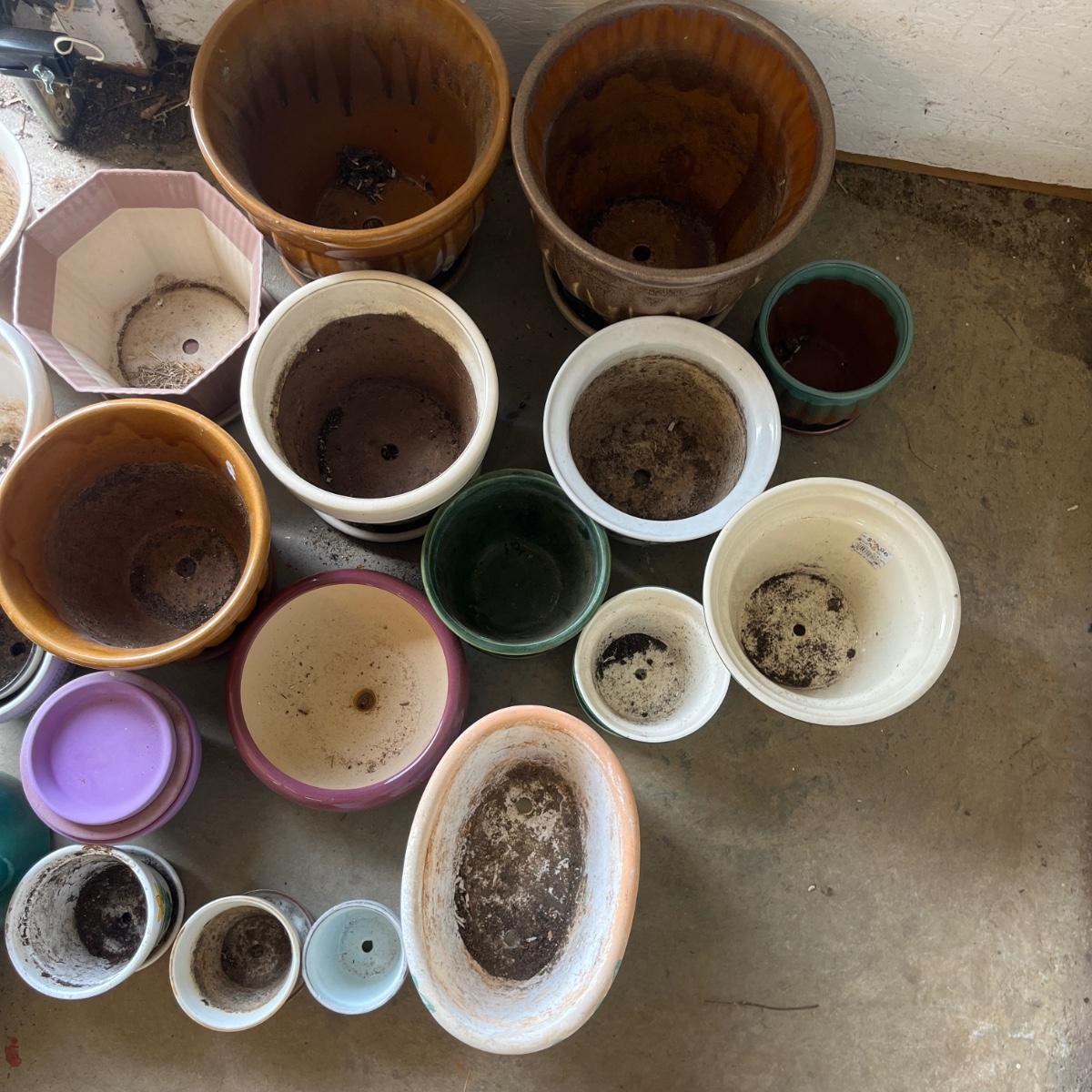 Lot includes over 20 colorful ceramic pots in a variety of sizes and styles. Largest pot measures 10”D x 9”H.